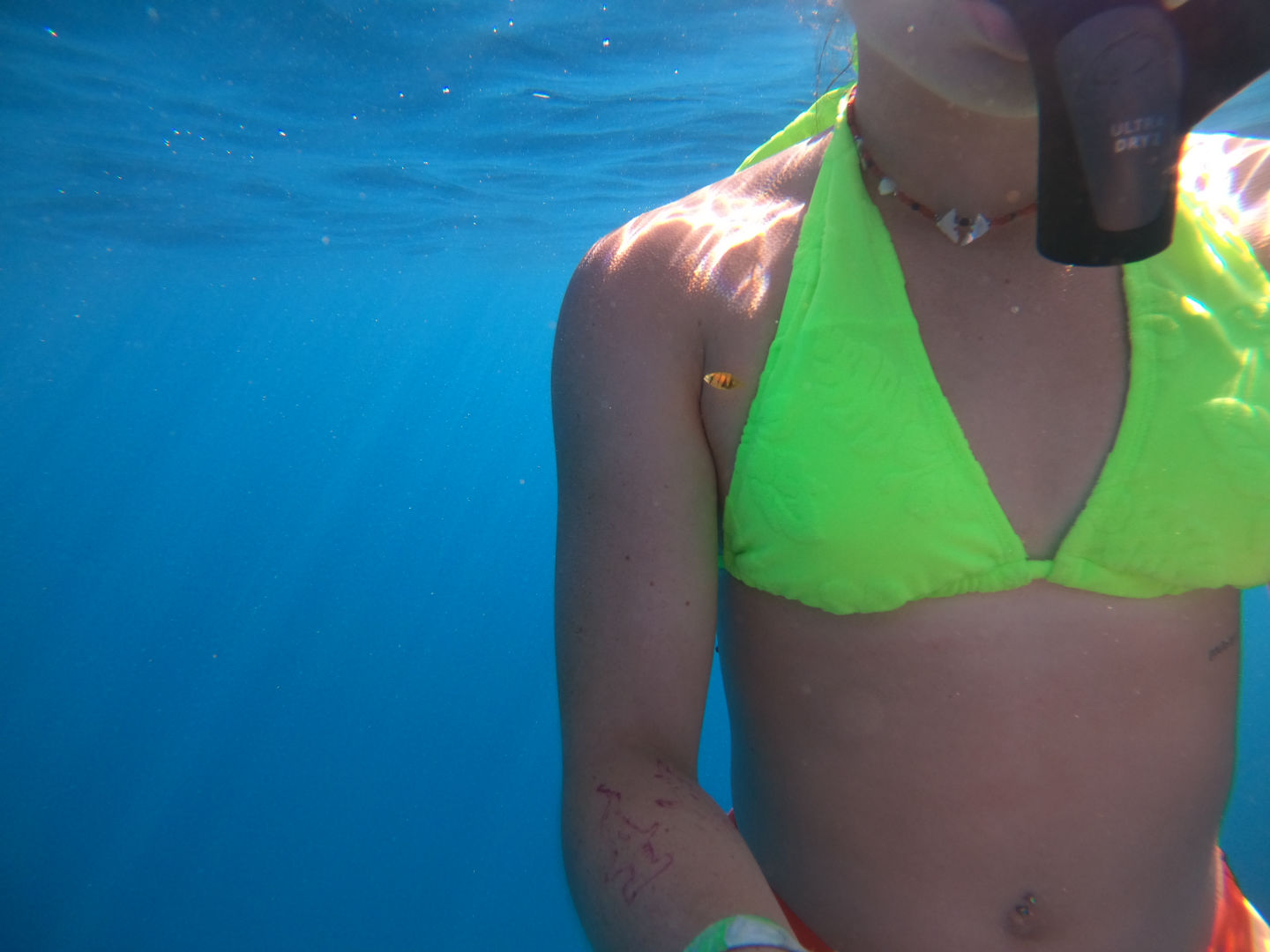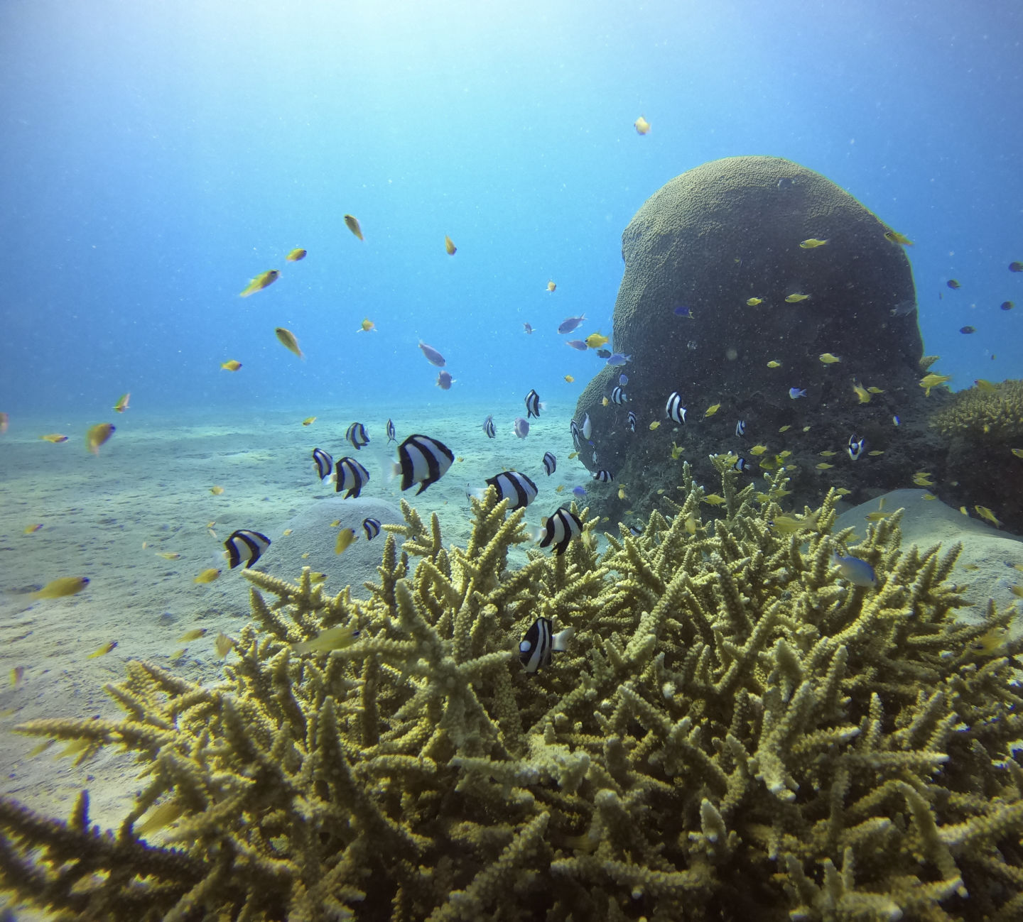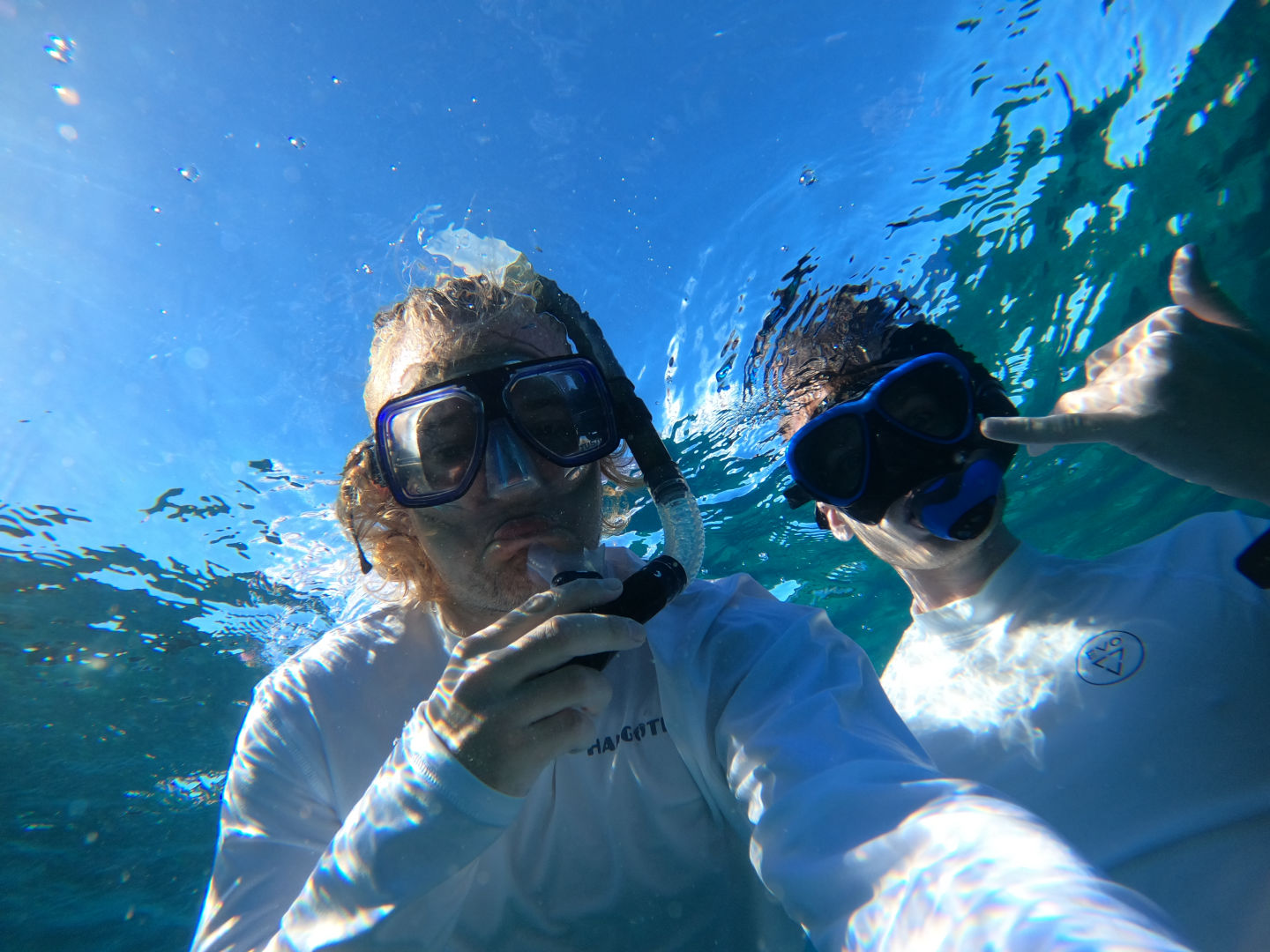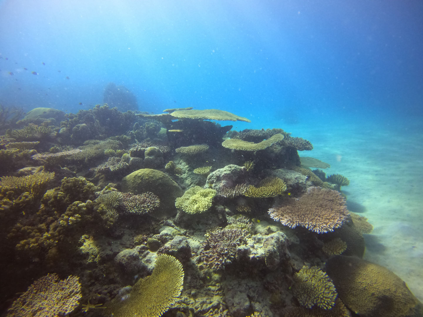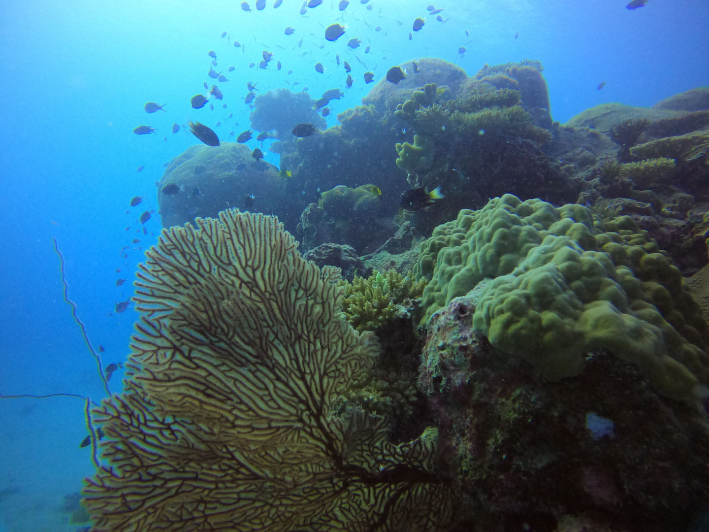 We got back to the boat and had a delicious lunch waiting for us. After breaking down our gear and cleaning up, we got ready to snorkel the manta pass. This is a shallow, narrow pass with a nutrient-rich current where mantas often come to feed. We were all really hoping to see a manta here, but unfortunately, today was not the day. We did, however, still have an incredible experience snorkeling the pass with all the incredible corals and, honestly, the biggest schools of reef fish I’ve ever seen. There was a good current kicking even as we entered the pass right around high tide. We all drifted along one by one, just watching all the fish dance along below us. Sierra and Dray had two cute little pilot fish decide to follow them along, which was adorable. Margaret was in the water near me and pointed out another white tip reef shark just peacefully cruising along the bottom. It sure is neat watching them glide around seemingly so effortlessly.