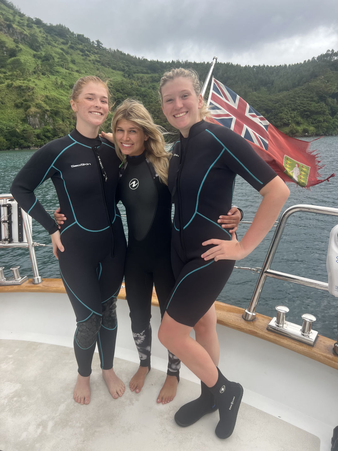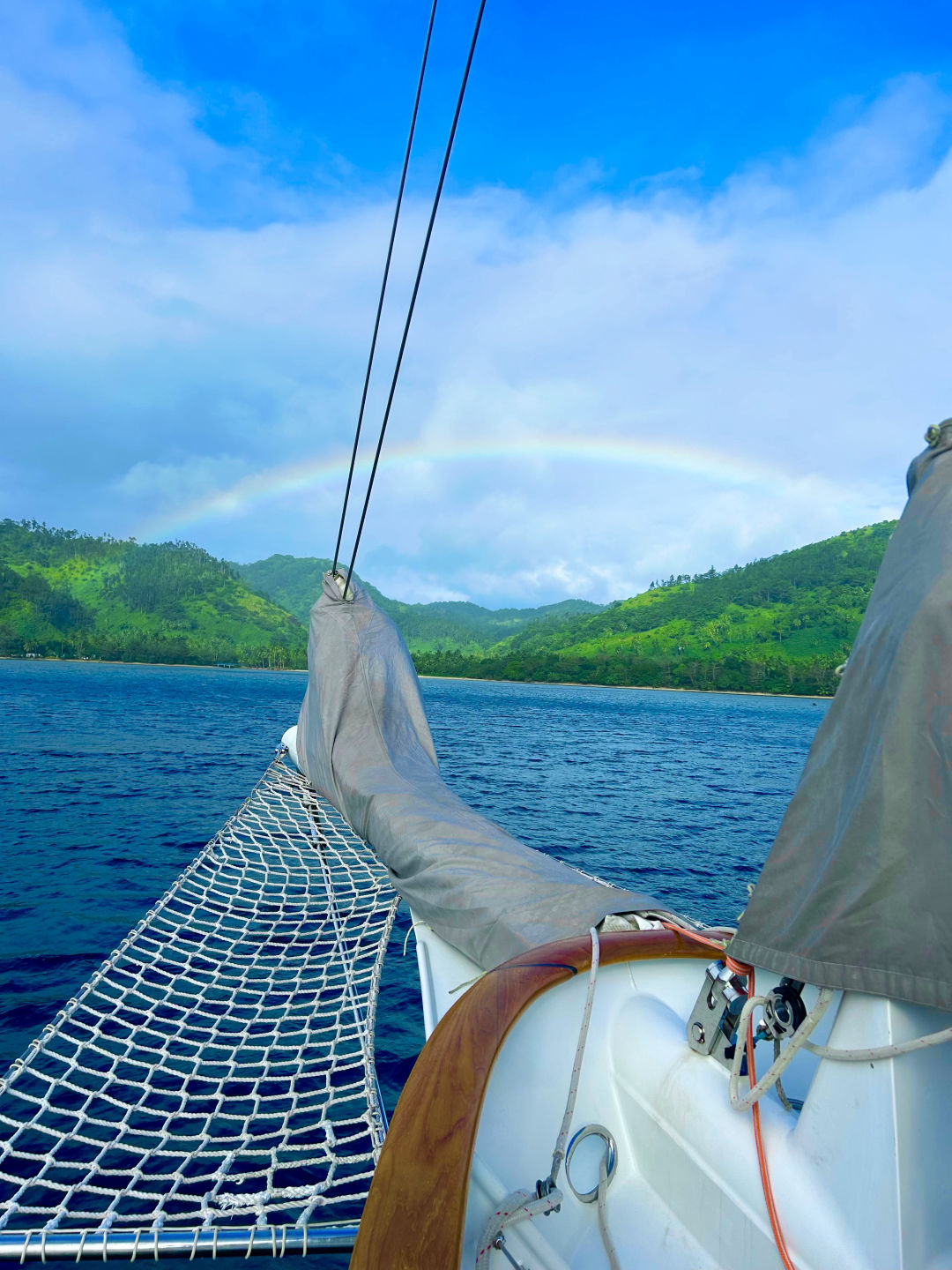 We set up and ate lunch about an hour before anchoring in the tropical and luscious lagoon. The rain started to clear up, and the sun blessed us with the closest rainbow any of us had ever seen, arching right over our heads!! We could see both ends (alas, no pot of gold), and it was perfectly clear. After admiring it and hanging out for an hour or so, we jumped into our wetsuits and went snorkeling to scout out the location of the night dive we were going to embark upon later. There were tons of rocks and underwater tunnels housing giant blue starfish and little baby reef fish. Unfortunately, one of our crew mates nicked his leg in the reef, and we had to take him to get it cleaned up. Thankfully though, everything is all good (thanks to trusty medic Tom), and we’re going to be heading out to North Astrolabe! Our crew got the boat prepped for passage and turned around in RECORD timing (no one is keeping track of actual times, but we did really well).
