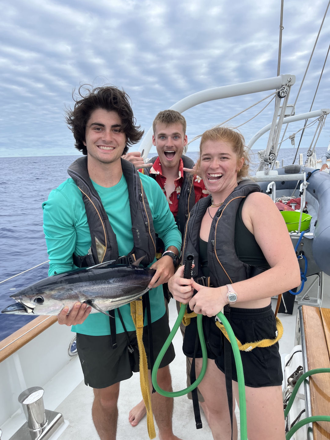 After class, we heard shouts on deck and came up top to see Jack and Perry reeling in a fish! We had set lines out earlier in the day and were so stoked to see we had caught something. Jack pulled it up, and we discovered it was a tuna. We are going to be eating well tonight! Ben, our marine bio teacher, quickly turned the filleting process into a class in marine bio, and we went through the fishing, dissecting it, pulling parts out, and figuring out what was what. We cut open the stomach to see what this big guy had been munching on and discovered he was well-fed. He had three squid, a whole flying fish, and loads of small fish in his stomach. Ben, Jack, and Perry finished filleting the fish, and after dinner (which was already prepped by the time we filleted the fish), Justin cooked it up for a late-night snack. It was incredible, and I don’t know about the rest of the crew, but I had been craving fish, and it really hit the spot.