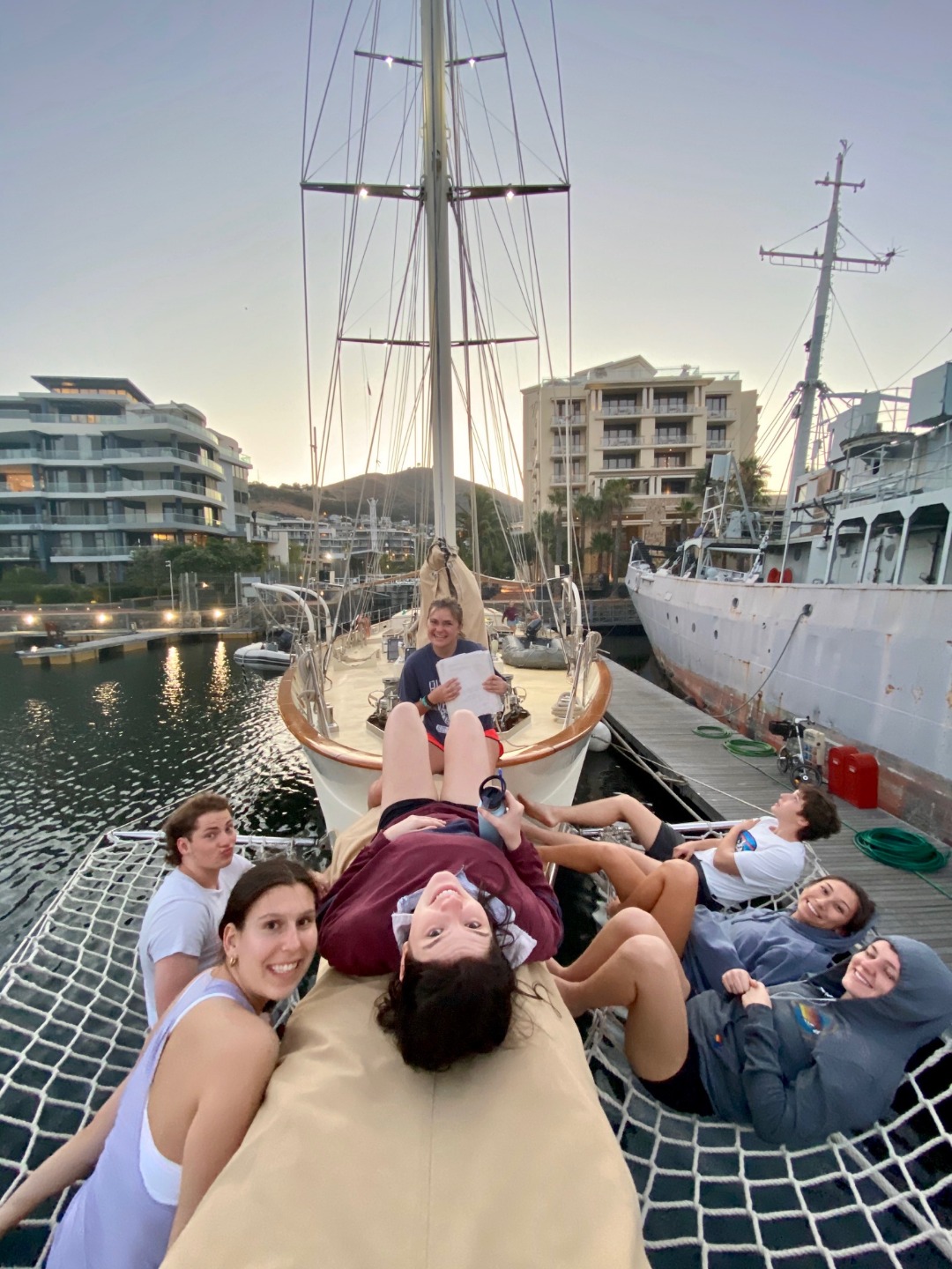 Our excitement for the trip is palpable, as when we were walking into the aquarium I overheard a passerby say “I’ll have what they’re having!”. If you were to write down “what we’re having” it’d probably be a mix of learning how to sleep with all your belongings on your bed, pumping the toilet 50 times to flush it ( if we come home stronger know it’s because of this, not pulling ropes), and overcoming jet lag, none of which adds up to the energy and smiles the woman was commenting on. Getting back from the Aquarium, we had some time to explore Cape Town, and we also tested just how many people the net at the bow can hold. We ended our day looking up at the stars (commenting on whether or not Orion really looks like a person) and went to bed excited for all that is to come.