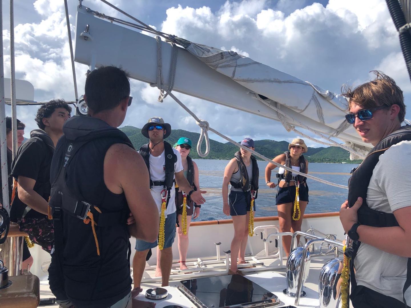 The next hour was spent learning about the different PFDs aboard. The funniest part was watching Nate struggle to put on and take off the immersion suit. It had everyone laughing, and now we were finally ready to do our first bit of sailing. We left Soper’s Hole to head towards Savannah Bay. Everybody was super excited to finally get moving, and the breeze helped cool everybody down.