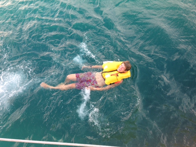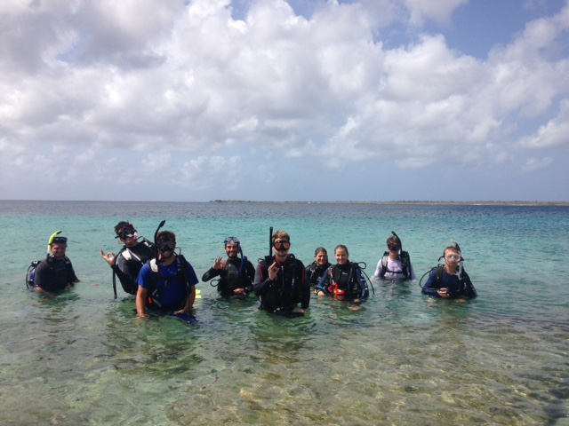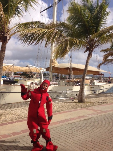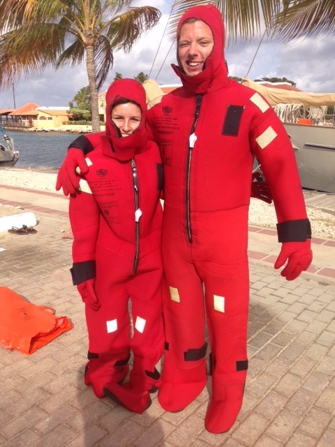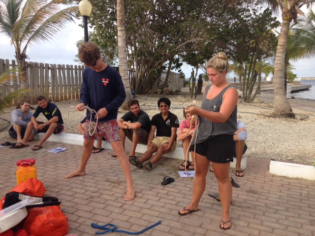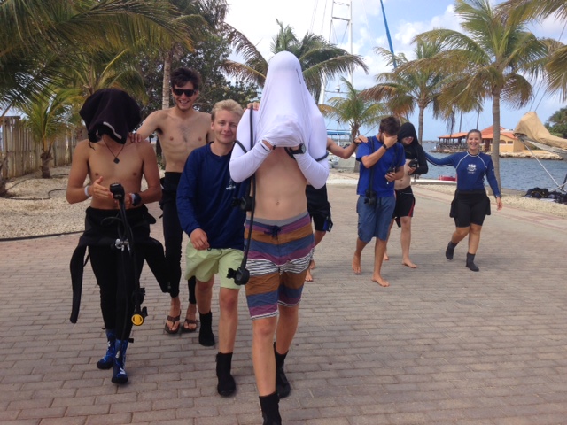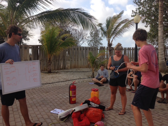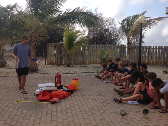 Our first full day in Bonaire yielded some memorable experiences. During a delicious breakfast of scrambled eggs with veggies and bacon, our group split into two. One half went windsurfing while the other half went diving. Before we went, Eric taught a great MTE class, which included knot-tying races, two students wearing huge Gumby survival suits, and Carly kicking me into the water. At the same time, I wore one of our West Marine type V life jackets, which inflated as soon as I went under (never fear parents: this was part of a class demonstration — promise!).