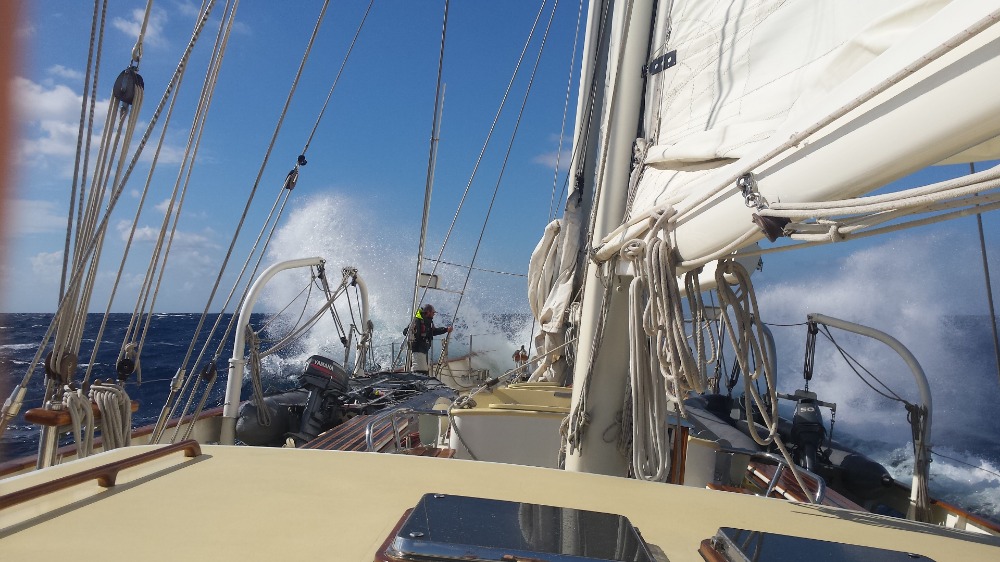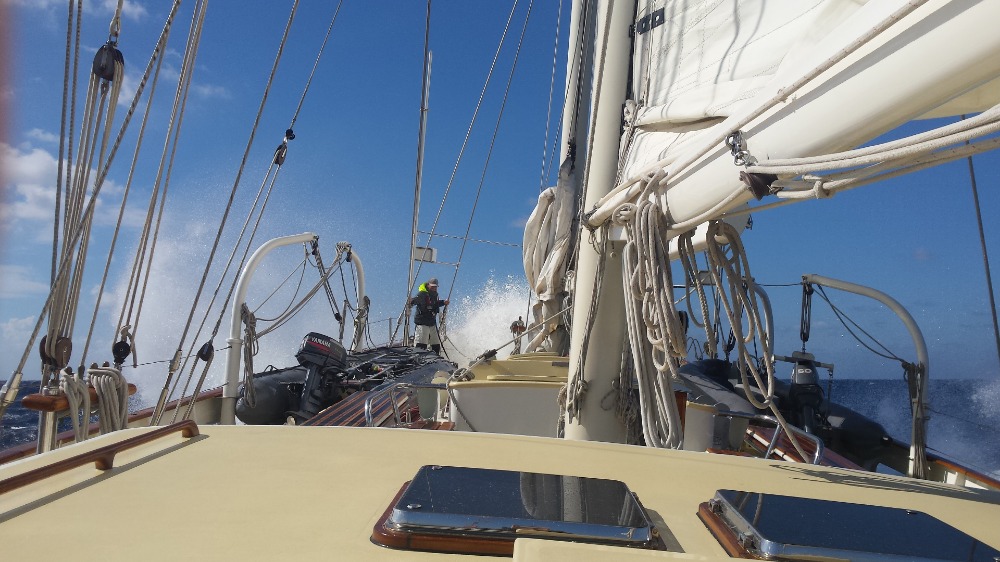 The morning marked the second day in our voyage to Motril, and the seas were making themselves known. Winds of 35+ knots and waves several feet tall had the crew sliding around their bunks. It’s as if we’ve embarked on a new journey altogether, and we’re getting used to the boat all over again. Watch teams came to the deck prepared to be soaked, and they weren’t disappointed. As we slowly began to re-acquire our sea legs, we sat down for our second oceanography quiz, followed by a very relevant lecture on wind and currents. The wind and seas continued to build as we sailed into the night, only this time they were joined with rain and lightning. The incredible storms lit up the sky and provided quite a spectacle for the watch teams of Argo, as well as propelling us forward at new speeds. Dinner had to be held below deck for the first time on our voyage, as the alternative may have ended in disaster. The staff of Argo remained unfazed throughout the day and took this opportunity to instruct us on safely navigating the weather and going about normal business. With nothing more than a few scrapes and bruises, the day ended up being quite enjoyable, especially for the thrill-seekers of the group.