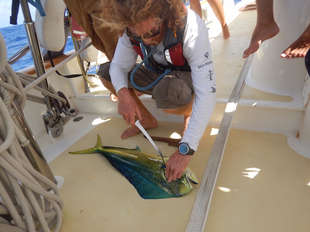 Our last full day underway to Jamaica started off with a pod of Melon-headed whales singing us to sleep for over an hour. The wind died down, and you could hear them talking to one another through the hull of Argo, and everyone said it was one of the coolest things they’ve ever heard. Unfortunately, I was on watch team two, which was asleep at the time, so we did not get to witness this natural phenomenon; we were all pretty bummed. However, around 0830, Ian, our fish guru and first mate, caught us a Mahi Mahi, which was pretty cool. When they die, their bright green-yellow color fades instantly, it’s pretty crazy, and tonight we will eat him for dinner!