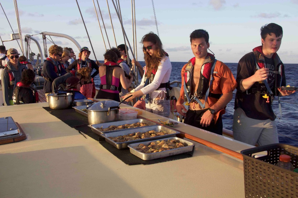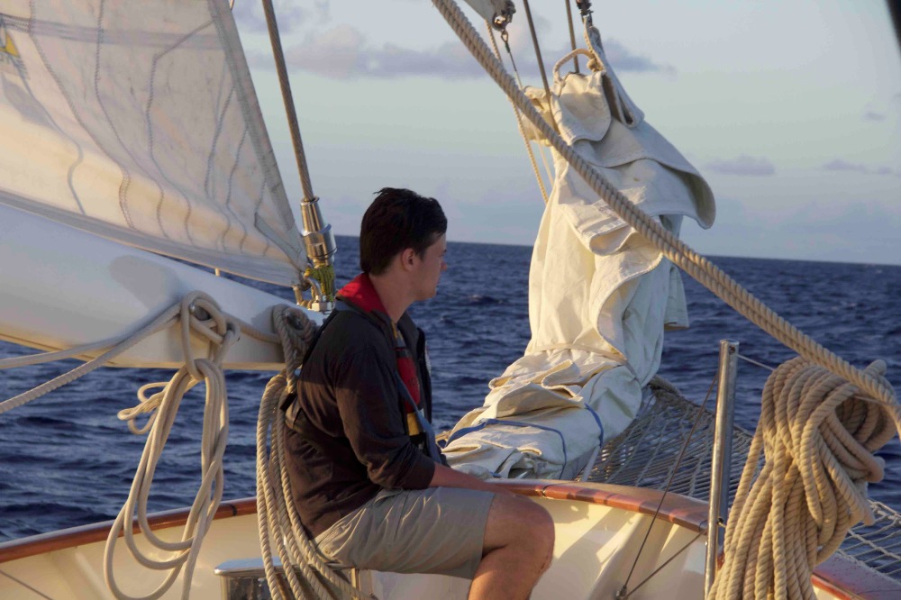 Today, we experienced a lot of firsts on Argo. Since we’ve started our trip, many people, including myself, have become seasick. Some made it to the deck, others not so much, but we did experience an amazing sunrise, stars for those on watch during the night, and an amazing sunset, and hopefully, by tomorrow, everyone will be good. We had our first Seamanship Class, which consisted of the different forms in which one can position sails. As an aftermath of staying up late and seasickness, I can roughly estimate that 1/3 had trouble focusing, but we quickly woke up because, following this, we had our first fire drill and evacuation drill. Though we could’ve been slightly more organized, it all ended smoothly. Then, we showered on Argo for the first time. I’ve never had such an adrenaline rush from just showering. Finally, we ended this day with a squeeze question by asking ourselves the age-old question, “Would you rather have legs the size of fingers or fingers the size of legs?”