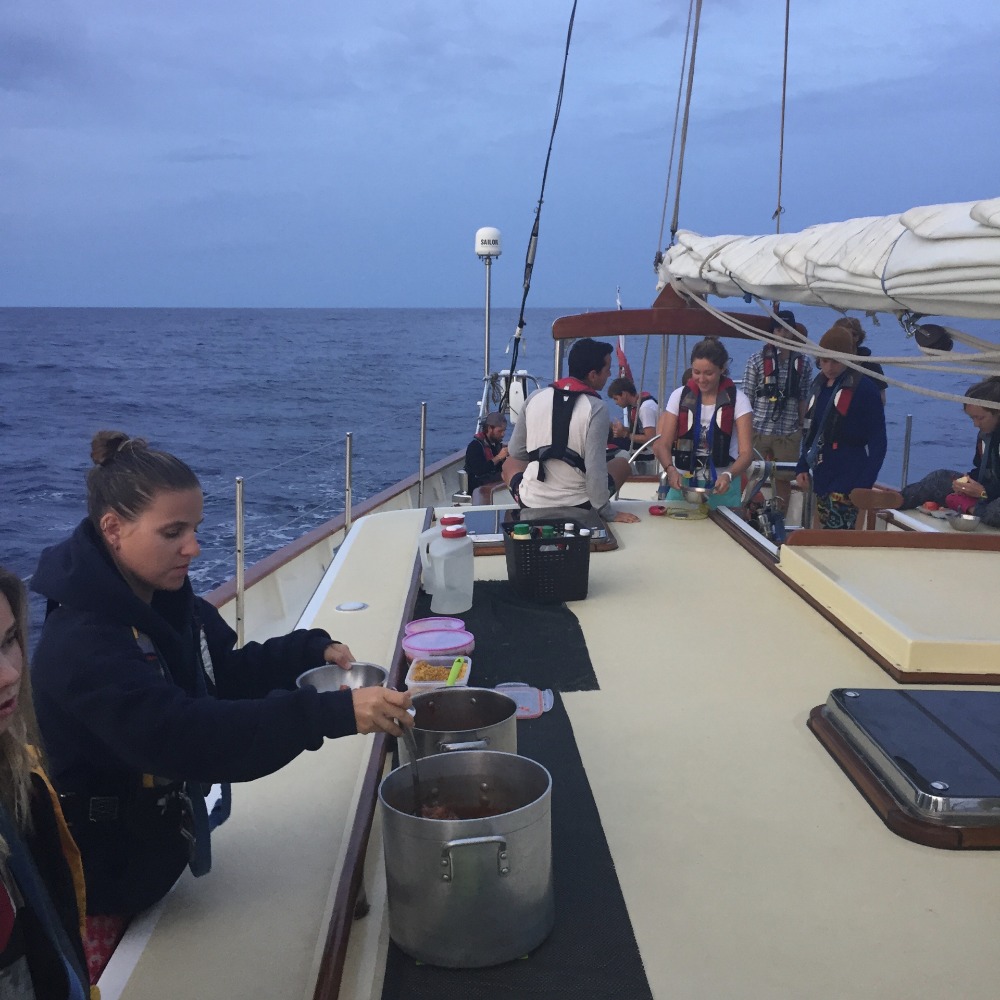 We aboard S/Y Argo departed Morocco yesterday and have broken into the passage routine of taking command of the vessel in watch teams (1, 2, and 3) as we make our way across the North Atlantic Ocean towards Gran Canaria. Overall, the crew’s morale is high; after an amazing trip around Morocco, “glamping” and surfing, everyone is anxious for what awaits. With more scuba diving ahead and with the long-awaited passage across the pond towards the Caribbean, everyone is very excited. First-Mate of the vessel, “Wiggy” or Ian, entertained watch team one this morning during our 0400-0800 watch with some interesting facts about Las Palmas, Gran Canaria. Christopher Columbus stopped in Las Palmas for repairs before he set sail across the Atlantic to the New World. In addition, Lord Nelson, when laying siege to the city, lost an arm in the midst of battle. Anyway, the history lesson is over. Before the sun could peek over the gloomy horizon, Wiggy and I began to practice some celestial navigation by predicting the time of sunrise. After some refreshing and mathematical equations, we figured it out, watched the glowing sunrise, and cleared the hazy horizon at the time predicted. A few minutes later, we spotted two whales off in the distance, and later watch team 2 saw a basking shark. We are really getting lucky with the amount of life we have witnessed so far. After lunch, the crew gathered below deck for classes. During our SLS leadership class, we talked about ways in which we could all improve in the overall practice of teamwork that occurs 24/7 aboard and that needs to be perfected before the long passage begins. Afterward, we had a PEN or our basic seamanship class, where we learned about how to plot fixes, running fixes, and lines of positions just using a plotter and a few equations. The practical exercises turned out to be really fun, and everyone is really getting the hang of the concepts, which is beneficial because our Navigation Master exam is coming up soon. The crew was then released for bucket showers, and the students participating in the PSCT course discussed maritime law with Captain Ben. Dinner has just ended; it was a delicious chili, cooked by Nate, Lars, and Steve, also known as their self-titled “The Dream Team.” The day is now coming to an end. We are now passing the island of Lanzarote and are 125 nautical miles away from our destination, moving at a speed of 6 knots. So, in roughly 20 hours, we will be preparing for diving, hiking, and provisioning for the journey, which many seafarers have completed before us.