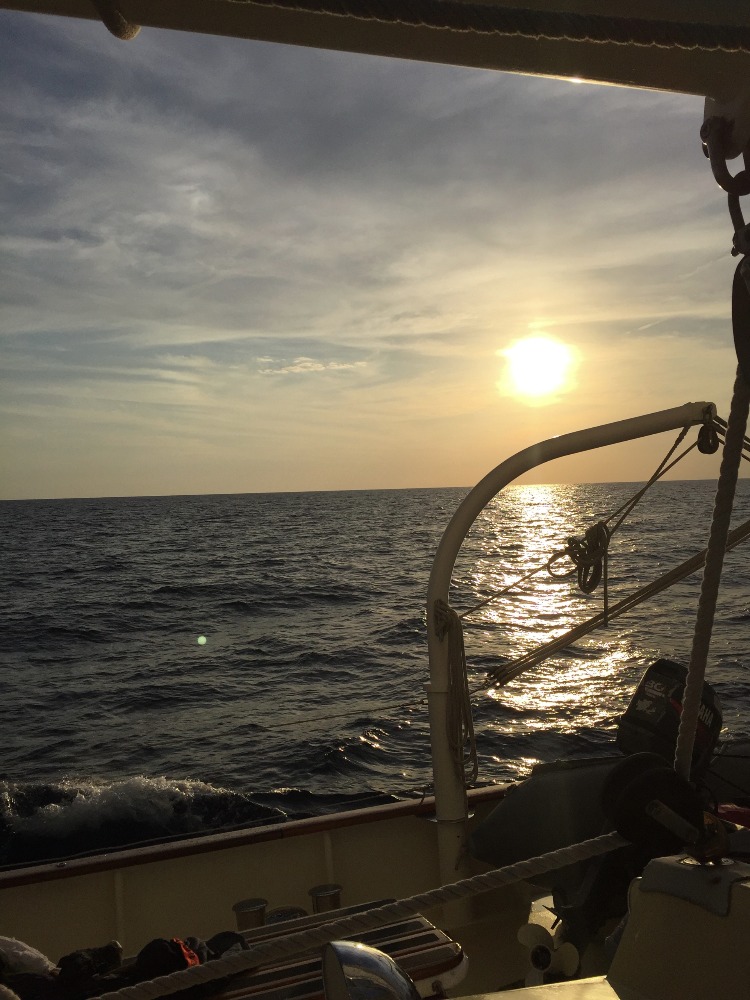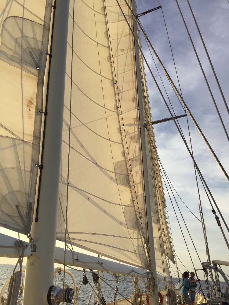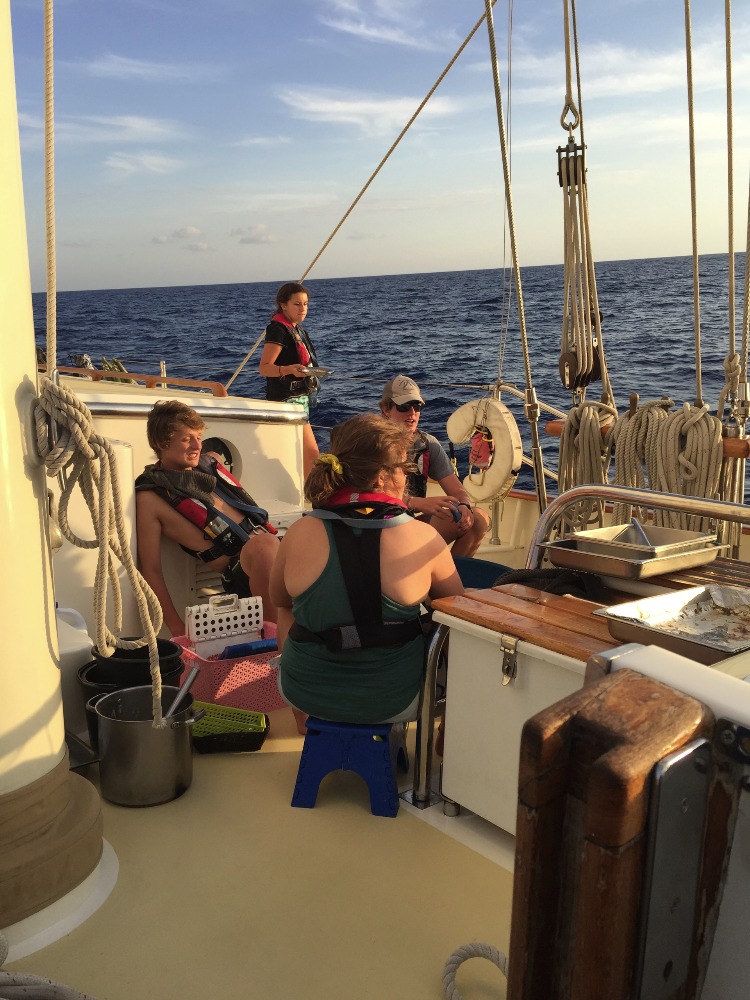 Today marked our second day on passage heading to Havana. Everyone has established routines on passage at this point, so days go by with ease now. The morning started off with my watch team, Watch Team 3, at 4:00 a.m. After going through the four hours with no one falling asleep, we all headed down to go back down below decks to catch up on some much-needed rest. The whole boat was up and moving around 11:45 for a delicious lunch made by Tina (my favorite cook at the moment). After lunch, we did our clean-up jobs and headed down below for a marine bio class with Steve and a navigation MTE class with Eric. During our break between classes, we went up to put up the fisherman’s sail, which is the sixth and final sail for us to raise. It was the first time for us to have all six sails up, and it made us all feel like really accomplished mariners. Following class, we headed up for showers, and then everyone branched off. Some watching movies, some sleeping, and the active watch team was on deck until dinner. For dinner, we had delicious Cajun chicken thighs, mashed potatoes, biscuits, and a veggie medley. We were then surprised with dessert: Churros with a traditional Spanish chocolate dipping sauce that was absolutely scrumptious. We are all looking forward to arriving in Havana and seeing more of this insanely beautiful, incredibly cool island.