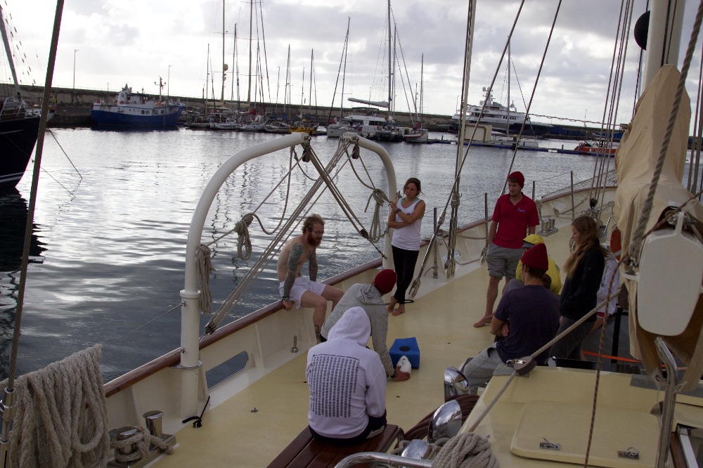 The day has finally arrived- we are officially underway to Dominica! Today, after breakfast, we practiced more CPR and First Aid on some pretty creepy dummies. Everyone now feels comfortable with chest compressions and rescue breaths, should any problems arise while we are at sea. We then prepared the boat for this long passage, taking extra care to make sure everything on Argo was in perfect shape before pulling out of Tenerife. We said our goodbyes to land and made final phone calls before heading out. With hot dogs in our hands and a beautiful pink sunset behind us, we are sailing into this exciting adventure. That’s right, SAILING. We got some good wind today, and we can only hope we get even more in the next three weeks.