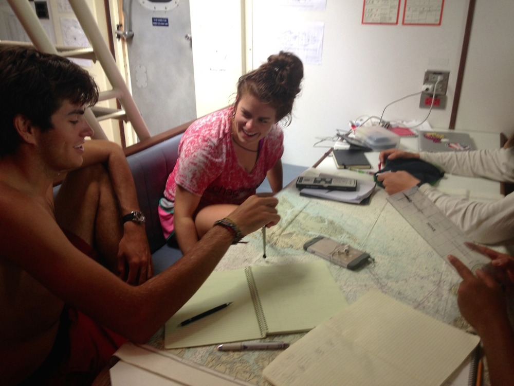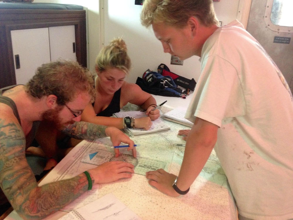 This morning started lazily and late, as during passage, the first meal everyone comes together for is lunch. It was definitely a bit rolly today, so the cockpit – where we eat all of our meals – became a sliding ground for leftovers and water jugs, as it was easier than passing things! After clean-up, we continued with our Seamanship Course that was taught by Eric. Recently, we have been working on the Navigation Master section, so today, we continued with charting and plotting 3-point fixes, and being able to change a course from compass course to true compass. The afternoon was then filled with everyone putting their heads down to study, as we have a marine biology exam on Sunday, along with some of our knowledge reviews that are due for our rescue divers course! We should be arriving in Nassau, Bahamas, sometime tomorrow morning, where I know everyone is anxious to get back in the water!