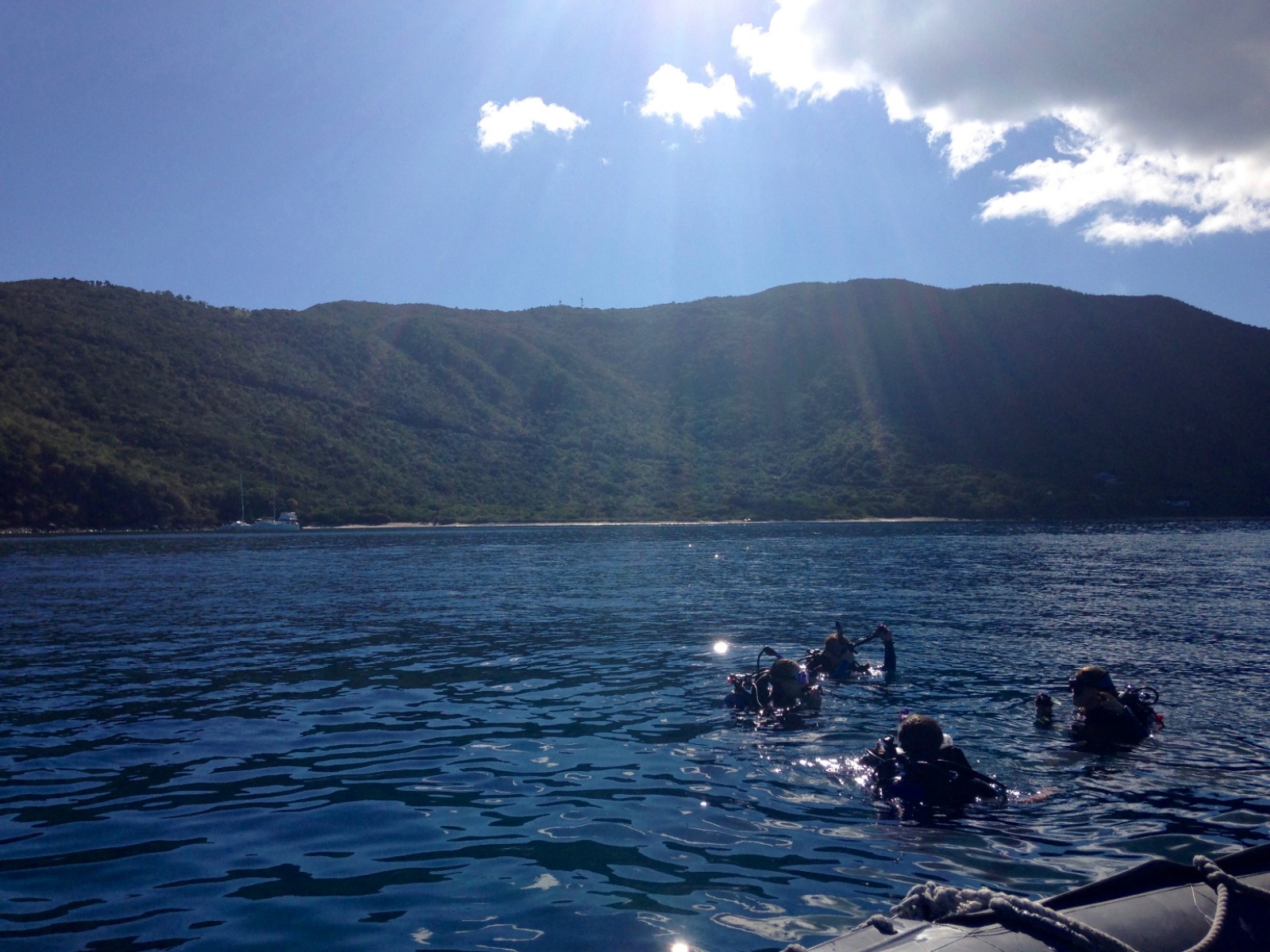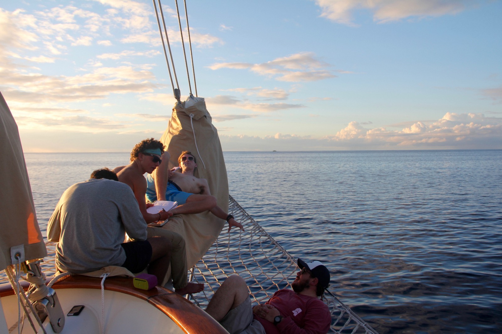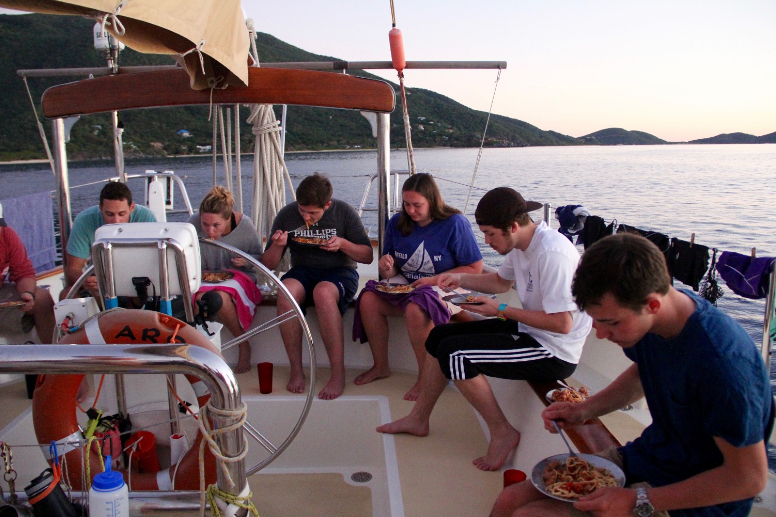 Today was an exciting day for our students completing their Open Water certification, as they had their first experience doing a real dive. After spending a few days in the shallows over in Gorda Sound, completing their confined water and learning all the skills necessary to dive, they got to do two dives around the reefs and rocks at Mountain Point. They practiced the skills they had learned this past week and also saw a plethora of fish and even a ray. Shipmates that were already certified spent the morning snorkeling and free diving the same site, learning some new species to put into the fish identification logs they keep for marine biology. The afternoon was spent looking up fish in the ID books we have on board, enjoying the water during a jump in showers, and relaxing in the bowsprit or under the tarp up on deck playing chess, singing, and playing guitar, or just enjoying the view during another beautiful sunset. After dinner, we all gathered in the saloon for our introduction to oceanography class. As the oceanography instructor, I was very pleased to see how interested our shipmates this semester are in marine science and watch them rush to the sign-up sheet after class to pick their favorite topic for the literature review paper and presentation they will be doing later this semester. Some of us are now headed to bed, but a good number are still up on deck, now learning some sea shanties with Lindsay under the stars. We have some very musically talented people on this boat, and it sounds like a good lullaby to me…