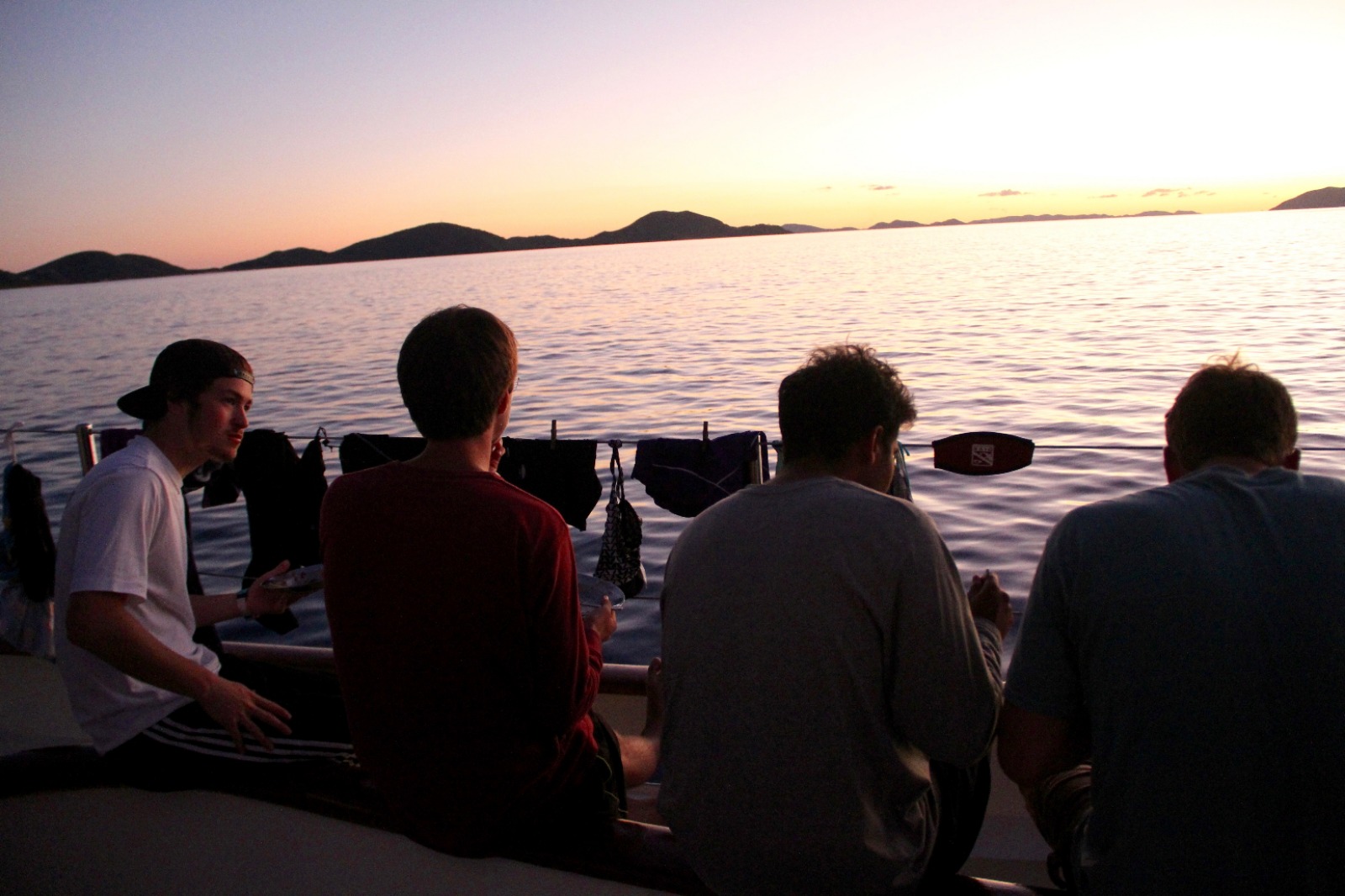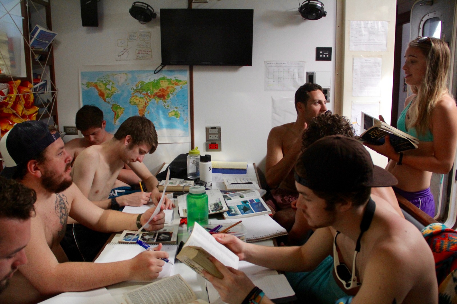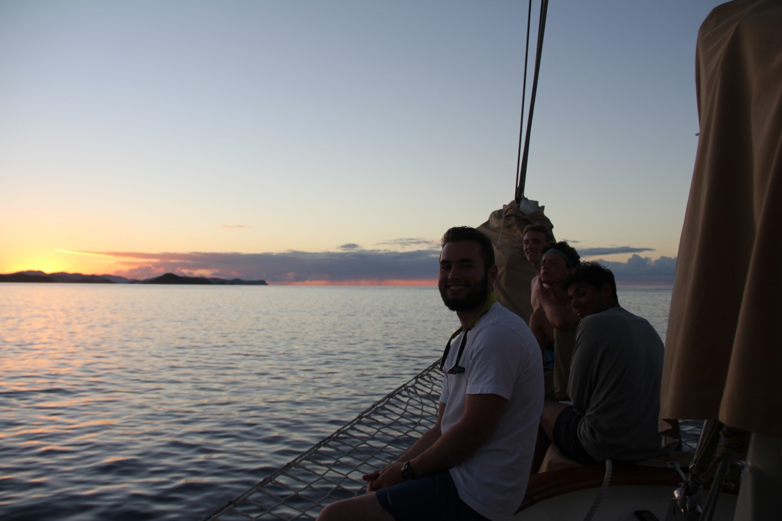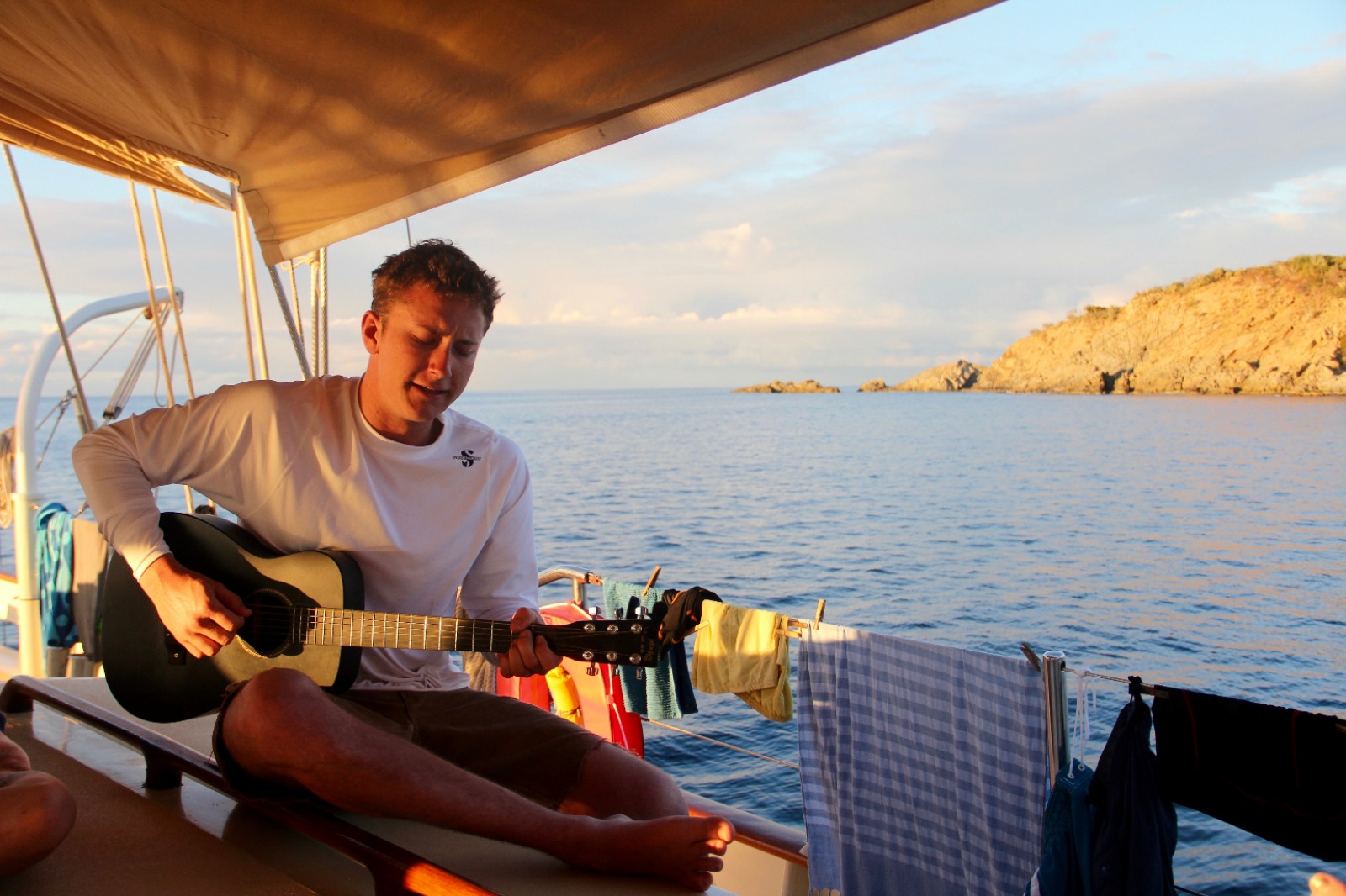 Today was an exciting day for our students completing their Open Water certification, as they had their first experience doing a real dive. After spending a few days in the shallows over in Gorda Sound, completing their confined water and learning all the skills necessary to dive, they got to do two dives around the reefs and rocks at Mountain Point. They practiced the skills they had learned this past week and also saw a plethora of fish and even a ray. Shipmates that were already certified spent the morning snorkeling and free diving the same site, learning some new species to put into the fish identification logs they keep for marine biology. The afternoon was spent looking up fish in the ID books we have on board, enjoying the water during a jump in showers, and relaxing in the bowsprit or under the tarp up on deck playing chess, singing, and playing guitar, or just enjoying the view during another beautiful sunset. After dinner, we all gathered in the saloon for our introduction to oceanography class. As the oceanography instructor, I was very pleased to see how interested our shipmates this semester are in marine science and watch them rush to the sign-up sheet after class to pick their favorite topic for the literature review paper and presentation they will be doing later this semester. Some of us are now headed to bed, but a good number are still up on deck, now learning some sea shanties with Lindsay under the stars. We have some very musically talented people on this boat, and it sounds like a good lullaby to me…