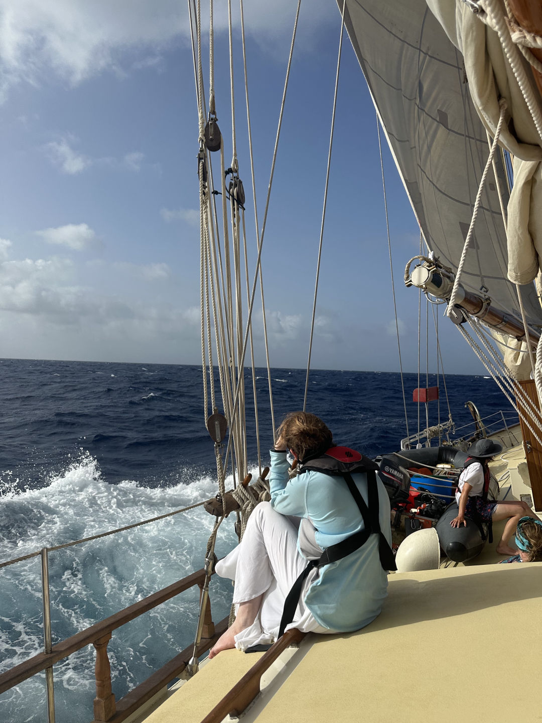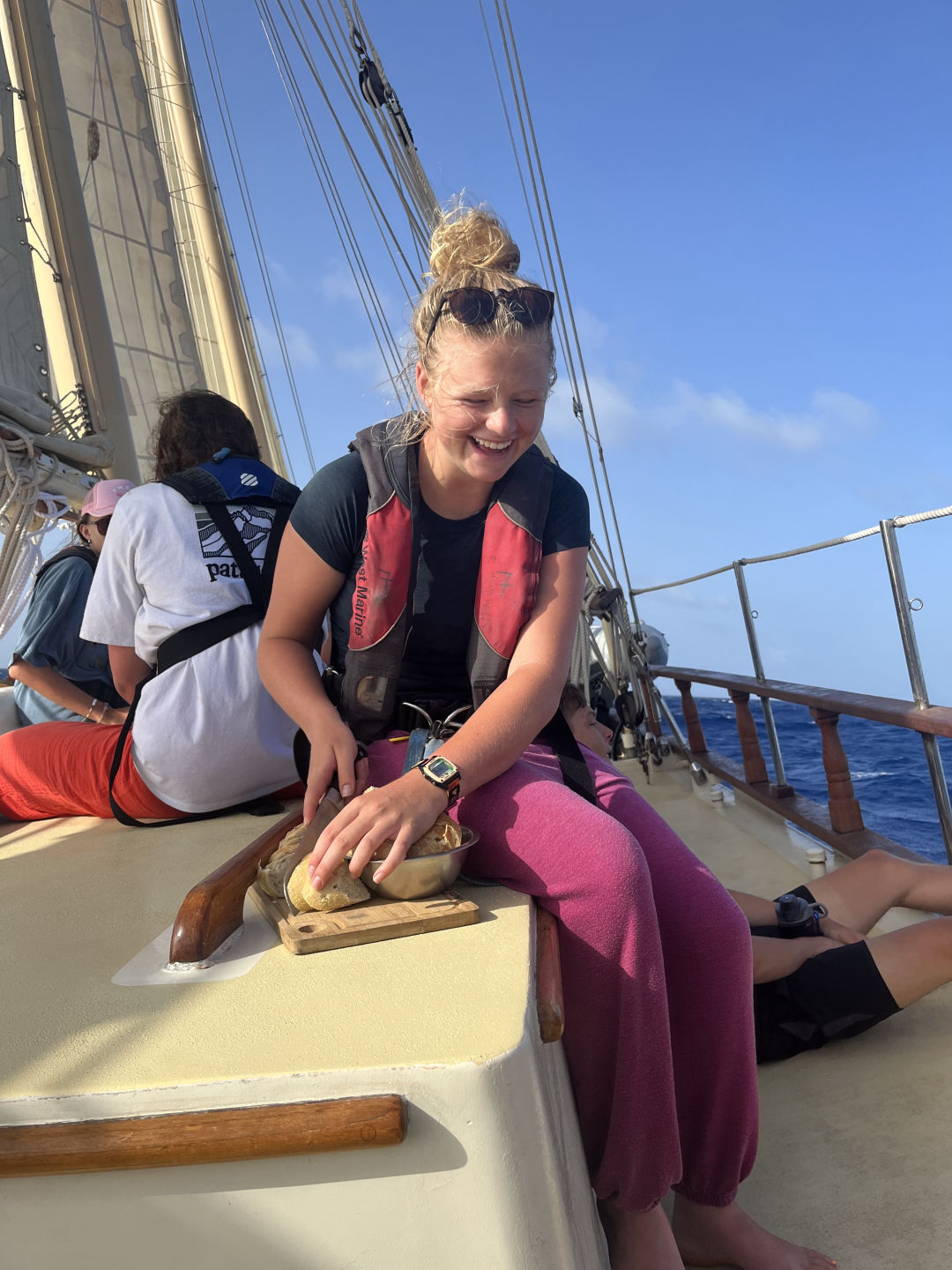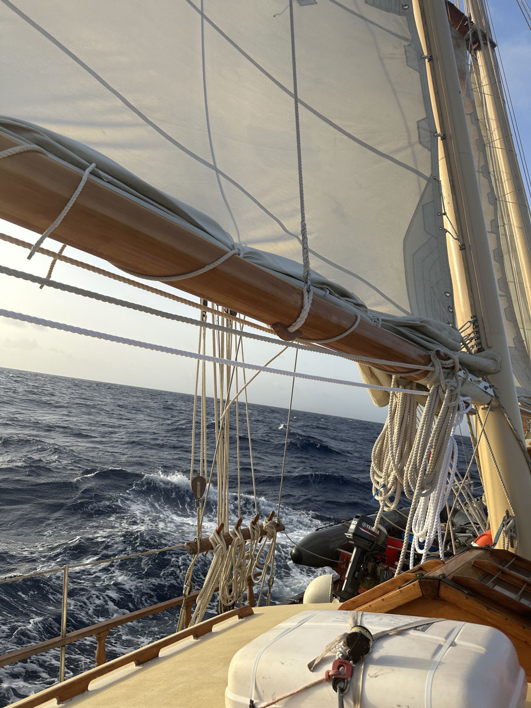 Unlike the past days, we all woke up at various times this morning as we had 3-hour watches during the night. Split into three different watch teams, we take turns doing boat checks, steering the boat, and keeping watch on deck the whole time we are underway. Meaning 3 hours on watch, then 6 hours off the whole time we are moving. Breakfast was just cereal whenever you wanted it, as everyone was sleeping at different times. Went to sleep last night under the impression that we would arrive at St. Barthes between 2 and 6 pm today. Due to the fact that the wind is coming directly from where we need to go, this ETA changed to 10 to 11 pm today this morninghad BLTs for lunch for those of us that could stomach it. A lot of people are feeling really seasick and or homesick todaypretty uneventful afternoon sailing. Most of the day was spent without sight of land or any other ships, just us and the endless ocean in every direction. Pretty cool to experience but also a bit unsettling. Dinner was beef stroganoff. Huge shoutout to the chefs for today. Really rough to cook while underway.