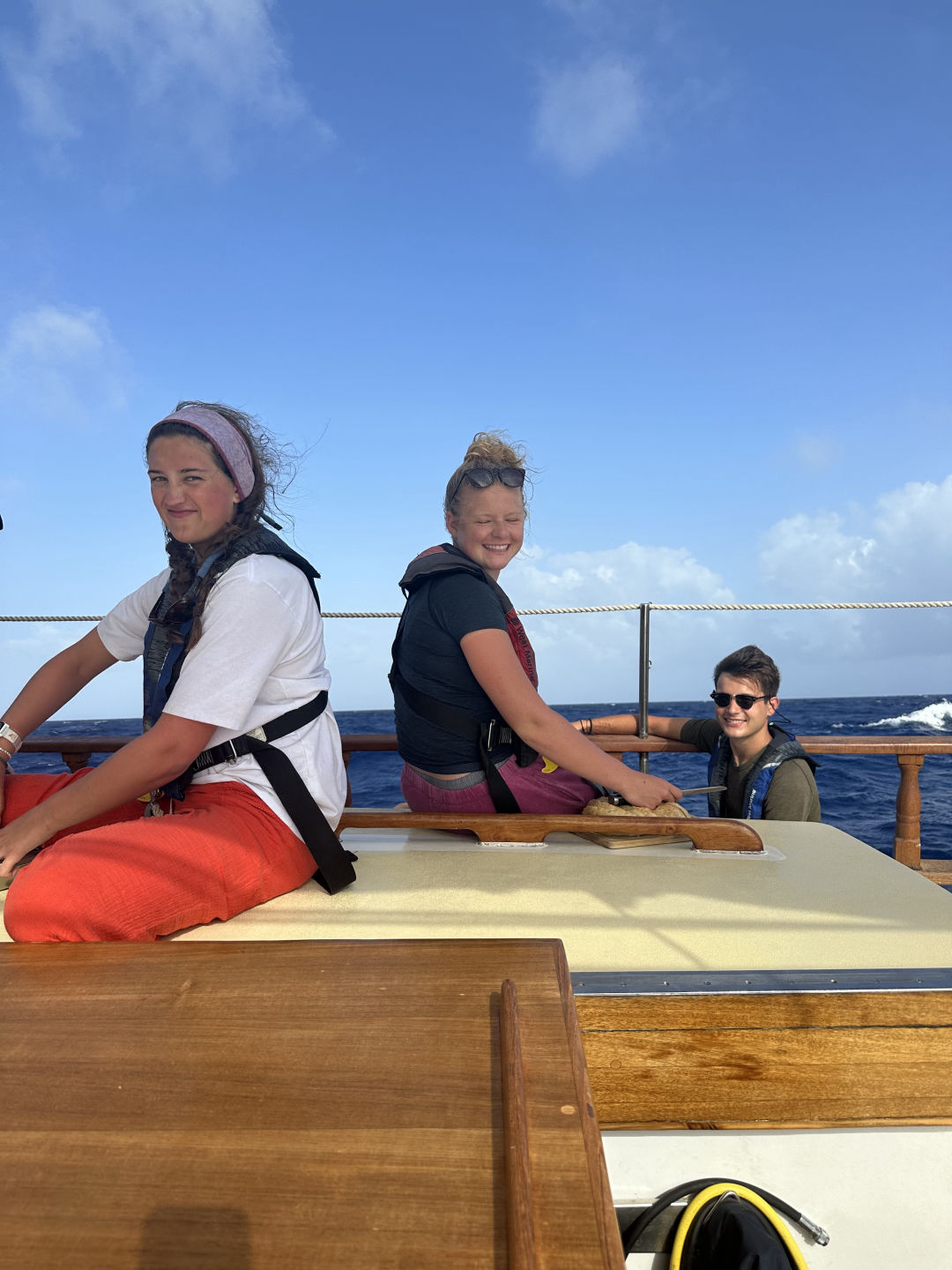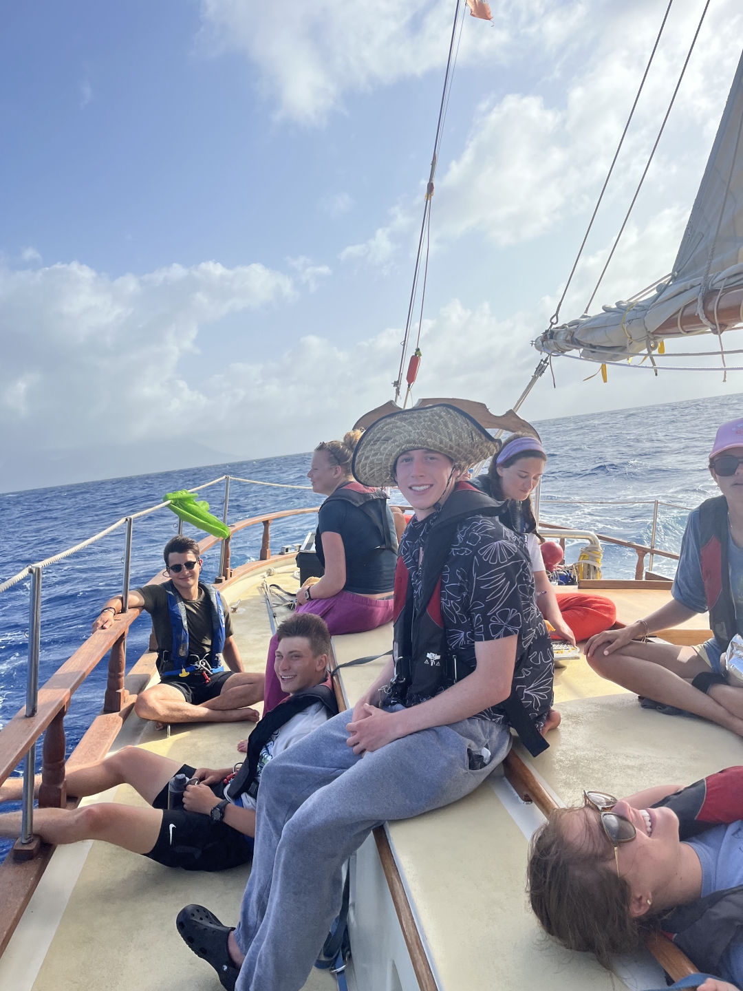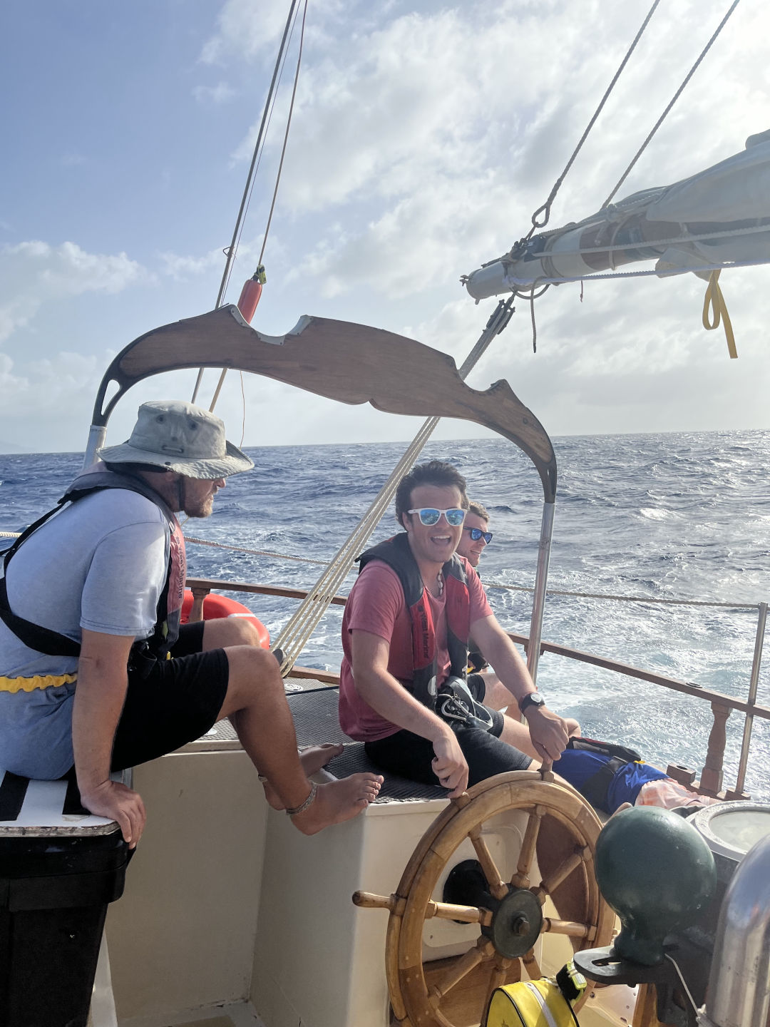 Around dinner time, we hit a random fishing net floating in the ocean, wrapping our propeller and completely stopping the engine. Due to the lack of an engine and the fact that sailing directly into the wind does not work very well, we last minute rerouted to anchor at St Martin rather than going all the way to St Barth’s tonight. This required dropping anchor from sailing at night, a fairly complicated move, especially for a crew that had never even dropped the sails at all before. Dropping anchor from sail took a lot of teamwork, precision, and timing, but under the guidance of our wonderful crew, we were able to step up and make it happen. When the anchor was dropped, the anchor brake broke, just another thing to complicate the task, but everything worked out fine. After anchoring, most of us jumped in the water for a midnight swim and a deck shower as everyone was feeling very gross and sweaty from the last day spent underway, a good end to a long day and a much-needed moral boost. Definitely not what was planned for and definitely not ideal, but we made it work, and our spirits remain high.