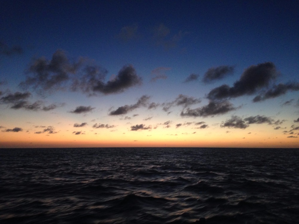 As the sun rose and began to warm Argo, we sailed over the deepest point in the Atlantic Ocean, the Puerto Rico Trench. The crew sleepily emerged on deck some hours later for a fantastic lunch and a small birthday celebration for Eric. It was a beautiful day for sailing, with smooth, calm waters all around us. Occasionally, a few seabirds came to investigate our vessel and the fishing lures that we towed behind the boat. After a few minutes, they would lose interest and float away on the soft sea breeze. The boat is now fringed with salt as the booms, sails, and halyards have accumulated small crystals from spray coming up from the bow. With under three weeks left before we leave Argo and replace her deck with the aisles of planes, each sunrise, sunset, and everything in between seems increasingly more special. These are the last days that all 21 people currently aboard will ever be on Argo together. While we have our hiccups, we truly are a memorable group full of people ready to complete rescue diver certifications and sail fast during classics week. I, for one, am planning on cherishing these last weeks we have together.
