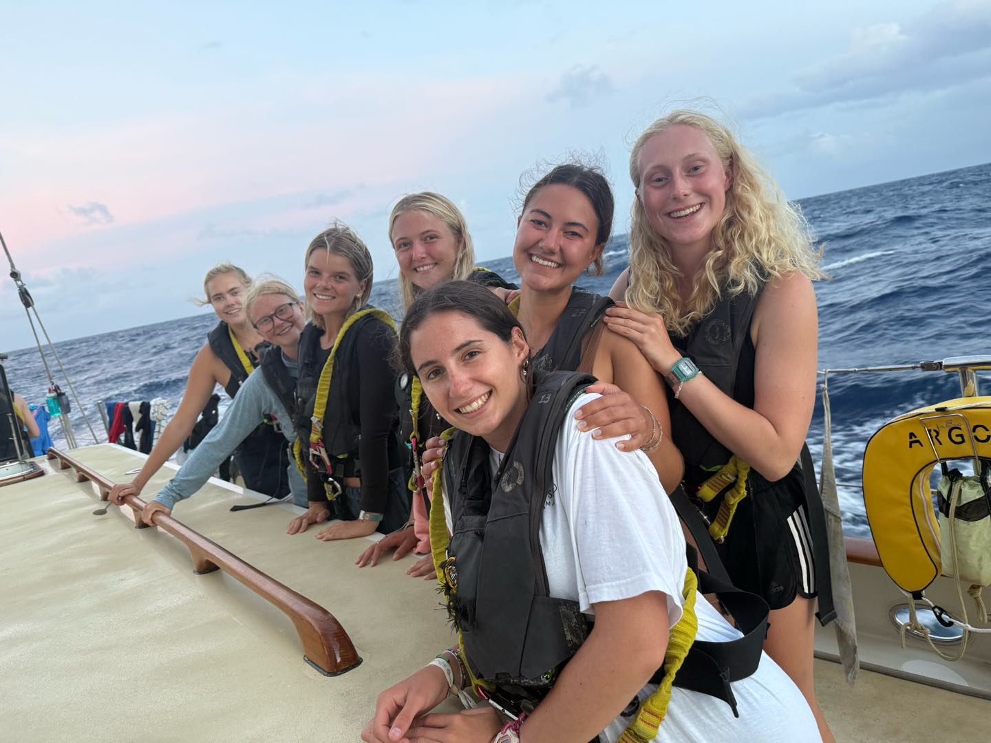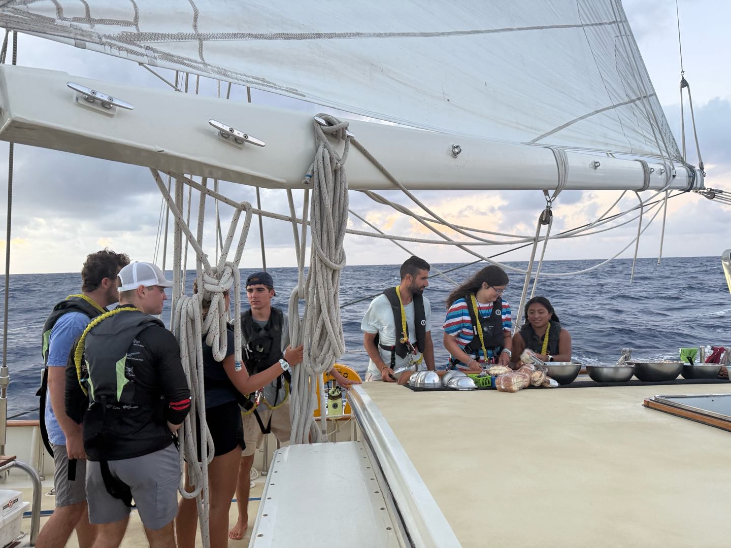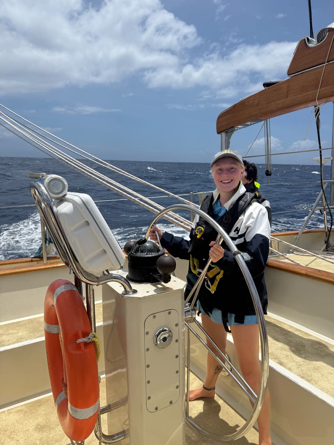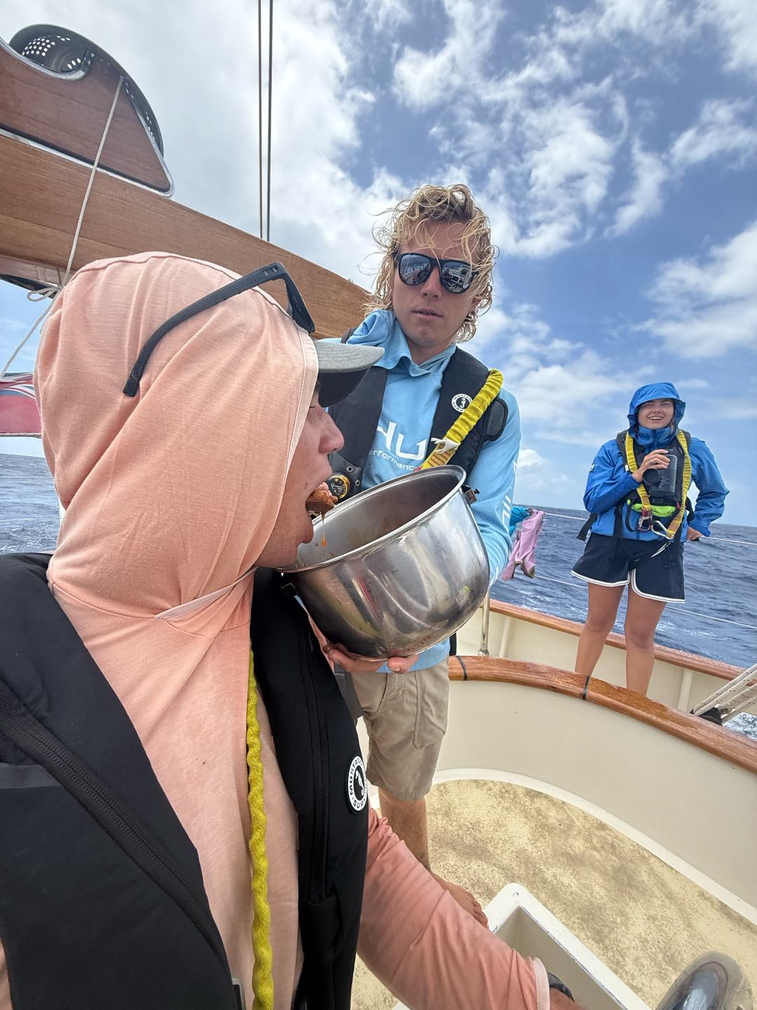 We had cinnamon rolls with dough made straight from a cloud and cinnamon harvested from the finest sticks for lunch, and sweet tender pulled pork sandwiches with coleslaw and corn for dinner made by Martin G and Will. It was said throughout the ship to have been one of the best boat meals yet (verified). After all, those two were slaving away since 4 am in the galley and ended a little after 8 pm. I’d even invite them to the cookout any day, and also come visit their new bakery in France called “Between 2 Buns” (better than Bonaire’s). No human should have to stand that long. I’m genuinely worried we might have to give them prosthetics and test their sanity after that grueling experience. At least they found bilge wine (grape juice) to get them through their sorrows. We had a nav master practice test; some of us used our whole noggins, while others sat silently, hoping that past sailors would grace them with the knowledge to pass this test. We watched some EFR videos. Jonas squeezed on a Gatorade bottle that Martin was drinking out of, and he spat water all over me and the table. Time changed, so now I have no idea what time it is anymore, just like I don’t know if it is day 8 or 9 of passage. Just the usual.