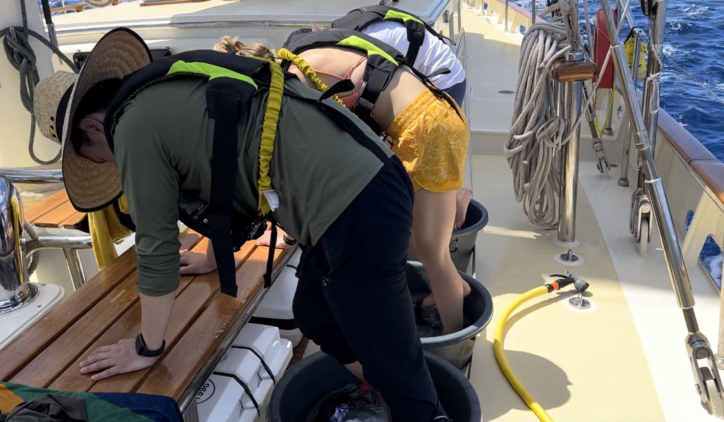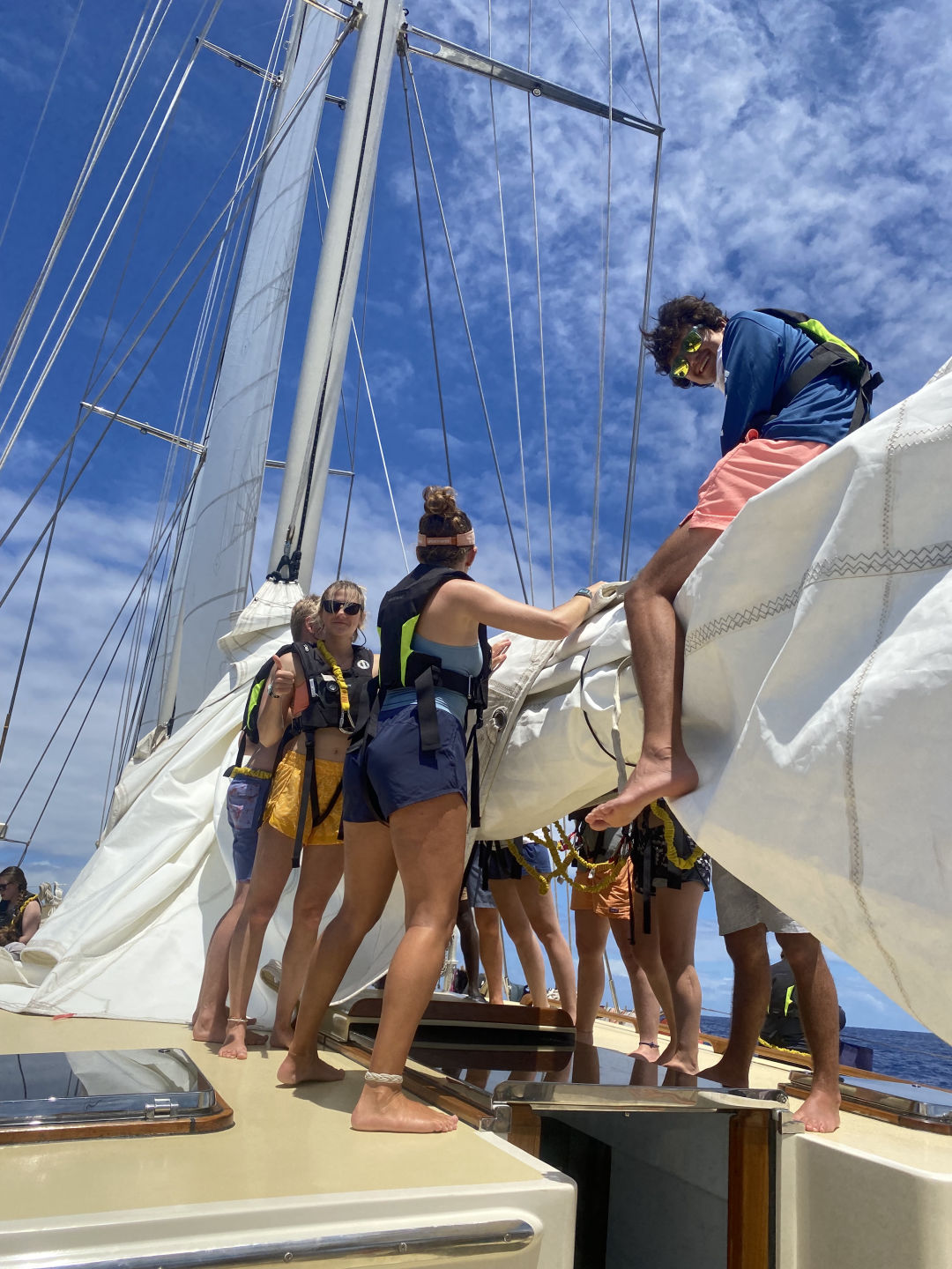 Today was a pretty big day on Argo! Watch team 1 spent the morning putting up the fisherman sail for the first time in over a year, which was very exciting. We also spent a solid amount of time polishing and then did some laundry on deck. Elisabeth, Max, Peter, and I filled up some buckets and stomped away on our dirty laundry while listening to Bruno Mars, which was quite an experience but very enjoyable. We had our first oceanography quiz, and it seems like the consensus is that it went pretty well. We also had a man overboard drill where we all mustered on deck and set up the rescue swimmer lines. We then spent around an hour and a half doing boat appreciation, where we all deep cleaned the boat (and changed sheets!!), which was very exciting. Today I am grateful to Nick for cleaning up the mold from a few onions that had gone rotten and were hiding in the corner of the salon. I’m also appreciative of getting to sleep in some clean sheets tonight before my 4-8 am watch 🙂 And that was pretty much the day! Dinner was couscous, and the daily squeeze question was, “what is one song lyric or verse from a poem that you relate to, and why?” My favorite answers were Peter serenading Will with Justin Bieber lyrics and Gabe saying he’d been thinking a lot about “we tha best” by DJ Khaled.