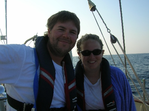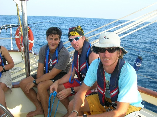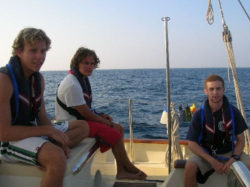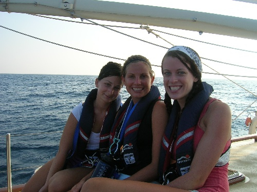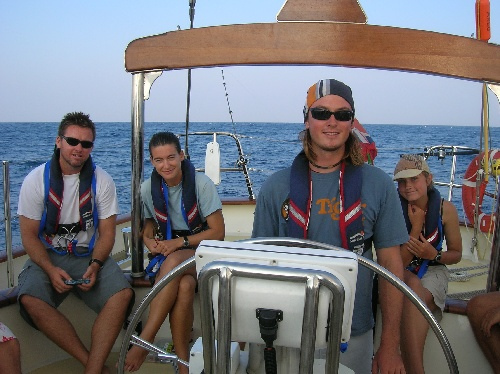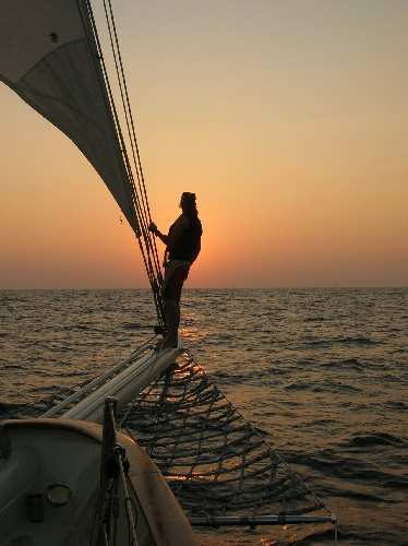 Today was another nice and relaxing day at sea. Everyone has settled into their watch rhythms and is enjoying the passage of life. Unfortunately, we didn’t catch any fish today, but we saw some dolphins after dinner. Our two classes in the afternoon were marine biology and professional skipper and crew training, where the students began their formal navigation training. After a delicious dinner of rice and beans cooked by Jill and Brittany, watch team three take the deck just before a beautiful sunset. We’ve spent the last three hours enjoying the beautiful sailing and discussing such important matters as American Idol, childhood TV shows, and whether the light we saw shooting across the sky was a UFO or a spaceship.
