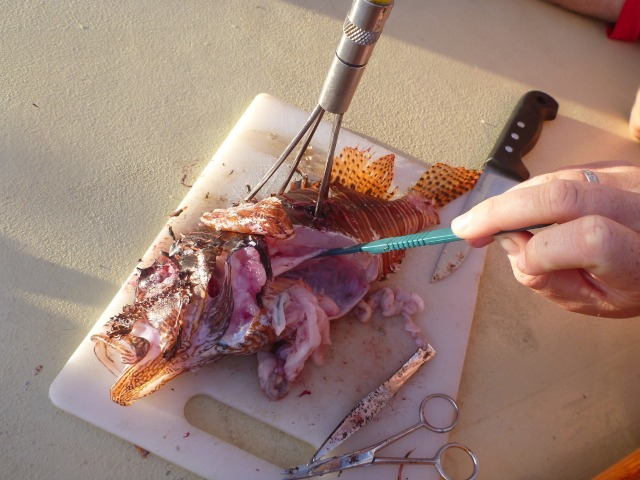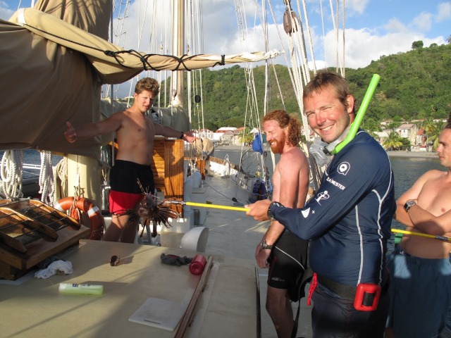 We started the day with boat appreciation, which involved scrubbing down the entire boat and making sure all lines and other things were neatly put away and cleaned. Next, we had an MTE class review for our upcoming midterm that will get us our crew certifications, which everyone is looking forward to. After we finished our work, we went shore to Martinique for the first time. It was a very pretty island despite having a devastating volcanic eruption in 1902. There were still ruins and charred buildings in the small city that were constant reminders of the danger looming just above the city. Martinique was also the first island we had been to where almost nobody spoke or understood English, seeing as it was a French island. It was definitely a cool experience; however, it also proved frustrating when it took me 15 minutes to find a bathroom because nobody could understand what I was saying, and all the signs were in French. Back on board, our captain/dive instructor Ben and first mate Nick had gone on a dive to check out the site where we will be doing our deep dive tomorrow, which is one of the dives that are part of our Advanced Open Water certification. They brought a spear gun with them and killed several lionfish along the way; as we learned in OCB, lionfish are invasive in the Caribbean and are harmful to the ecosystem because they eat everything, and nothing eats them. They brought one back to the boat, and we had an impromptu lionfish dissection up on deck with OCB instructor Jessica. After a delicious dinner of some locally caught tuna with cheesy vegetables, the day ended with a documentary on a pretty sweet animal, the giant squid.