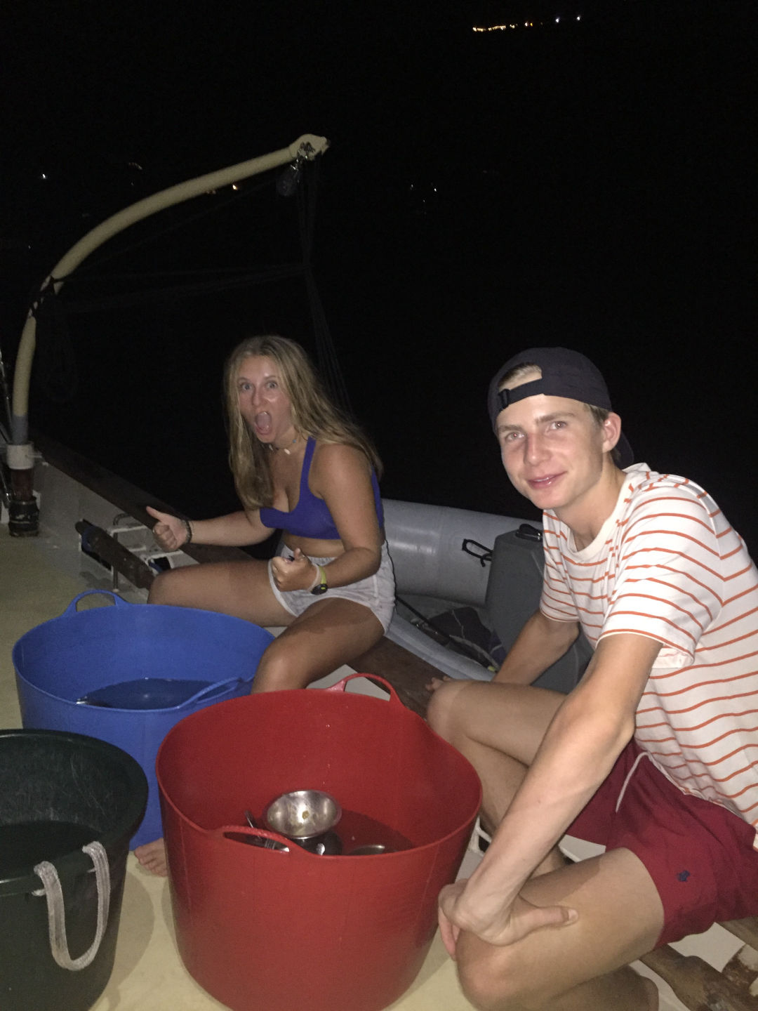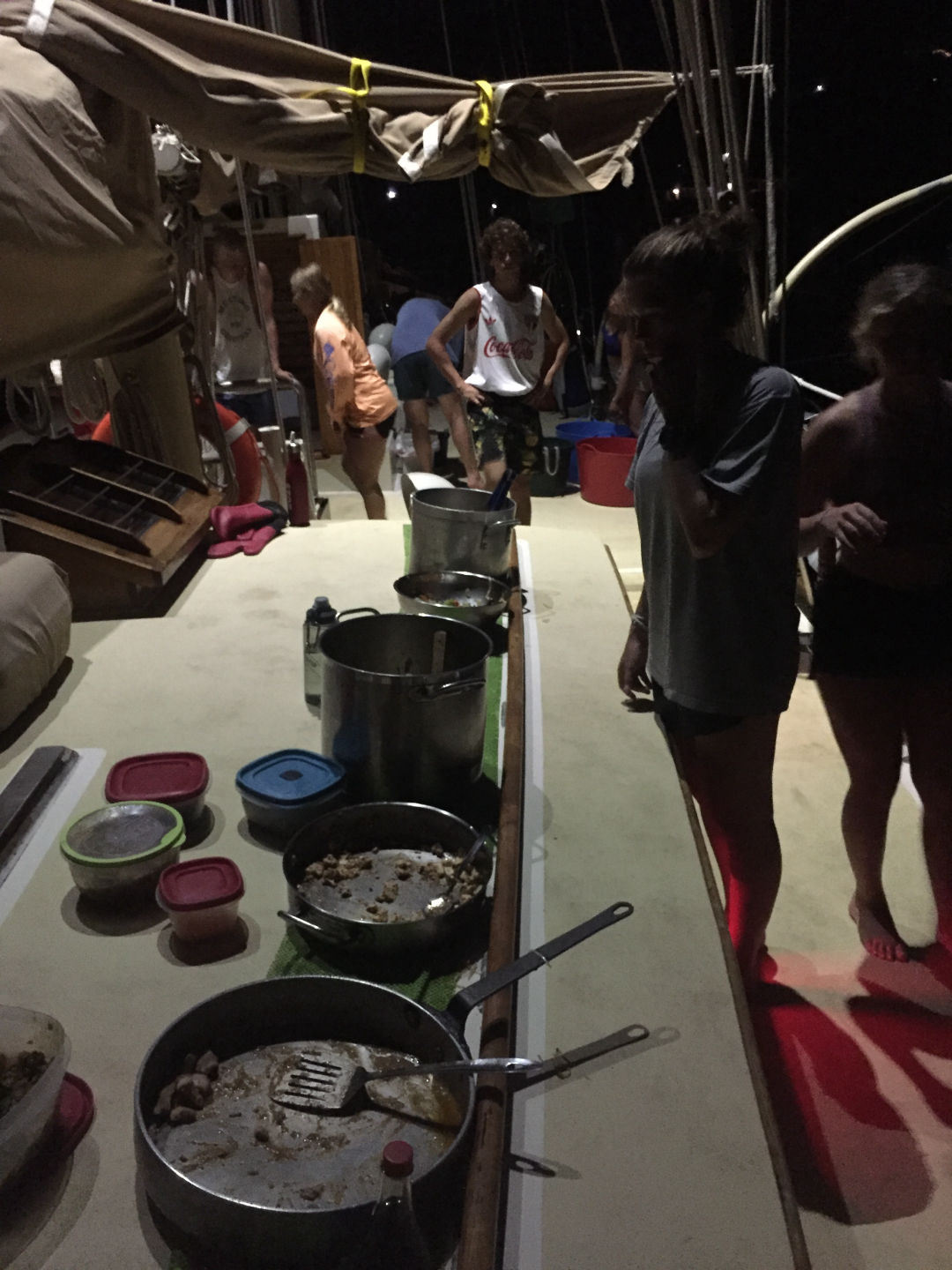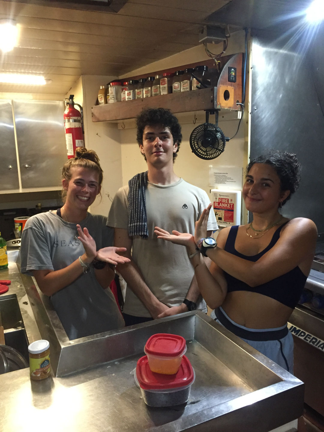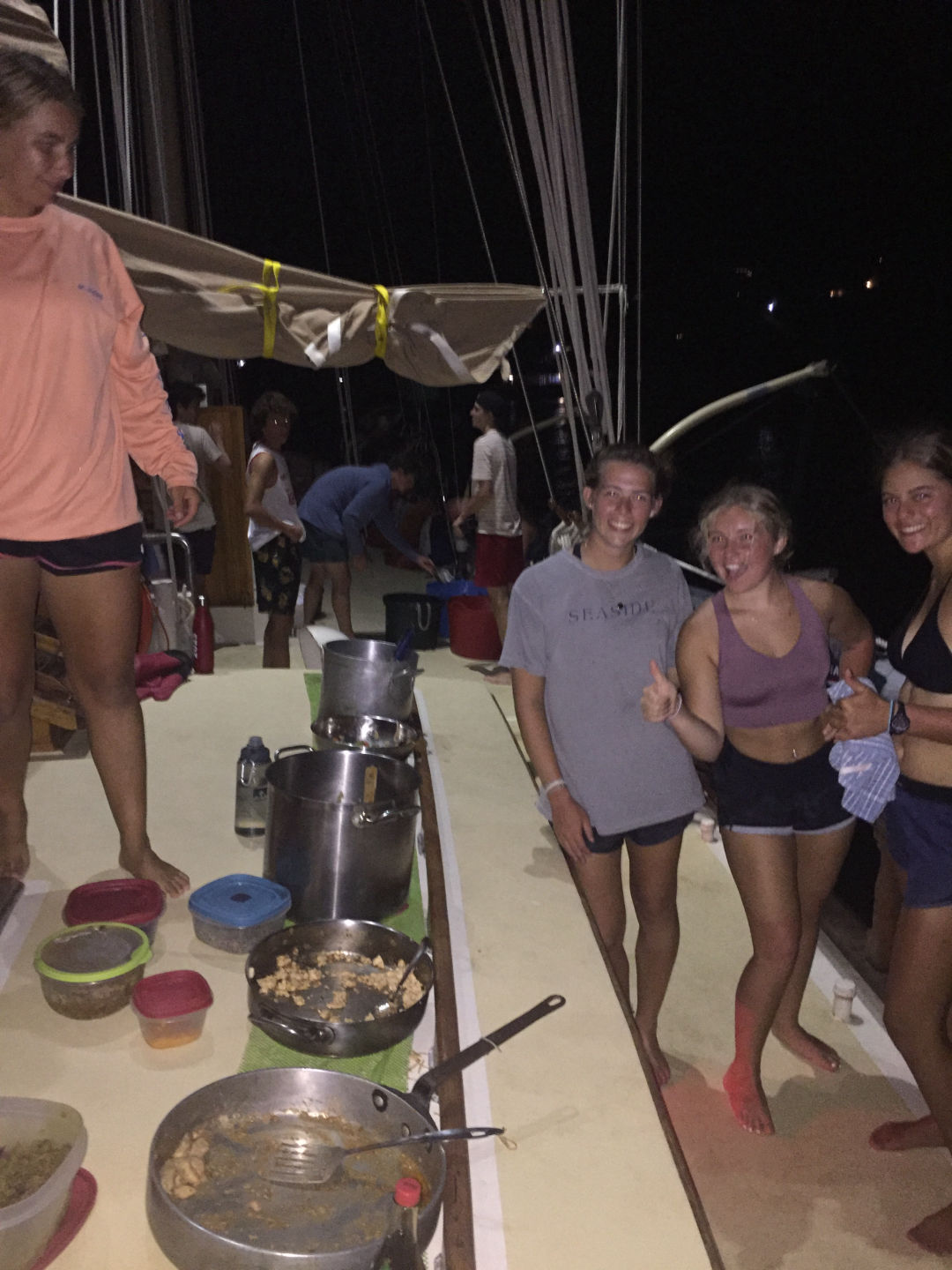 We did it! And what a day it was. For those not PADI certified yet, we had our first open water dive. Down about 7 meters, the world was transformed. As we became more comfortable in our surroundings, the underwater world came to life. That’s not to say that clearing our masks of salt water wasn’t a bit uncomfortable, but learning the skills to be a successful diver just means we will have more enjoyable dives moving forward. The day started with our first student chefs making breakfast, and let’s just say those eggs were some of the best I have ever had. Huge shout out to head chef Mike and sous chefs Selin and Alaina for making three incredible meals. Now that the job wheel has been changed to include both students and staff, it has me wondering (and slightly worrying) what meals I will be prepared when my turn comes around. While the scuba learners were diving, those already PADI certified learned a bit of seamanship by helping put on the main sail. They also got a dive of their own, with highlights being lobster and boxfish. Those learning to dive were in the water all morning and afternoon. It was definitely a bit exhausting, and we might be struggling to keep up with our water intake. Highlights from our dives included a stingray and other adorable reef fish, along with successful descents and ascents. With Megan giving us our intro to marine biology class before dinner, I am sure we will be able to identify all the fascinating critters we see in no time. We are definitely starting to experience both the highs and lows of the long days. Guigo was particularly excited learning that his home soccer team won their national championship. But scattered around the smiles are a few tired faces and some sunburnt backs and hands (sorry, Dad, I am trying my hardest not to burn too extensively). Boat showers are also quickly becoming my preferred shower method, although the saltwater has mixed consequences on the hair. Overall, we are settling into our jobs and routines, and I am only growing more excited for all the adventures still to come.