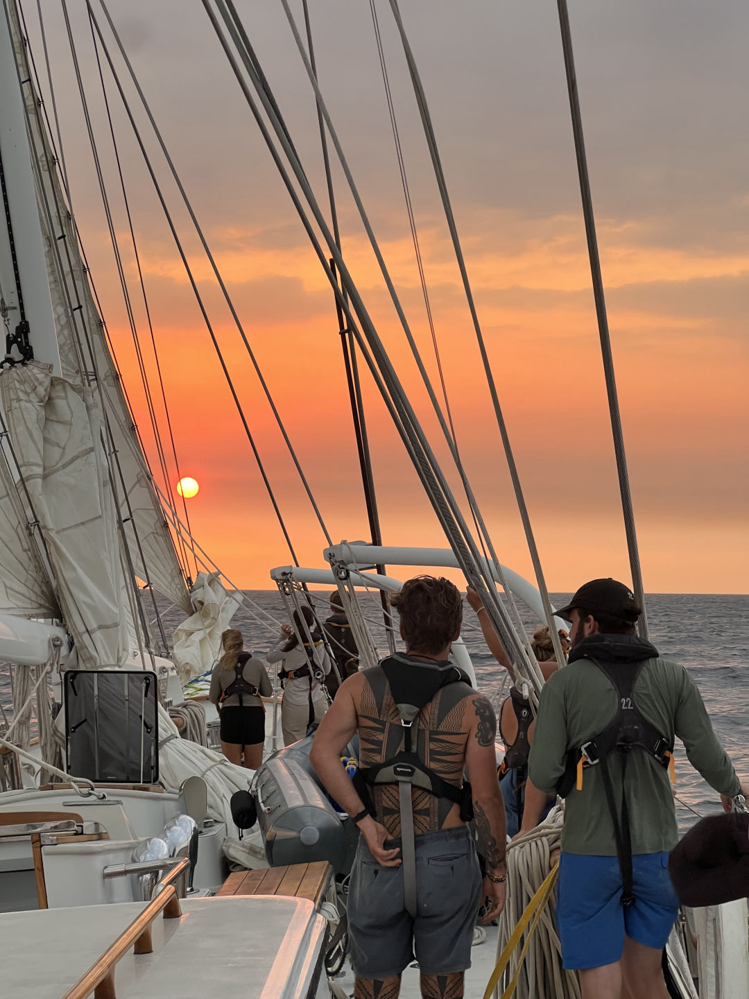 After dinner, we reefed the main sail together (no watch team discrimination) and enjoyed the sunset, which was beautiful and set in front of the bow. The squeeze question was, “what can’t you do that others find easy.” Three people could not whistle (Cosmo, William, and Allie). They ended the squeeze together by failing at whistling. We also learned Ula wasn’t able to blow her nose as a child. Gubby and I have been deemed physically incompetent, as she is unable to do sit-ups, and I can’t do push-ups.