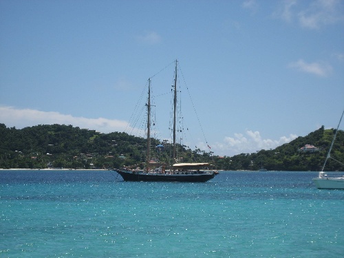 This morning, Beaker, Des, Kat, Holly, and I woke up at 5 am to dingy over to an Island for a 40-minute run/swim, and Simon and Ryan went out for a fish. When we got back, we feasted on cereal and got ready for class. After Oceanography and MTE class, we moved the boat over to Sandy Island for an afternoon of games, sunbathing, fishing, snorkeling, and swimming. Around mid-afternoon, we headed back to the boat and chilled on deck with Simon and myself playing our guitars. Then we motored round to Hillsborough Bay for the evening. After dinner, we had an Oceanography Quiz and then settled down and relaxed in front of a Blue Planet video.