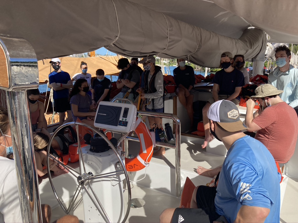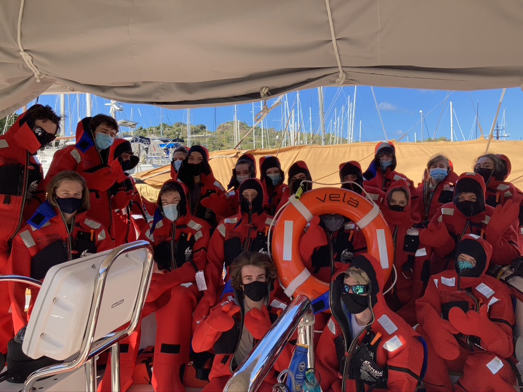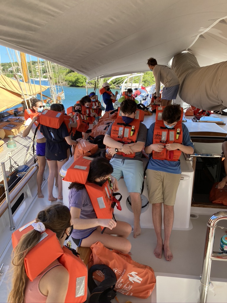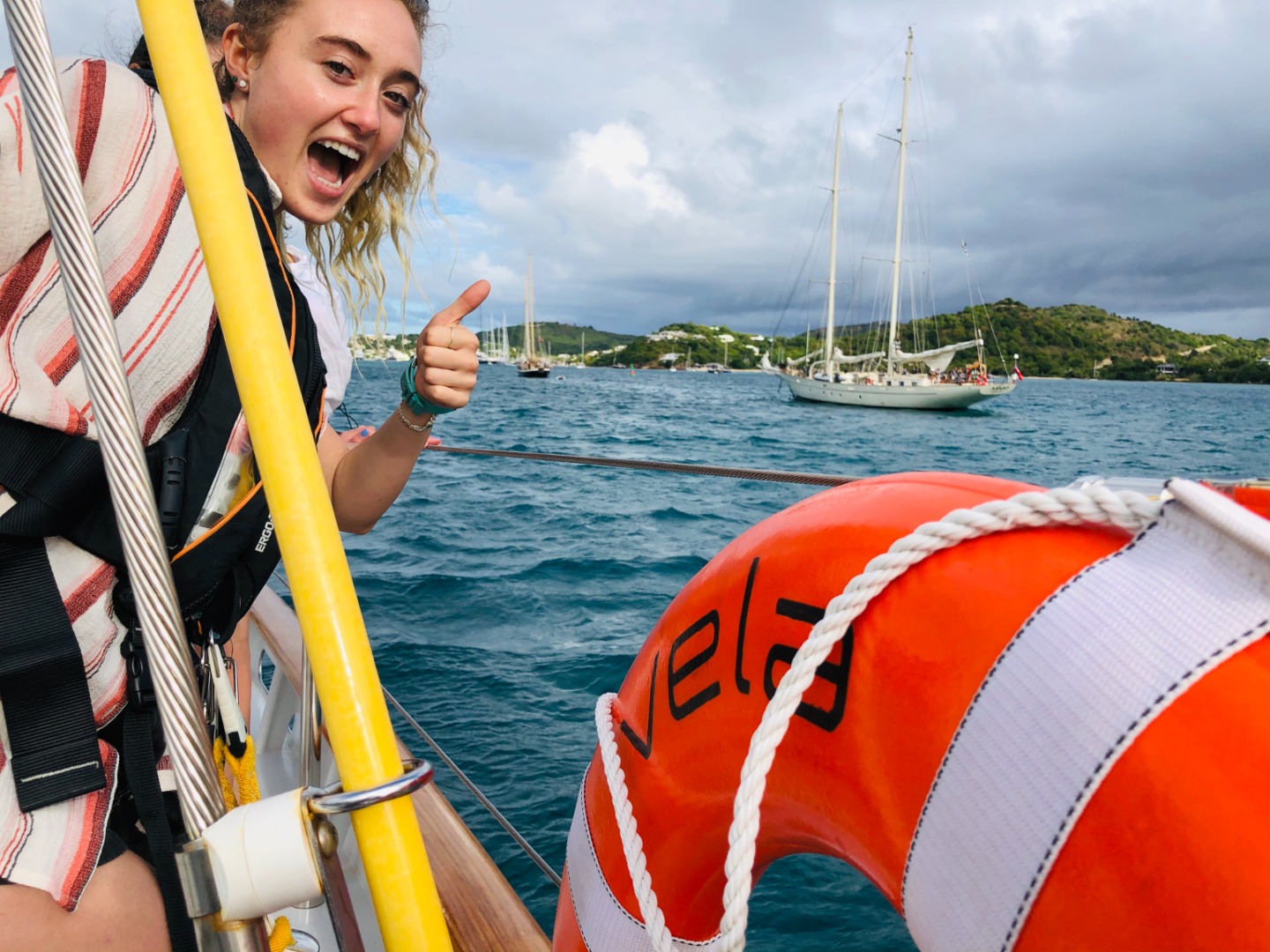 Today was our first full day on Vela, and it was fantastic! Today we were given a full crash-course on our jobs and on what we should do in the event of an emergency. We were given a full rundown on the different parts of the ship as well as their function; we were also informed on the proper strategy and procedures to take should we find ourselves in an emergency. We also were finally able to sail Vela today (under power) to Falmouth Harbor, just around the corner from English harbor, where we were last night. It was amazing to finally be able to sail Vela and see how she performed on the sea for the brief time we were out. The weather today started out as one would expect, with the temperature hitting about eighty degrees at midday. Still, we finally got some cloud cover and a pleasant breeze later in the day that made the heat much more tolerable. Once we arrived in Falmouth Harbor, we conducted a swim test which consisted of three laps around the boat and treading water for ten minutes. We then continued to swim around for a few minutes and enjoyed our first time swimming for the trip. We ended the day with another delicious meal from Shona and a brief from Tom about our new anchor watch duties that we will begin tonight.