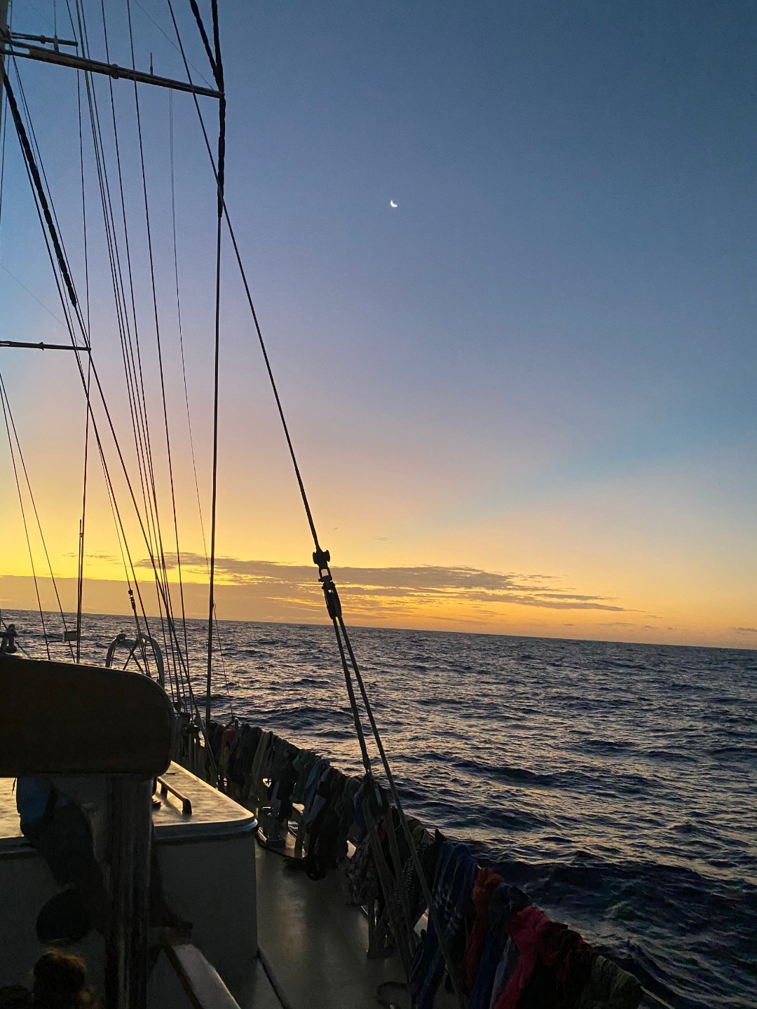 Today we woke up to a surprisingly sunny and hot day compared to yesterday’s stormy day. It’s the first night of this passage that we didn’t get to see any stars at night, but at least we saw hundreds of heat lightning from the far horizon. After Lolo’s delicious lunch, we rolled into clean up and then straight into our Oceanography quiz. We then proceeded to leadership class, where we discussed world problems and how we could solve them. After classes were over, we headed onto deck showers and then dinner. My squeeze question for today was a simple one: “What your favorite job from the job wheel and why?”