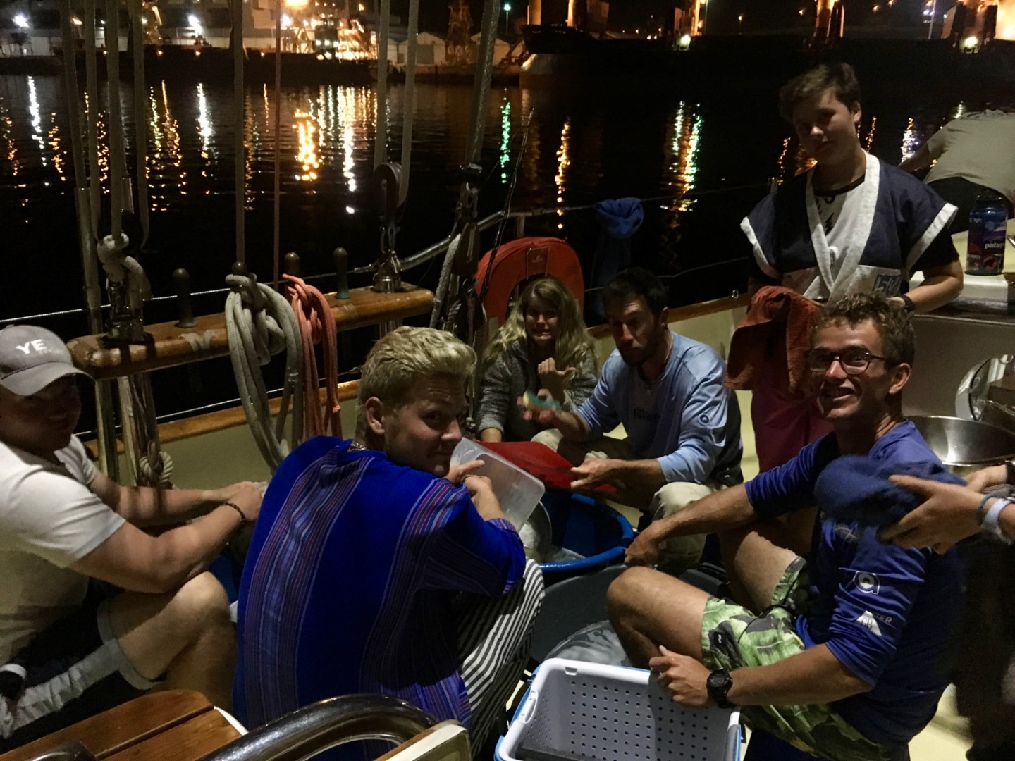 Waking up at midnight or four A.M. while on passage has become second nature to all of us over the past 42 days. We no longer stumble over our boat checks, and switching between helming and bow watch is a smooth process. There are so many more things that go into a successful watch than the jobs we were used to doing, so last night, Captain Wiggy informed us that we would be starting student-led watches. Each team would pick one of its members to be in charge of roughing out transitions between jobs and keeping an eye on the vessels around us. My team, watch team one, took the sunrise shift. I was asked to lead the watch and learned about how our boats radar works, how to judge if you are on a collision course with another vessel, and how to estimate the distance between you and passing boats. It was incredibly interesting and made me appreciate the amount of knowledge it takes to make our floating home run smoothly.