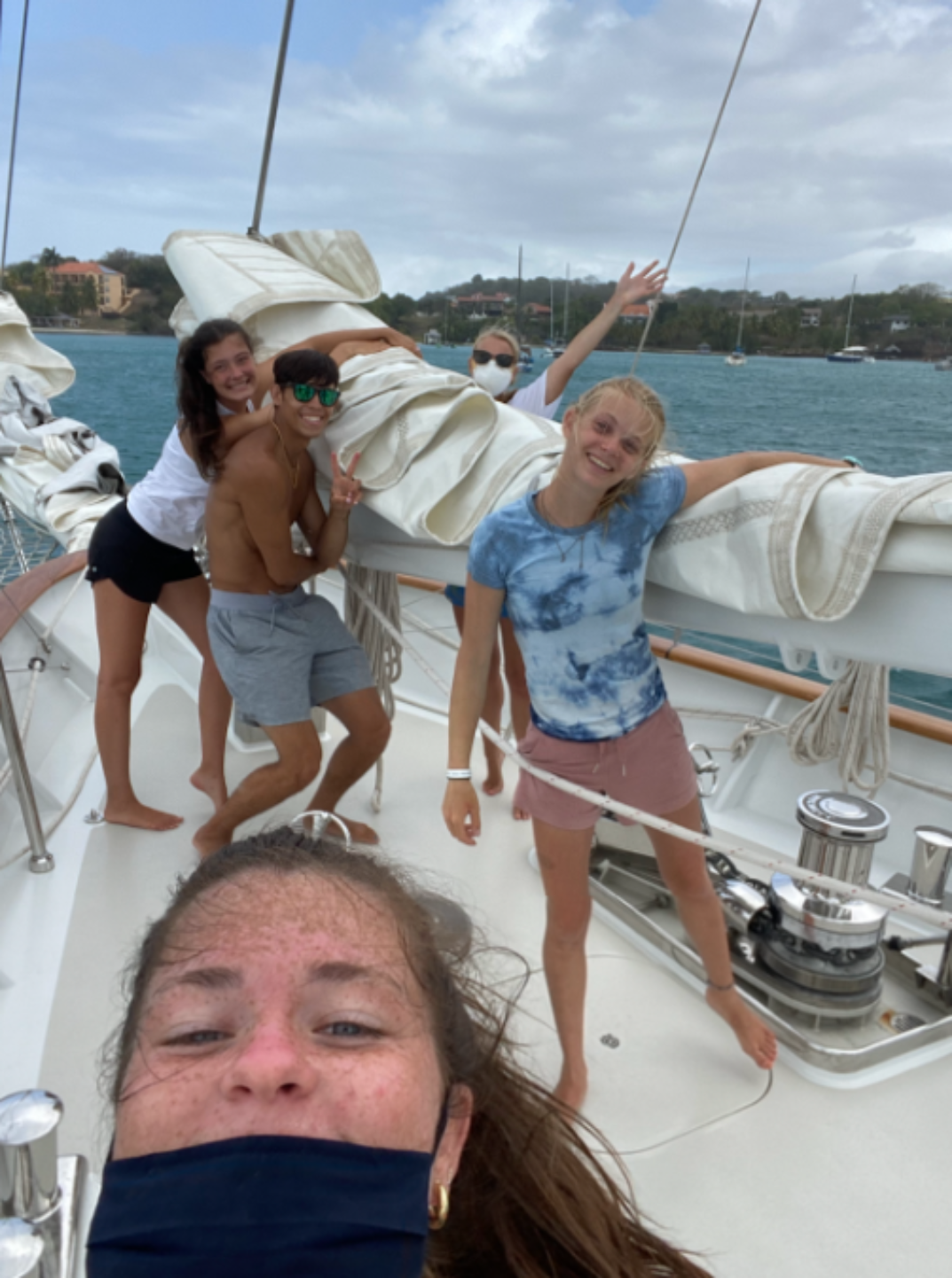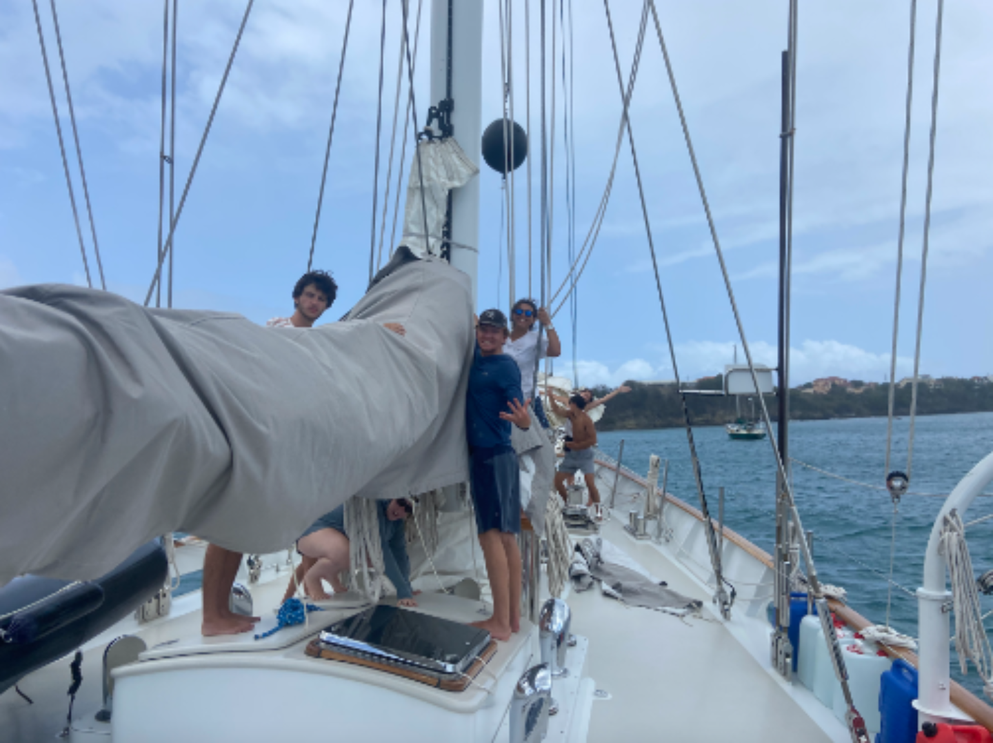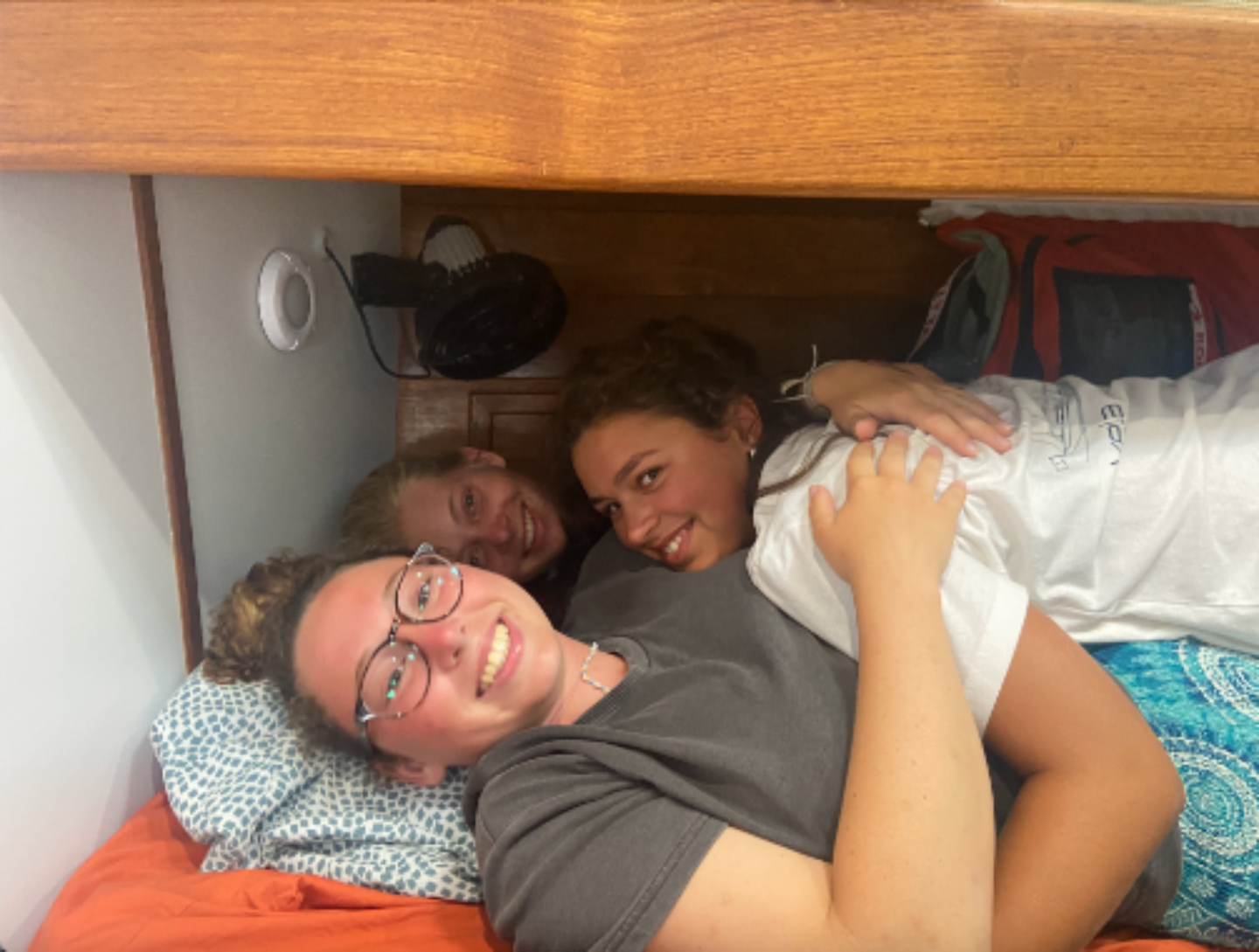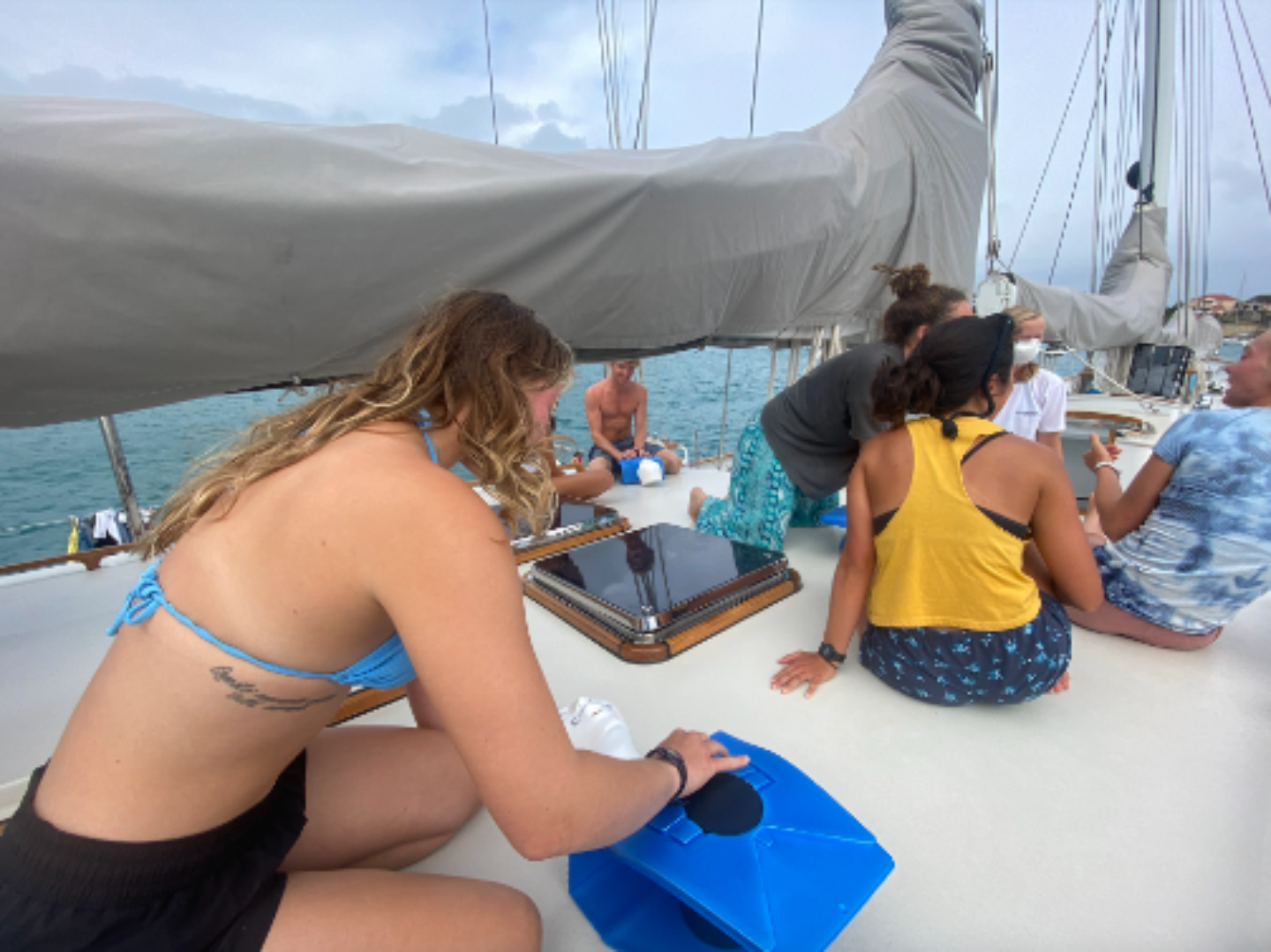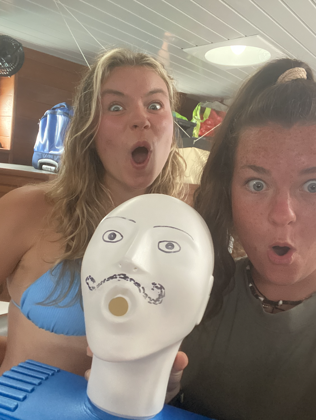 This morning consisted of a late wakeup of 10 AM to Ryans yummy chia seed pudding and last-minute study groups for Oceanography. After taking the quiz, learning about the Coriolis effect, and putting Vela to bed, the team sent off Squiddles, Issy, Sharp, Cah-ro-lyn, and Bearded Nick for doctor visits and provisioning. Everyone else then gathered in the salon for Emergency First Responder class with the one and only Calum, aka sweet cheeks. We had SO much fun learning the log role, how to use an AED, and most importantly, CPR. CPR dolls were brought up on deck, and everyone grabbed a buddy to begin practicing. To give you an idea of how it went, Audrey decapitated John-Pierre when trying to get him to wake up, Emma almost got rolled off the boat when being put in a safety position, and Finn attempted a straddling CPR form There were tears in our eyes from how hard we laughed. After EFR materials were put away, we enjoyed ocean games and showers, followed by dinner tacos and dessert tacos (Vela specialty: peanut butter and honey). When provisions came back, music was BLASTING which then turned into a full-on dance party even after the food was away. Overall, today was a perfect day of learning and fun for Vela and her crew.