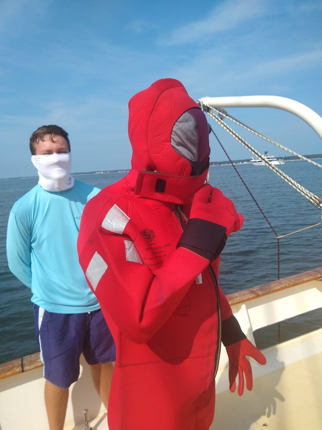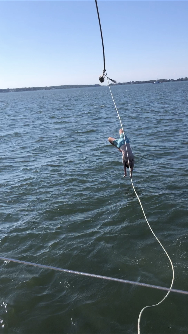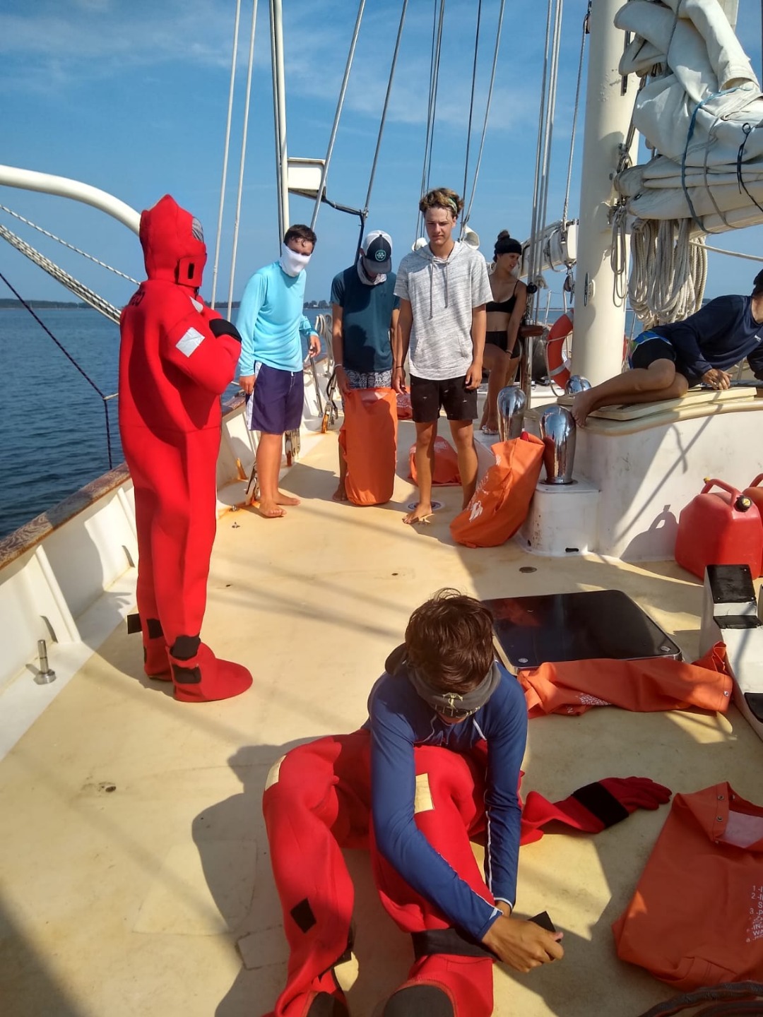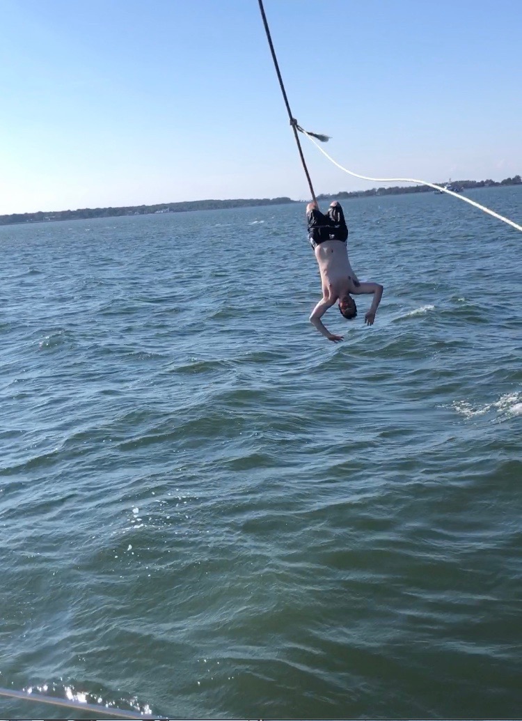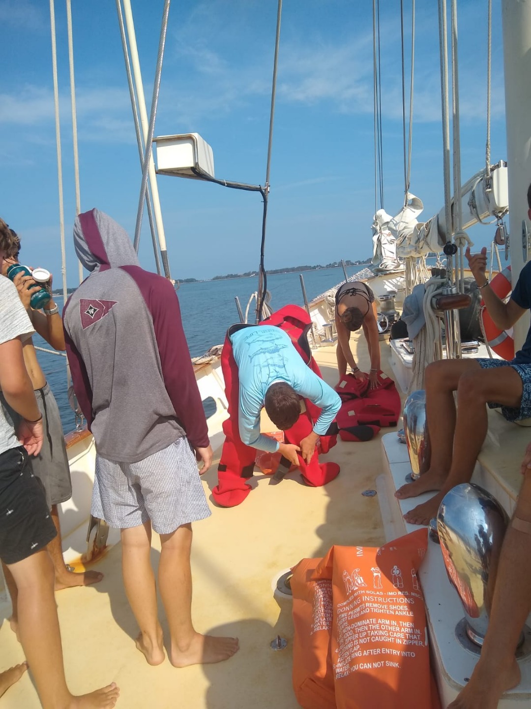 Can you believe it’s day 47? We’ve covered nearly 4000 miles, seen about 700 dolphins, discovered a whole bunch of dive sites, weathered a tropical storm, and transited through one of the most iconic cities in the world. Having said that, I suppose it has been quite action-packed, but it really doesn’t seem like two weeks since we were on the dock in St Pete. Speaking of action-packed, today started with another vintage wake-up. Today my torrent of words was shortly followed by an absolutely terrific Spanish omelet by Smash and Rocco, offering just the hearty start to the day called for in this morning’s Deck’lympics. This consisted of splitting into two teams pitting their wits, teamwork, and tenacity against one another in a contest that will go down as one of the greatest to happen in the state of New York this week. The warm-up round was a race to set the running backstays, followed by an epic battle to fill a bucket on deck with water passed up by sponge from a dinghy. I didn’t see any of this happening, but from what I could pick up, it sounded rife with controversy as several of the competitors were accused of moving whilst having the sponge in hand – a cardinal sin in the Deck’lympics. This was followed by a blindfolded Gumby suit and bowline competition.