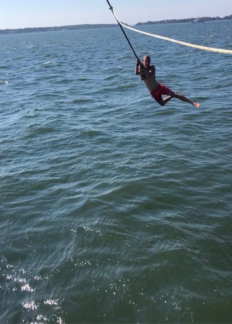 This afternoon everyone put in a really solid push in beginning our end-of-semester boat clean, which was rounded off by the long awaited set up of a boom swing. To the uninitiated, this entails lifting up the boom to about 45 degrees and then pulling it right out so as to be able to use a line on the end as a wicked big swing.