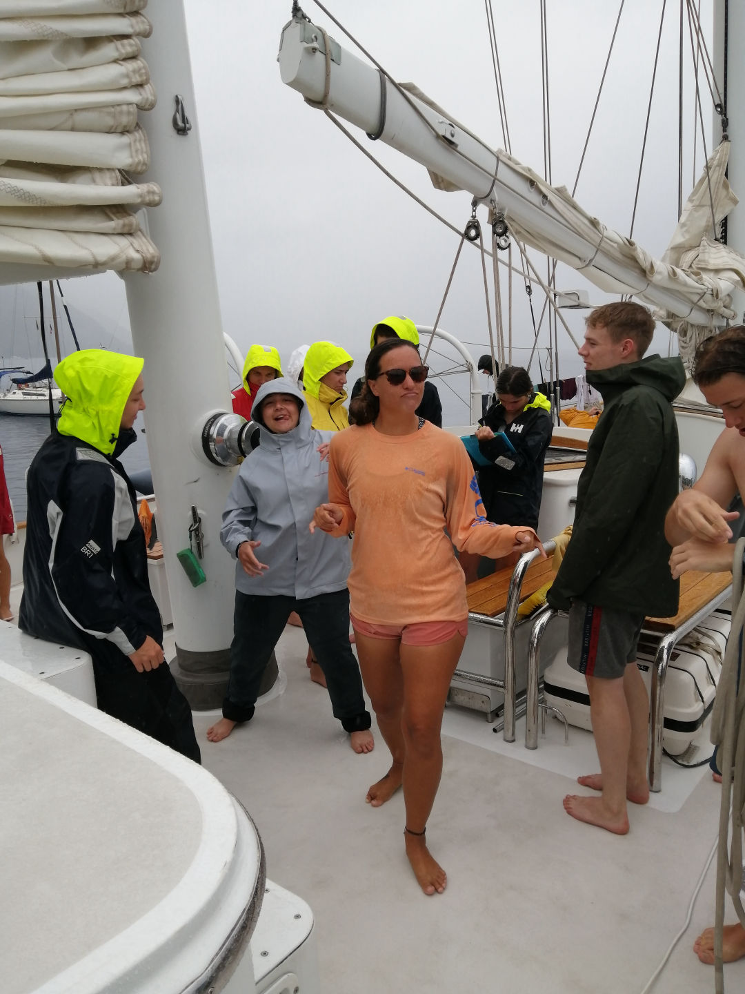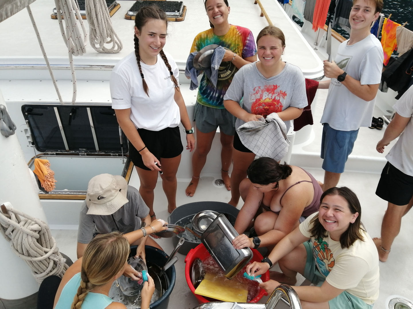 Today we woke up to a local Hawaiian breakfast with fried eggs, rice, seaweed, and fresh fruit. We jumped into passage prep in the rain, where we took the sail covers off and put the ribs on decks, reattached halyards, and re-ran sheets. We blasted music and danced in the rain to make it more fun. Then Steph briefed us on the dives for the afternoon. We had lunch of deli sandwiches and chips. We headed over for two dives for our Advanced Open Water certification – our Deep Dive and Fish ID Dive. We saw lots of colorful fish and coral and played with some eggs underwater. It was the deepest dive we’ve done so far, and then we went to the champagne reef, where bubbles rose all around us as we dived. We got back to the boat, got warm and showered, and had a lovely dinner of veggie soup and freshly baked bread rolls courtesy of Toria and Kirby. Then we got off the dock, said goodbye to Dominica, and headed out for our first long passage to Bonaire. I had watch from 8-12, saw a few shooting stars, raised the main staysail and both jibs with watch teams 2 and 3, and enjoyed the first hours of passage.