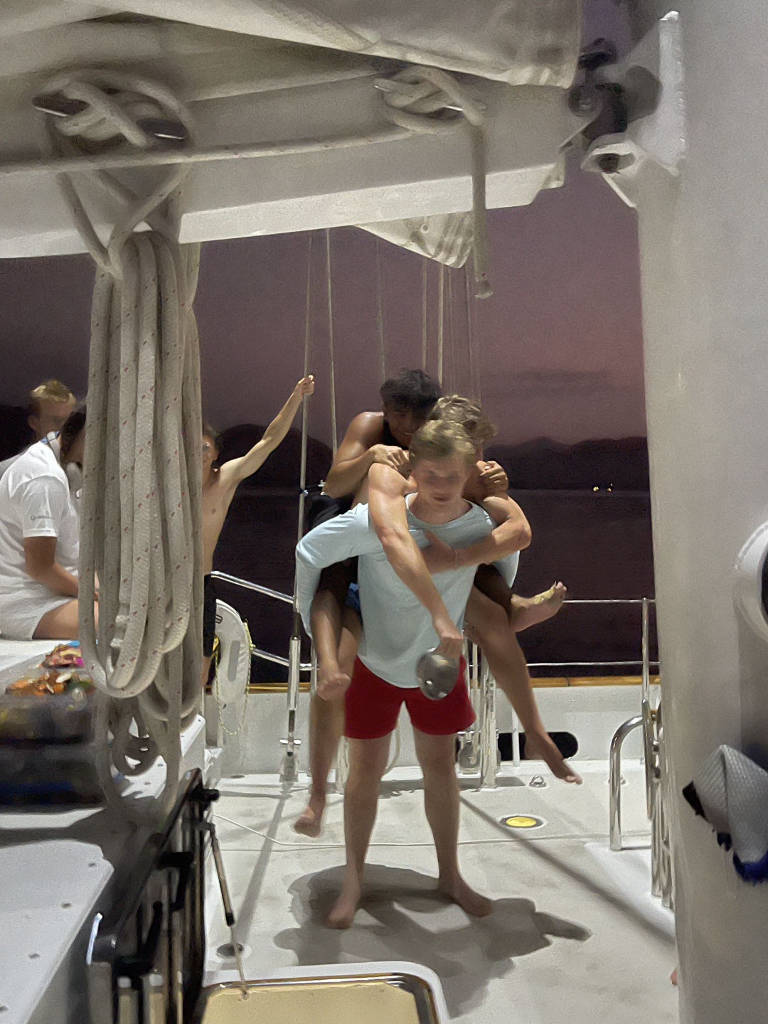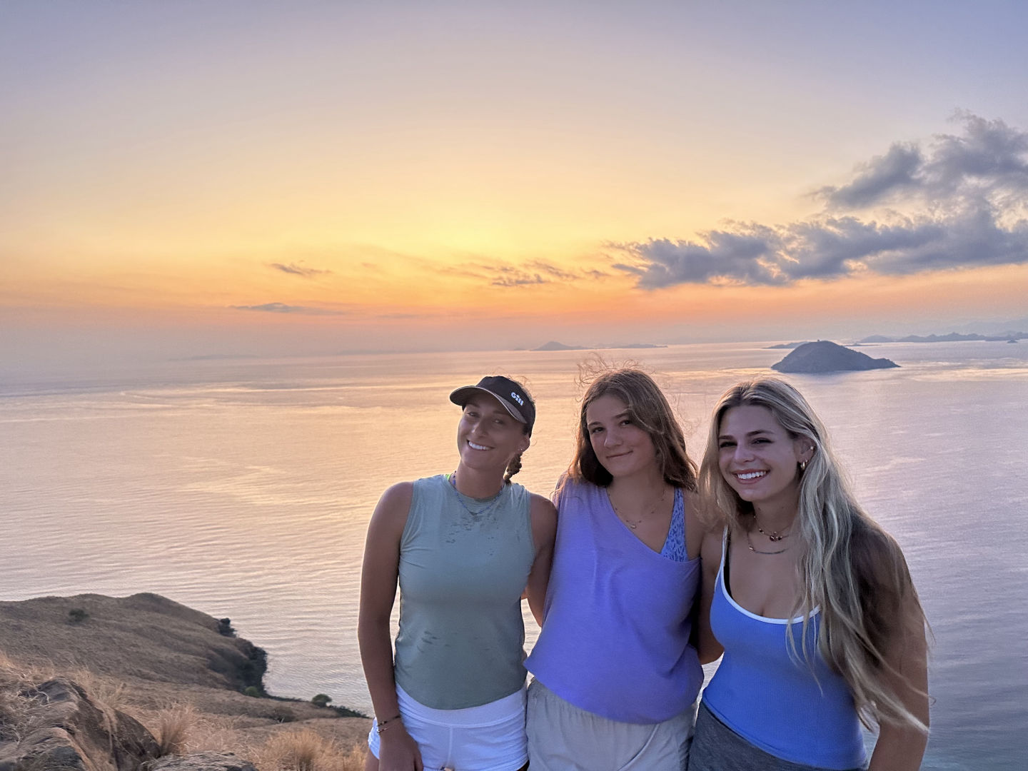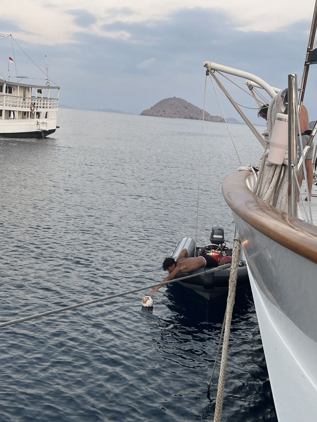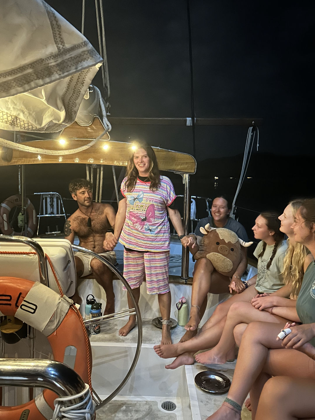 After we were full of pesto pasta, they headed into Oceanography class, where they learned all about the layers of the Earth and how scientists figured out how Earth’s crust has moved and changed over millions of years. Then, everyone headed back up on deck for a quick Seamanship lesson on pin rails and cleats before we departed for Bali. We also did a MOB (man overboard) drill today, with Allie as our fake MOB. This time, we practiced having Jake, our rescue swimmer, in the water who swims out to the MOB and brings them back to the boat, where we all worked together to hoist them up back onto the deck of Vela. Then it was time to watch our last sunset in Komodo, where we were surprised by a big pod of dolphins that came super close to the boat and kept surfacing for the whole hour before dinner as the sun went down. Dinner was served, and everyone thoroughly enjoyed their tacos and got excited for a squeeze. I warned everyone at breakfast that the squeeze was going to be show and tell tonight, so they had all day to prepare. To be honest, I think it was one of my favorite squeezes that we’ve done. Things ranged from my cow Squishmallow named Marvin and Ben’s engraved Swiss army knife from his dad to Allie’s dula mimi (photo included) and Kasey’s mini telescope. Now, everyone is bustling around me to get the cleanup finished so we can hop off this mooring and start our journey back over to Bali.