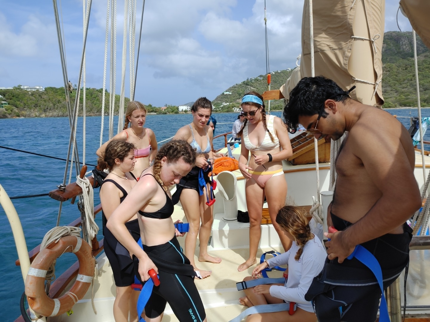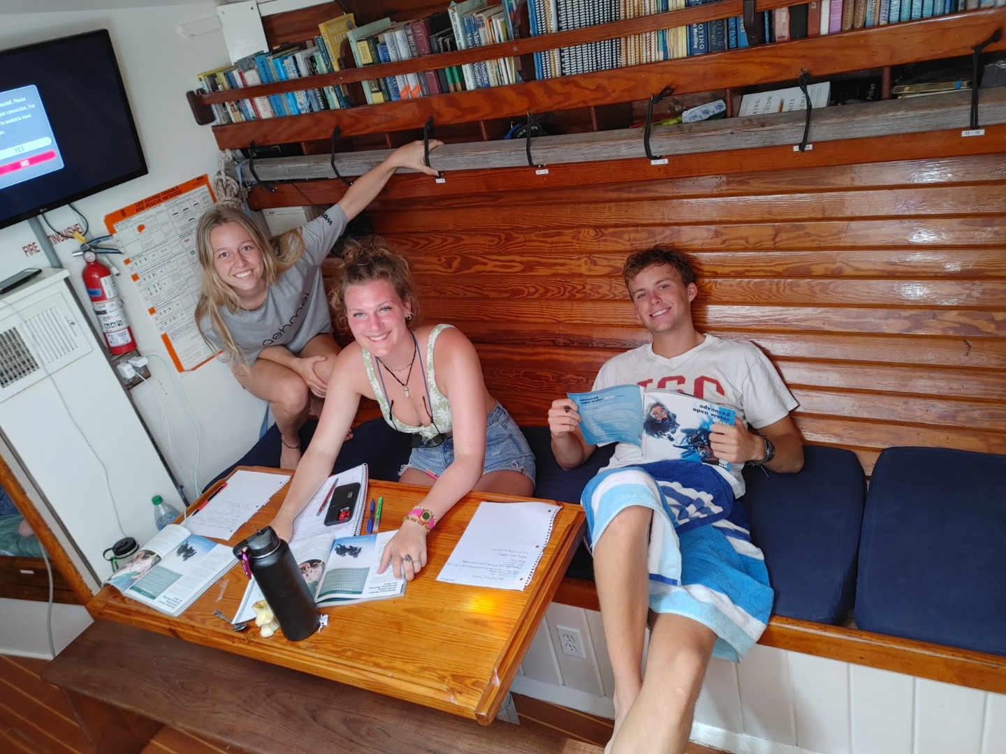 The day began as it always should, with everyone waking up to the vocals of Bon Jovi’s Livin’ on a Prayer. Although some were hesitant, the breakfast, including sausage (of the meat and vegetarian variety), brought smiles and full bellies to the crew for the very busy day ahead of us. Those who are working on their Open Water Scuba certifications went out on Irv and Exy for their first skills dives! They all enjoyed breathing underwater for the first time and can’t wait to do it again tomorrow.