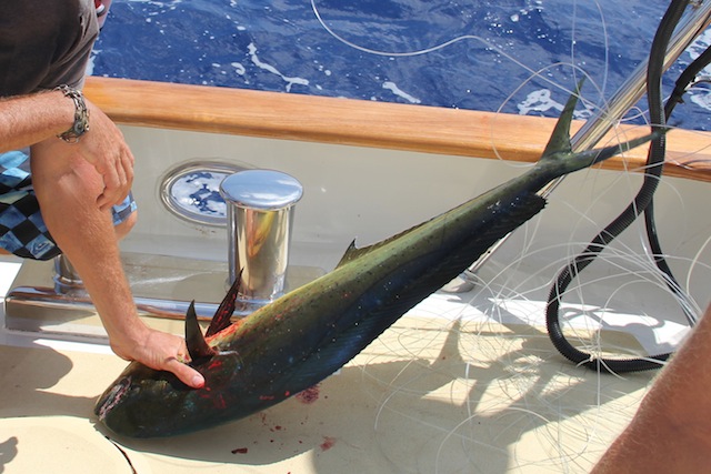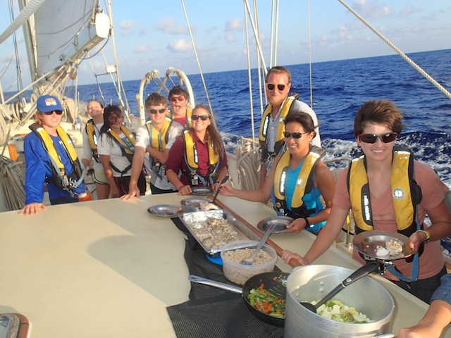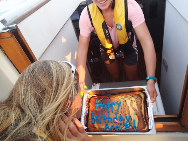 Today (whichever day we are saying this is) was definitely a day of firsts on Argo (Does that mean I’ll wake up tomorrow on the 17th of February, hopefully?). We caught our first fish worthy of Argo’s oven: a gorgeous Mahi Mahi. If you have ever read The Old Man and The Sea, then you know exactly how this fish fight didn’t go down. From what I hear (which isn’t much in my current situation), the fish was boated (and put out of its misery) about as quickly as you might expect a Toblerone to vanish during 3rd-grade recess. And if that isn’t painting the mental picture for you, it was clocked somewhere in the vicinity of 43 seconds (Give or take a couple of minutes). Also, a first on Argo (and maybe galactically- who would have thought that galactically is not a word? That’s kind of weak), the shipmates took a stab at the answer to life, the universe, and everything. No, wait, sorry, not the answer, the question. I mean, we already know that undeniably, unquestionably, and unequivocally, the answer to life, the universe, and everything is 42, but to what question is that the answer? Today such possibilities were offered as: How many licks does it take to get to the center of a tootsie pop? How many pieces of chocolate can one eat before taking a three-minute break? & How many fish will get away from Jack before we get to Borneo (by my best estimate, that count is now at 11)? So, all in all, think we’ve got it nailed down almost perfectly. And, after closing the day with a piece of delicious freshly-baked brownie cheesecake (created by scratch by Carolyn to celebrate Annie’s Birthday), I’m pretty sure that I’ll wake up tomorrow on a brand new day (mostly because I plan on putting a significant amount of time towards fixing my watch tonight). Although, I did happen to chase a few dolphins around after dinner (yes, that might be a confession). This is Skipper of the Day, Hunter Stanley, signing off from 04 degrees South of the Octopus’s Garden and 17.014 Minutes East of Margaritaville.