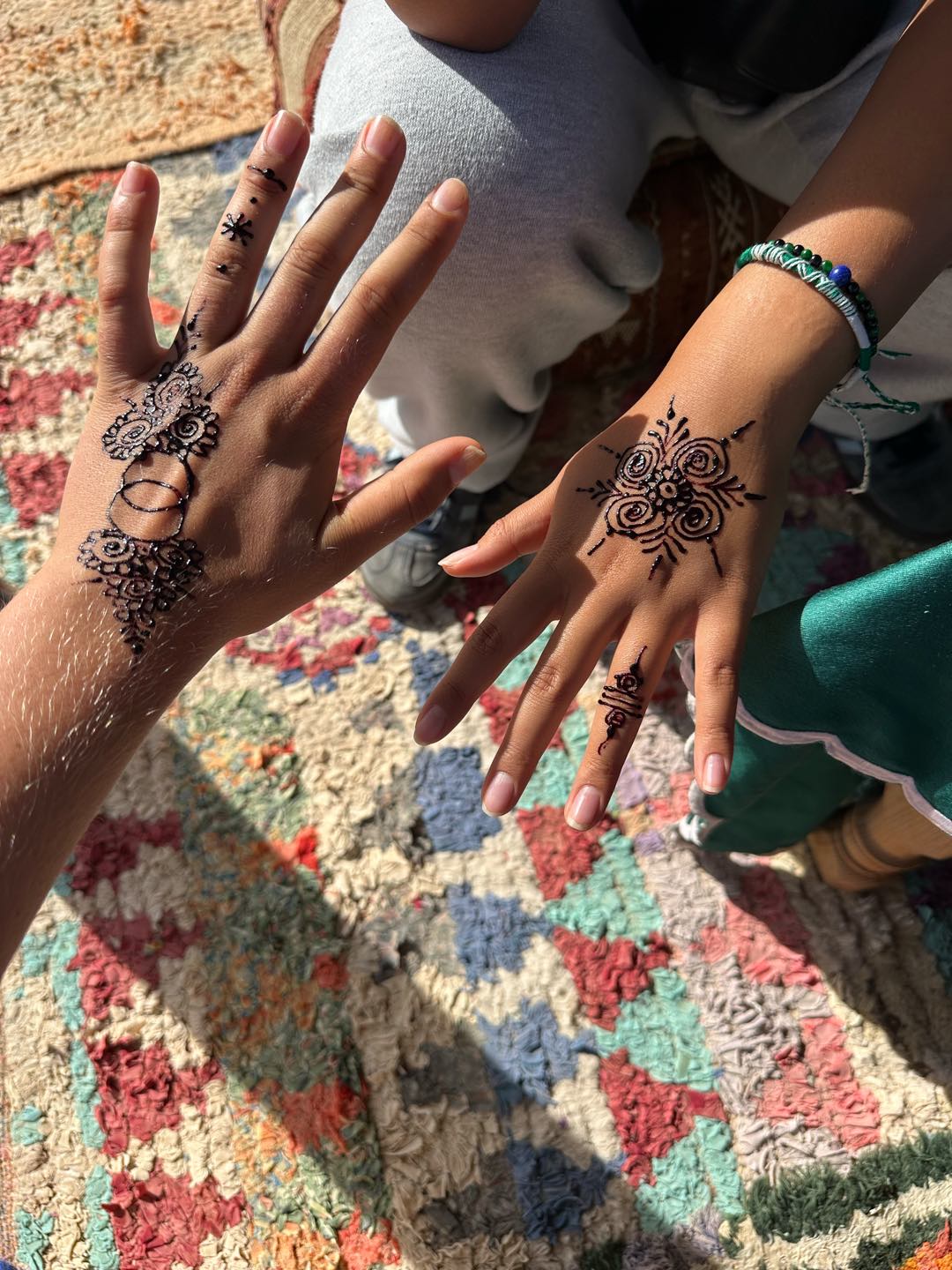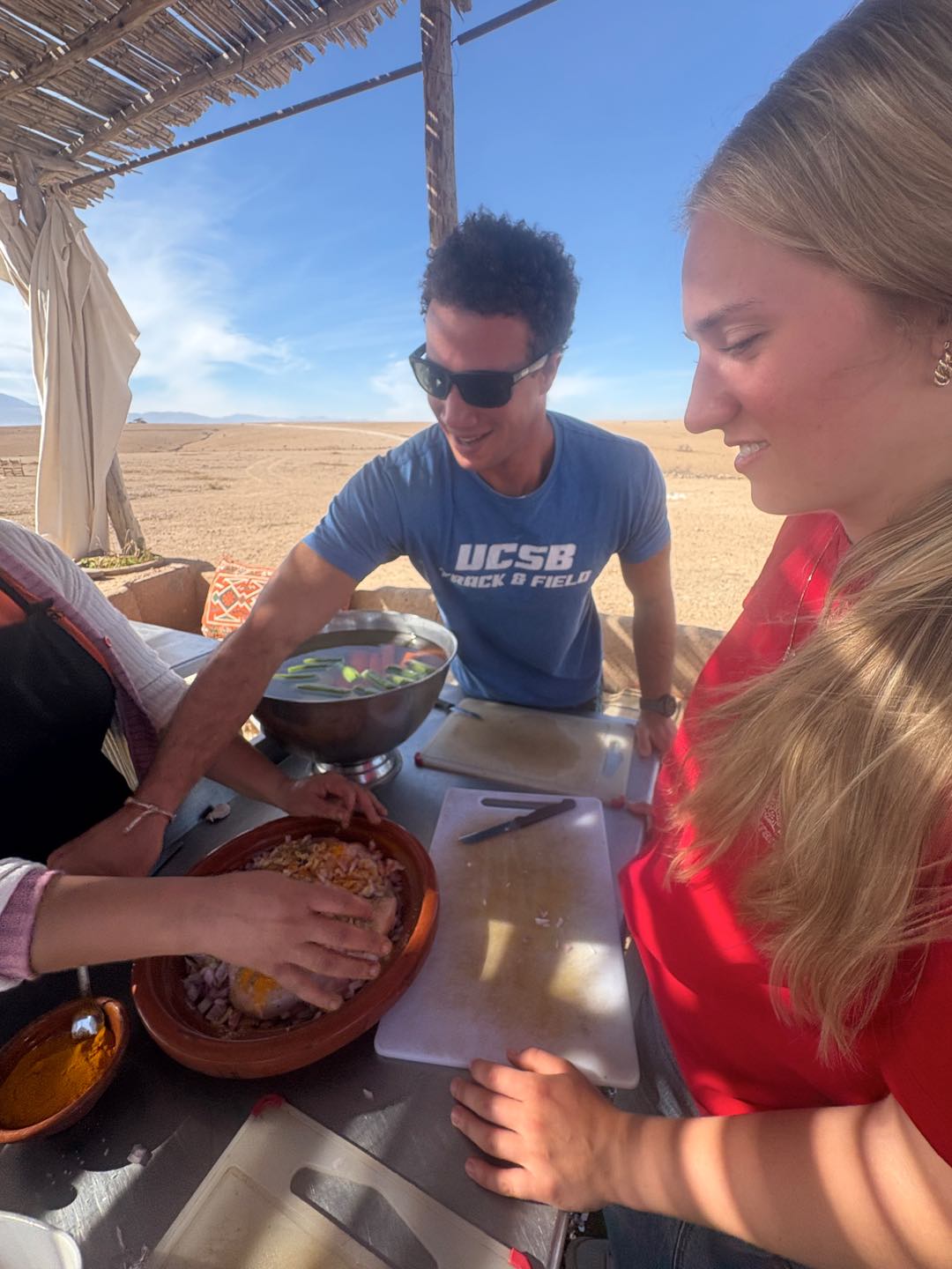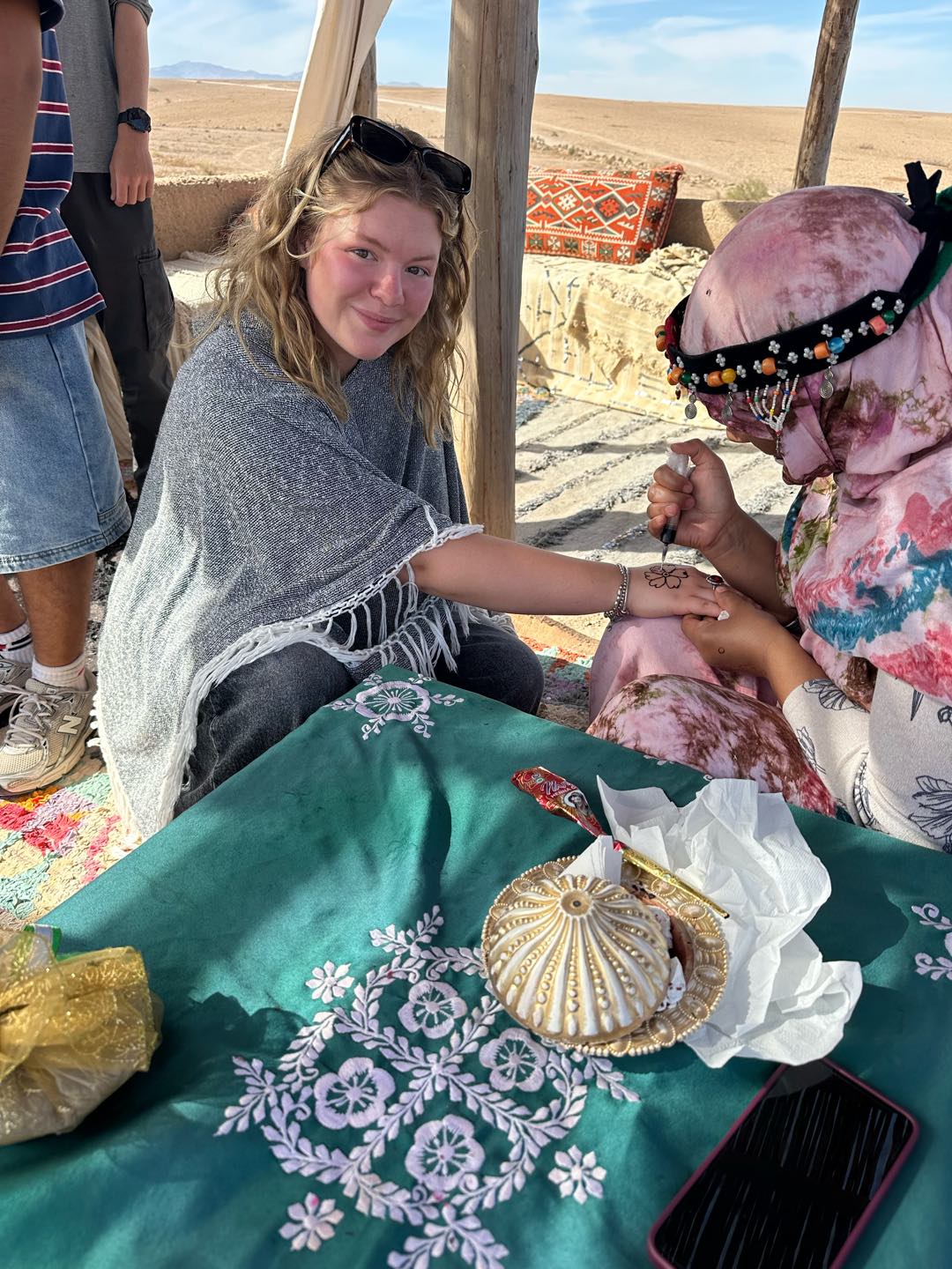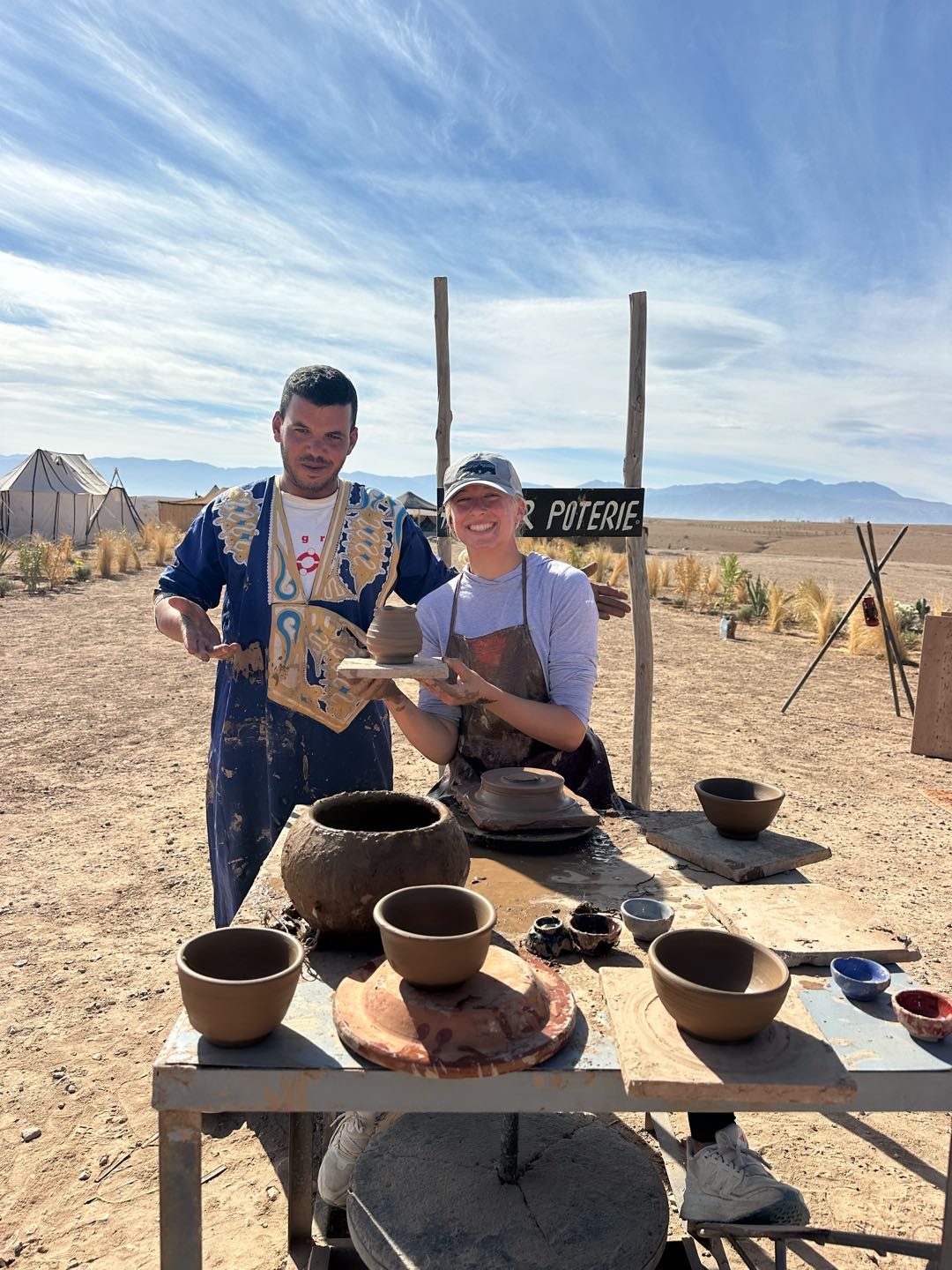 I woke up to the cries of roosters and the chill bite of the morning desert air. I made my way outside, where I found Alexa, Amelia, and Hailey, who had watched the sunrise. I walked a lap around camp, taking in the beautiful view of the mountains, which reminded me of home. Then we all gathered for breakfast, which consisted of crepes, bread, and eggs. The meal was served slowly, each course coming one at a time, which gave us time to sit and enjoy each others company. After everyone had split up for different activities. Cameron, Hailey, Maria, Jem, and I did some pottery. Sabrina, Emily, Fish, Maria, others, and I all got Henna. The lady had us sit and give her a hand. From there, she free-styled, doing a unique design for each person. Others did other activities, such as cooking or a massage (Ben finally got his massage!), and Rachel went for a camel ride! After my activities, I went for a walk in the desert with Sam, Maria, and Nacho. We spotted snail shells, different animal tracks, and rocks. Once we got back, we loaded up the vans and made the three-hour trek back to Argo. I enjoyed taking in the Moroccan countryside by looking out the window and got a great nap. We finished the evening with Shanes delicious curry and rice. Until next time, Morocco.