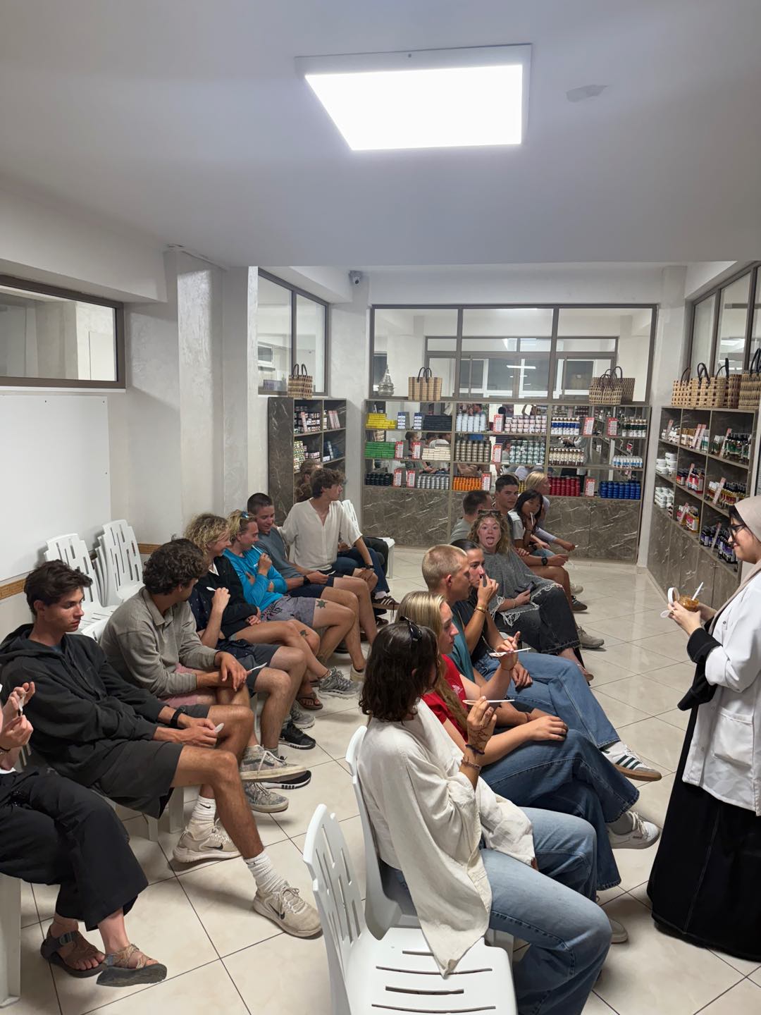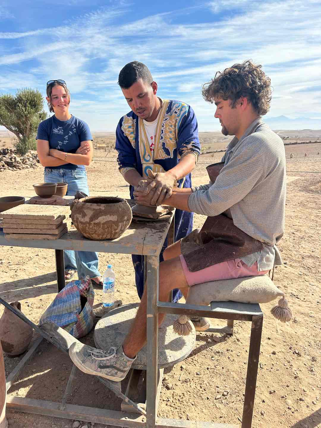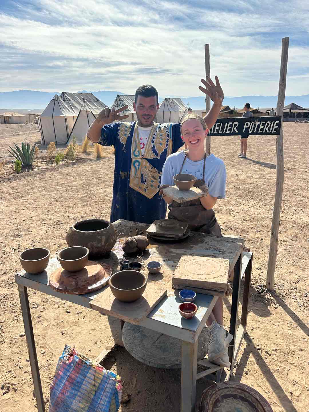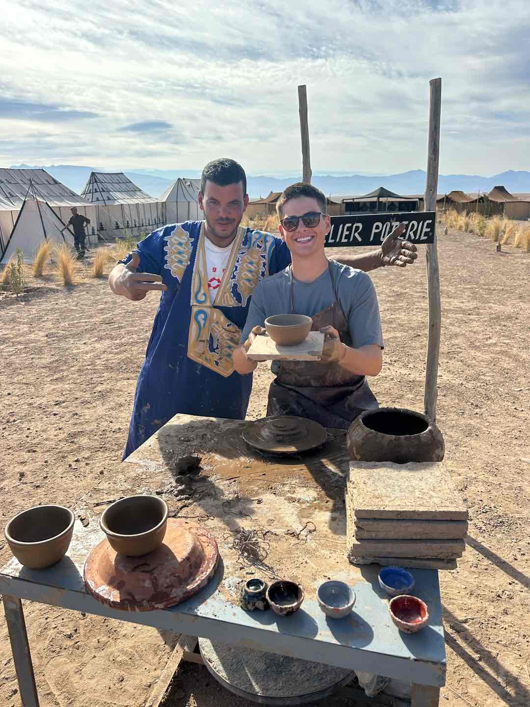 I woke up to the cries of roosters and the chill bite of the morning desert air. I made my way outside, where I found Alexa, Amelia, and Hailey, who had watched the sunrise. I walked a lap around camp, taking in the beautiful view of the mountains, which reminded me of home. Then we all gathered for breakfast, which consisted of crepes, bread, and eggs. The meal was served slowly, each course coming one at a time, which gave us time to sit and enjoy each others company. After everyone had split up for different activities. Cameron, Hailey, Maria, Jem, and I did some pottery. Sabrina, Emily, Fish, Maria, others, and I all got Henna. The lady had us sit and give her a hand. From there, she free-styled, doing a unique design for each person. Others did other activities, such as cooking or a massage (Ben finally got his massage!), and Rachel went for a camel ride! After my activities, I went for a walk in the desert with Sam, Maria, and Nacho. We spotted snail shells, different animal tracks, and rocks. Once we got back, we loaded up the vans and made the three-hour trek back to Argo. I enjoyed taking in the Moroccan countryside by looking out the window and got a great nap. We finished the evening with Shanes delicious curry and rice. Until next time, Morocco.