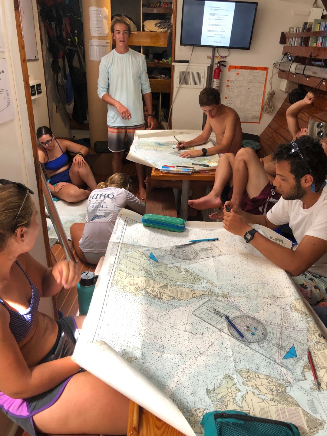 We spent the afternoon continuing our Navigation Master certifications with our first set of hands-on chart work. Calum introduced us to navigational charts, dividers, and Breton plotters. With their help, we measured distances, charted coordinates, took bearings, plotted courses, and learned how to get by on a vessel without GPS! We have a lot more to learn, but our fearless leader’s infectious love for everything maritime with undoubtedly bring us through safely!