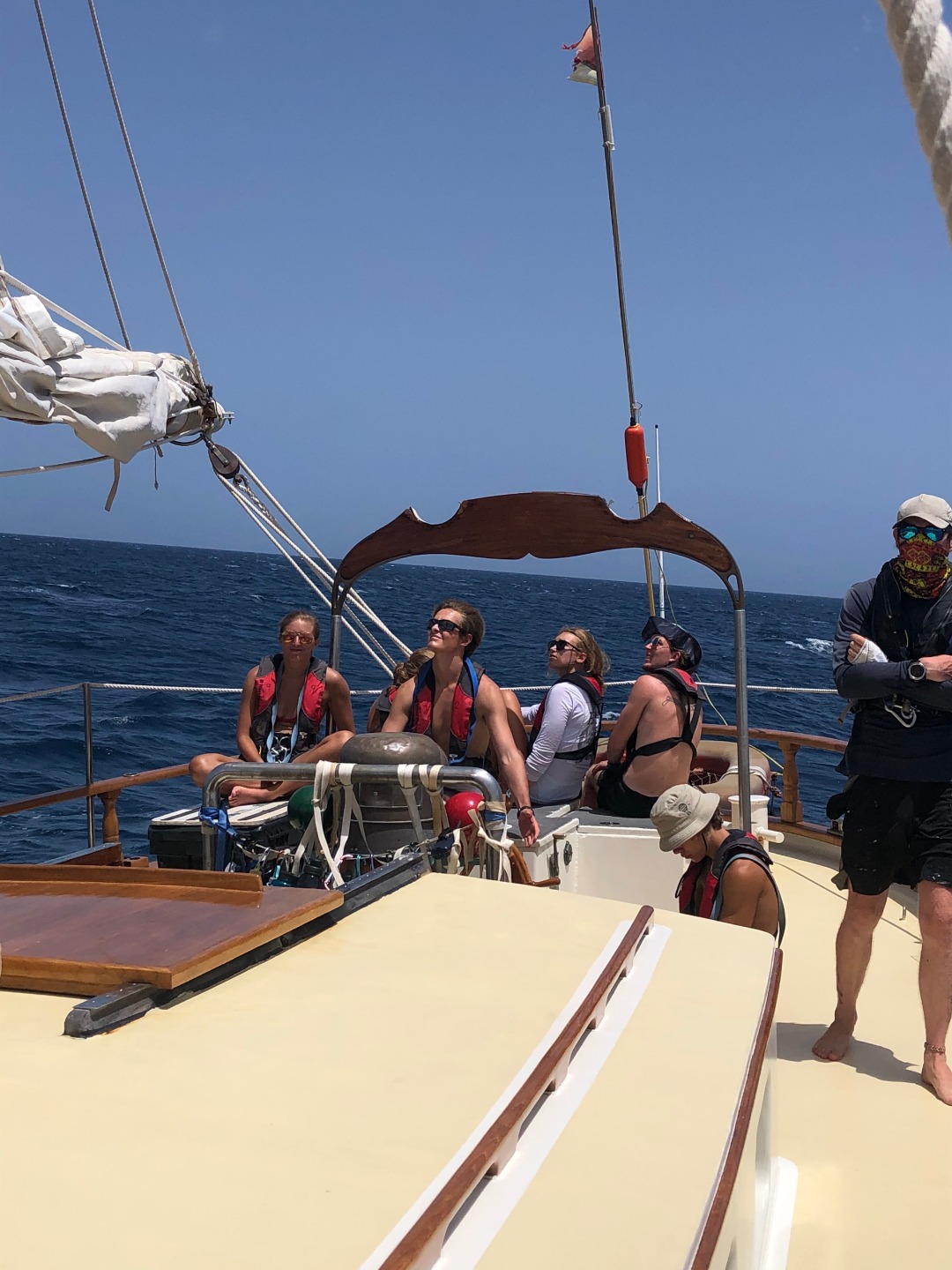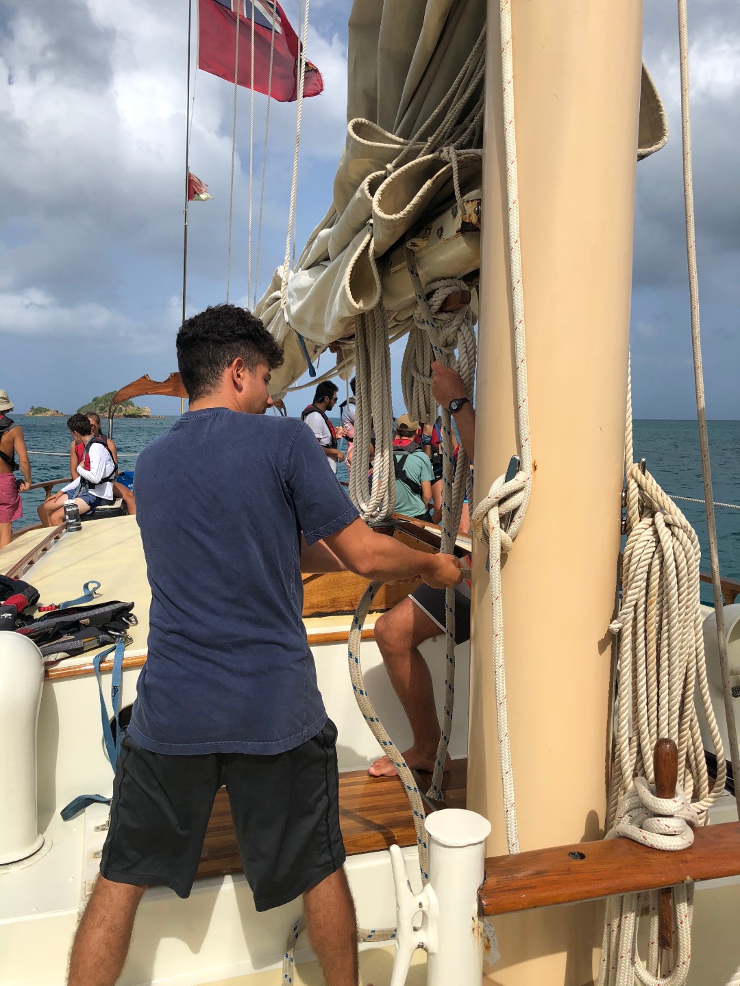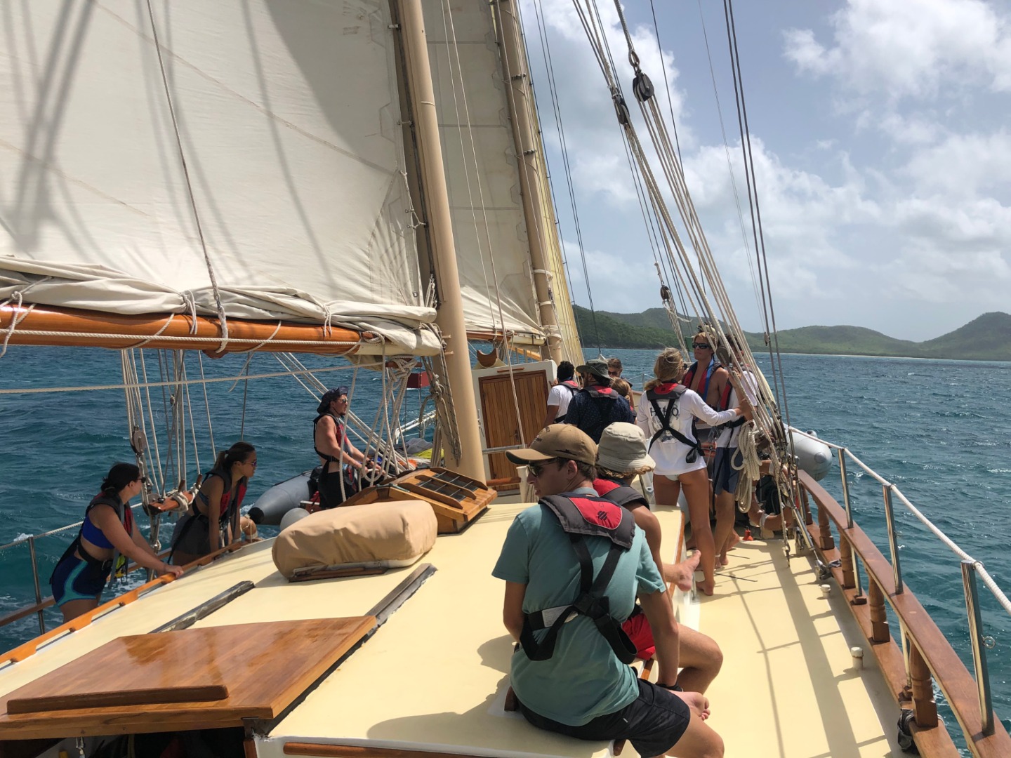 We awoke today to a beautiful Caribbean morning and the smell of Ash’s french toast wafting from the galley: arguably the best way to begin a day. Although the previous night’s storm had blown over, we had some strong, steady winds for sailing, so after breakfast, we took down drying clothes, stowed sail covers, REEFed our sails, and made off for the high sea. This group of charming individuals is starting to work as a real crew! We had a beautiful day sail to Deep Bay, where we now sit resting securely on both anchors and arrive just in time for a fantastic taco lunch.