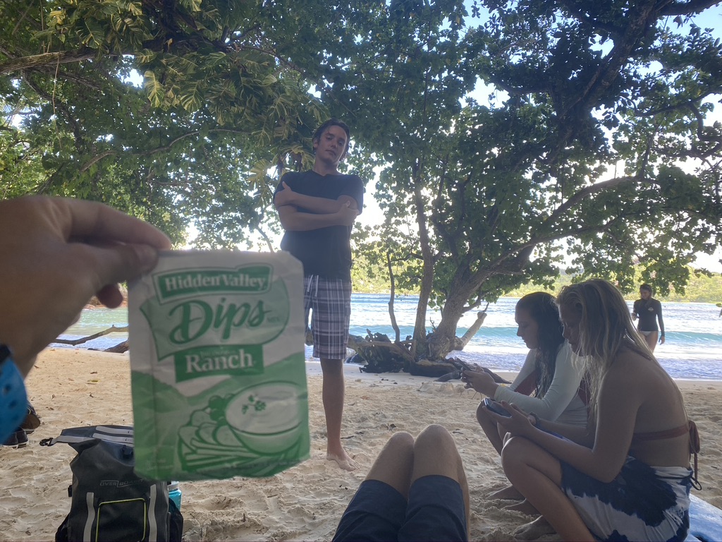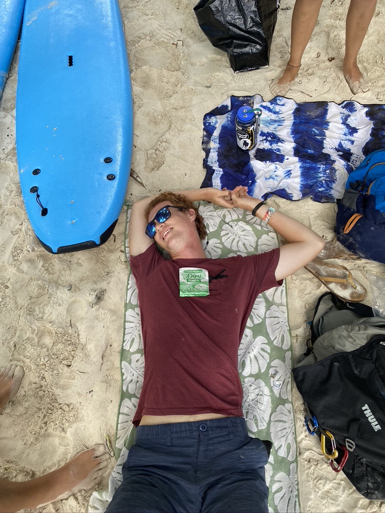 We began the morning with breakfast. Then all the dive groups got ready and headed into the water. Seth completed his open water and now is a certified diver (yay). The advanced open water group (Val, Max, Henry Angi Mads, Cate Carly Emily) begin their course. The rescue team (Trey, Ian, Fin, Robbie, Zack, and Danar 🙂 did more dive training as well. In rescue, we did unresponsive diver on the surface, unresponsive diver getting into dingy, practiced rescue breaths and opening airways, and practiced towing. After all the diving was completed, we all dissembled tanks and weight belts then headed to land for a day ashore. When onshore, Seth and Robbie went on a hike. Carly, Emily Cate, and Bee went shopping, while Mads Henry, Val Angi, Ian, Fin, and I went to lunch at the boathouse and explored the beach area. We all joined back up for a beach dinner and ended the night with a dingy ride home. It was a crazy and hectic day, but we are making the most of our time here before our passage in two days!