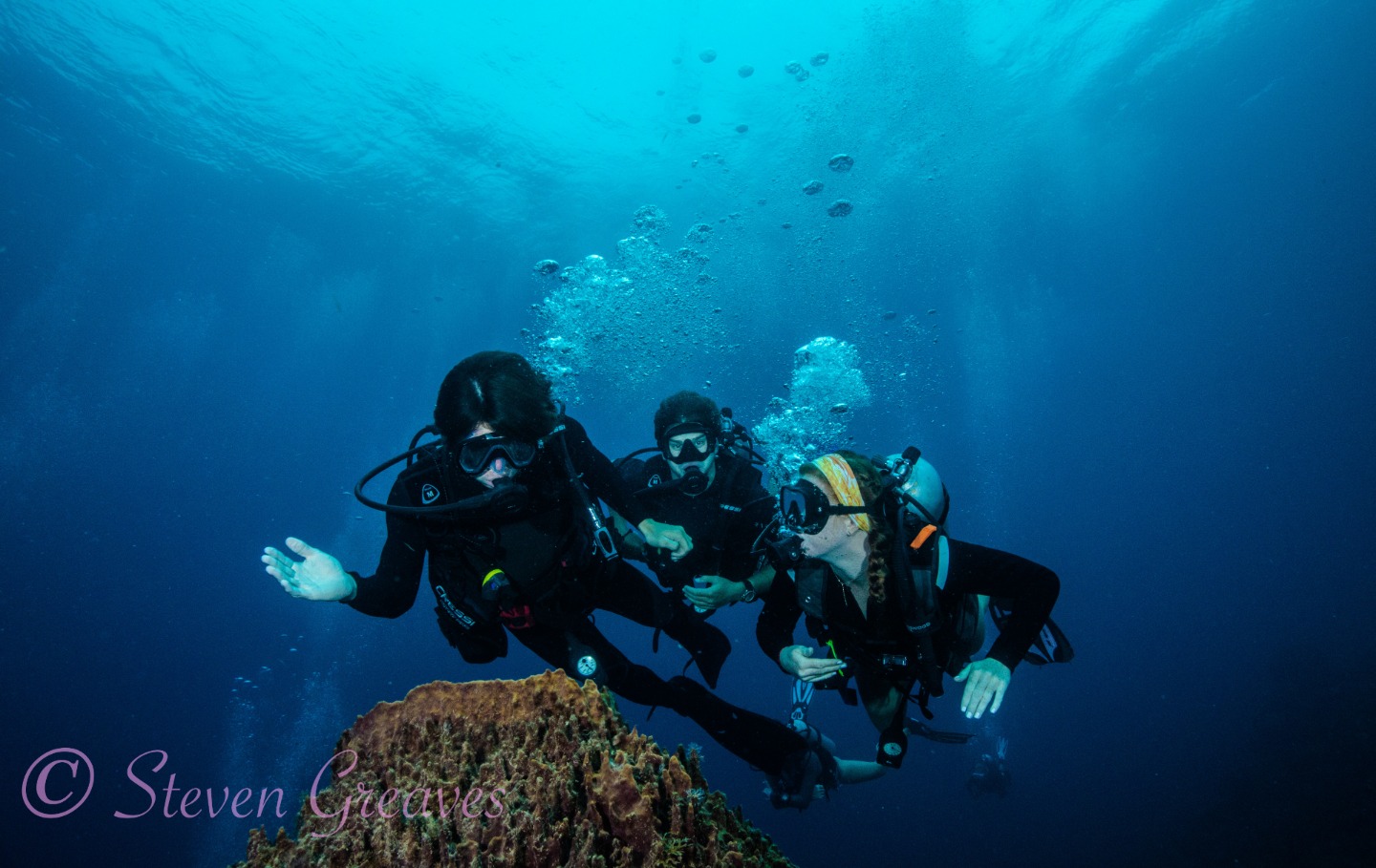 Picture 1: Henry, Celia, and Grady diving on a sponge