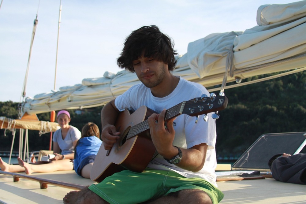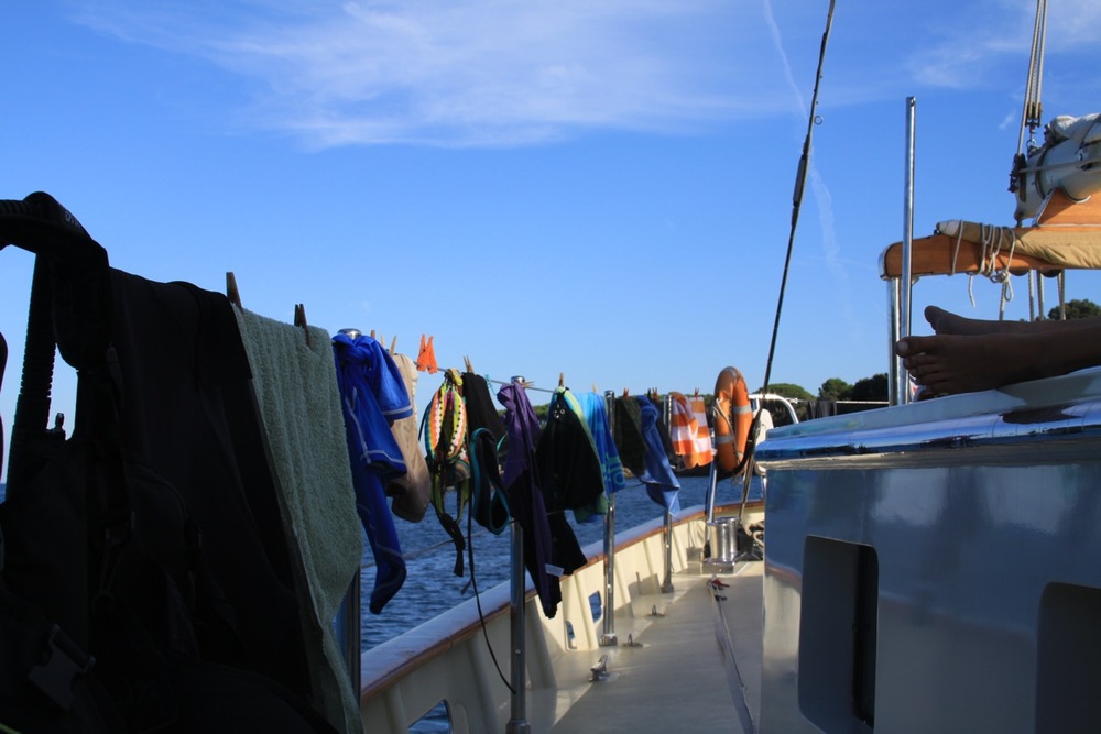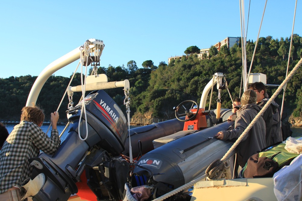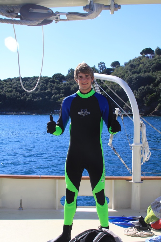 We were welcomed by a beautiful sunrise this morning and a delicious breakfast of pancakes. The scuba diving adventures continued today for the open water divers. With the cooperation of the calm weather, they are becoming more comfortable in the water with the gear and successfully picking up a new set of skills. A couple of lucky volunteers who are already dive certified (Willie and Doug with the help of Travis) got to set free some of the interesting sea life that has colonized the bottom of our vessel using handy dandy scrapers. Otherwise, the students enjoyed some free time onshore to lounge at the beach and satisfy their cravings for gelato. Back on board, James H. treated us to some sweet banjo tunes while Doug began teaching some of us a Southern-style of folk dancing called the shag. We ended the evening with introductions to oceanography (science rocks!!!) and student leadership classes before heading to bed for an early departure from Elba tomorrow.