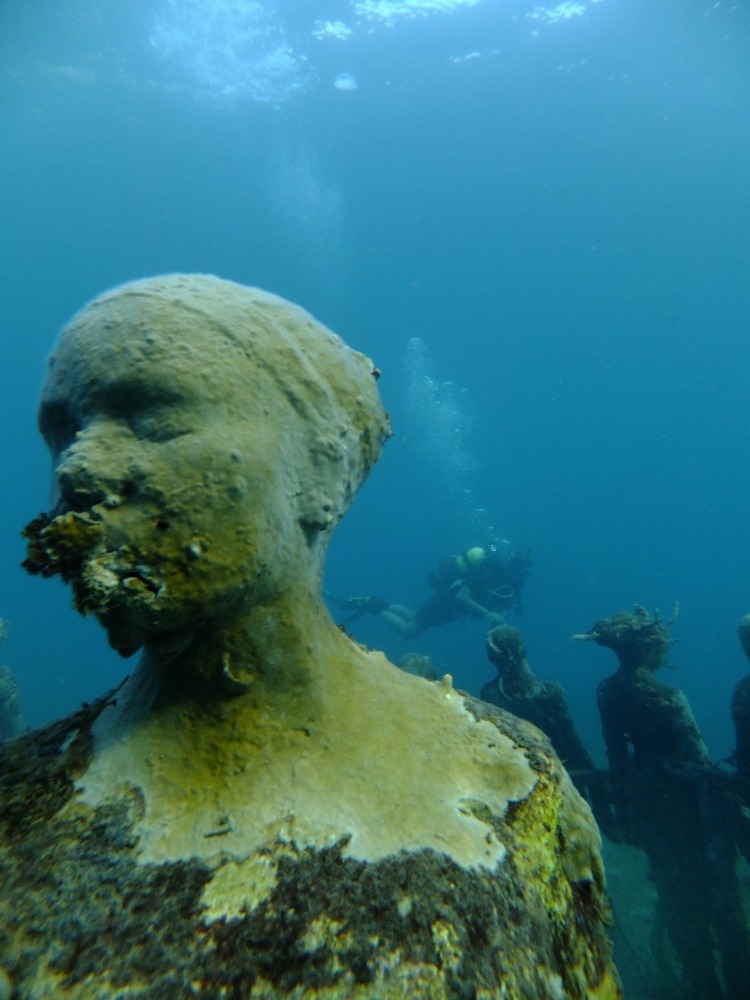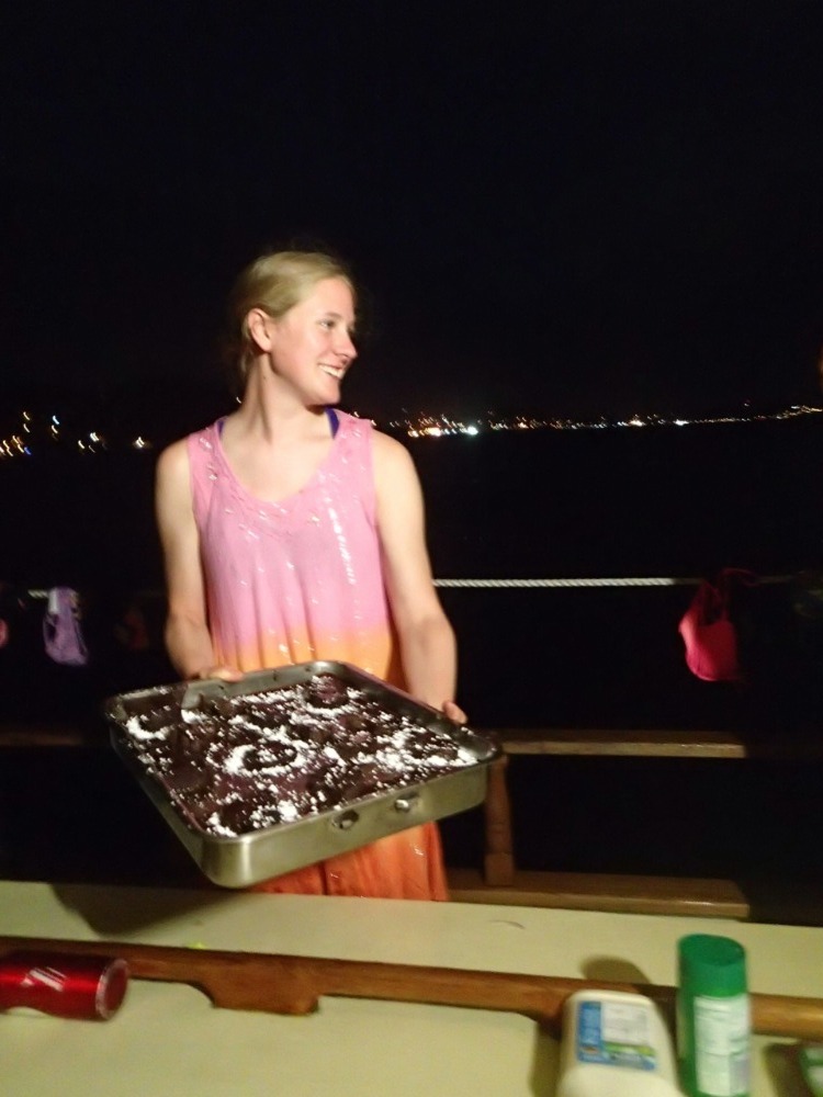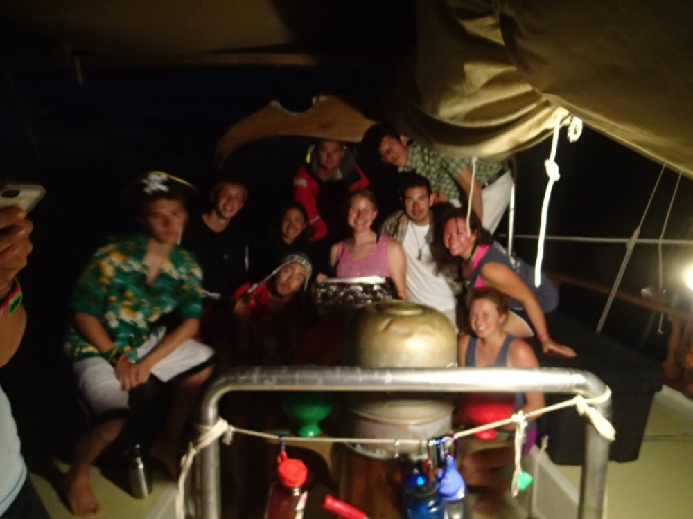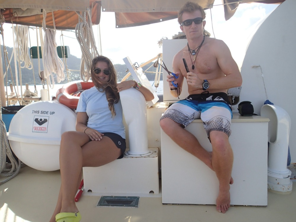 First off, Happy Valentine’s Day! Today, we moved from our dockside slip at Grenada Yacht Club. We went for a short cruise out of the harbor and headed North for the first time. After motoring for about a half-hour, we dropped anchor in Dragon Bay. Once anchored, preparation for our first dive began. The first dive was a deep dive to about 80 feet, which is the deepest any of the newly certified divers have been. Once at the depth, we played with eggs (when cracked open, they look kind of like jellyfish) and explored the properties of light and its effect on colors because blue light is the only color that penetrates water that deep, making things look blue or brown for the most part. The deep dive lasted all of about 10 minutes before we started to run low on air, which you use about four times faster at that depth. After the dive was complete, a long, lazy lunch began, giving us time to relax before our next dive. For the next dive, we went to an underwater sculpture park (see video), where we went on our first dive without a dive instructor. During the course of this dive, a Valentine’s Day couple was formed! Love must have been pumped into our tanks today because once back on Ocean Star, several more Valentine’s Day couples were formed before dinner. After a true feast, we finished it off with some wonderful Valentine’s Day cake masterfully prepared by Dana, which was a great way to finish the day. -Tucker