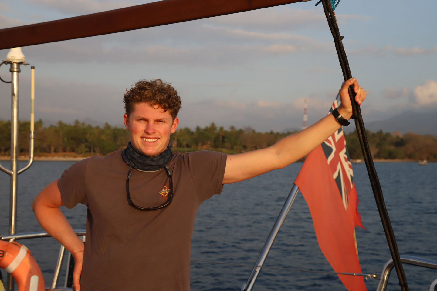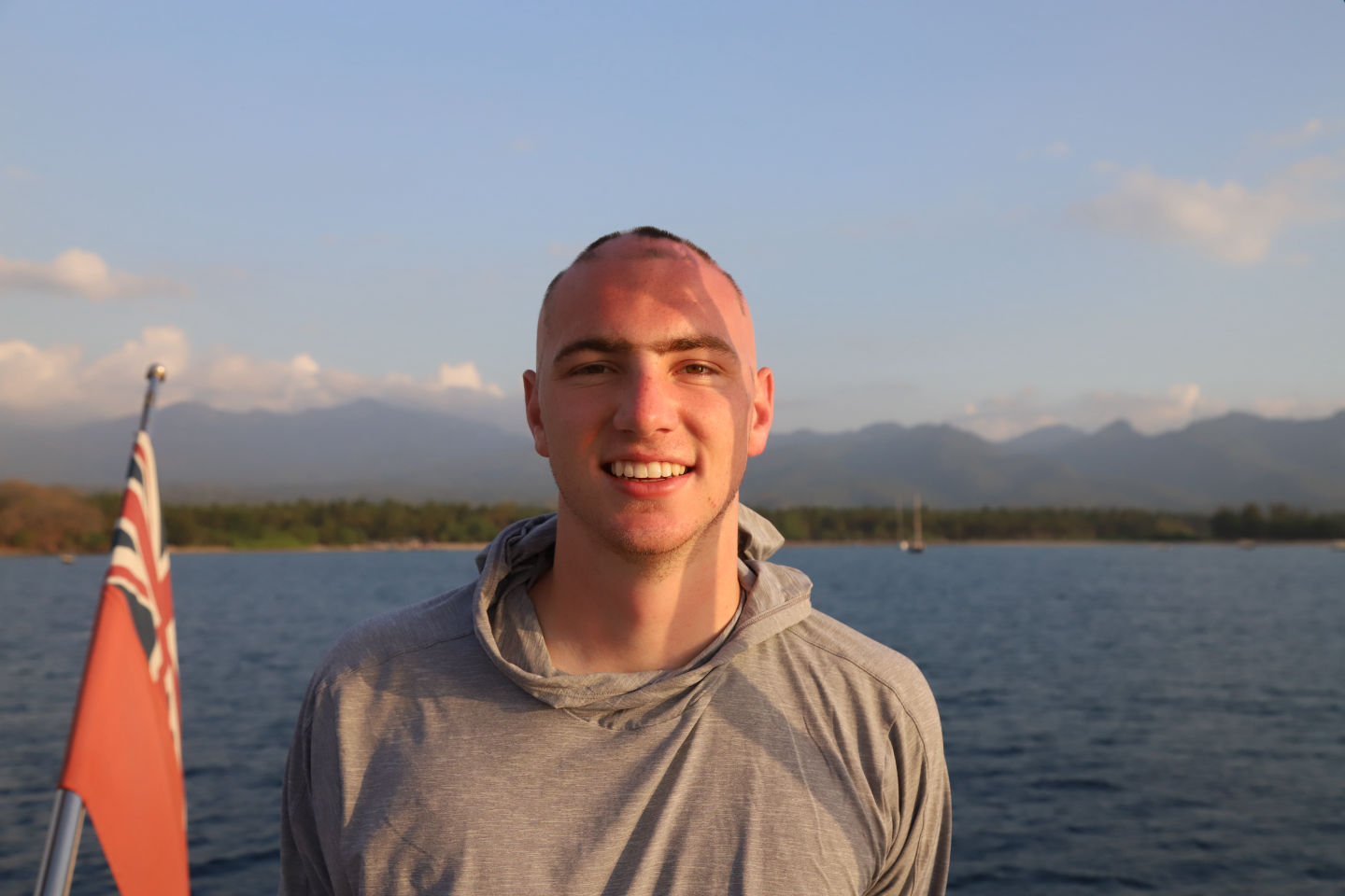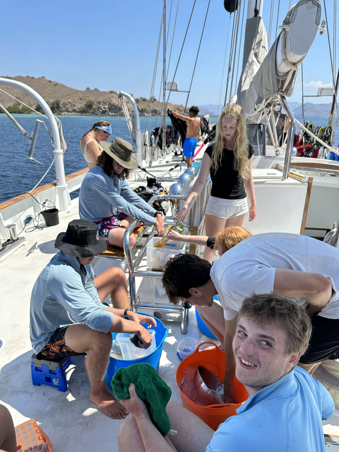 The day started (for some of us, at least) at a crisp 12 am, the first minute of the morning. I heard a very loud English accent exclaim, “OH MY GOD,” almost as if there was a danger ahead, only for it to be an epic shooting star distracting everyone’s attention. The rest of the watch consisted of chilling stories, the one sparking the most reaction being about people living inside of walls. At 4 am, after we were relieved, we hastily retreated to our beds to savor the remaining 5 hours of sleep promised to us. The sun woke me up early, which I originally thought to be unfortunate, but after poking my head out on deck, I was pleasantly surprised to see we were surrounded by not only water but new interesting landforms like I had never seen before. There were rolling hills with bright green forests dotting their beaches with a tiny but mighty-looking volcano in the background. The banana bread breakfast we had foreshadowed the mood for the rest of our day: very good. Those of us who were beginner divers completed our open water exams; some with flying colors, some not so much.