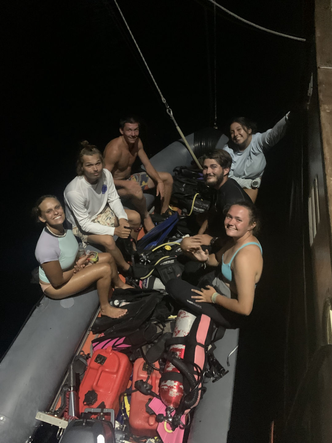Breakfast tacos this morning were the right way to start it off today before leaving for a deep dive excursion. The others and I had an amazing time being so far deep underwater (around 96ft) and seeing the different fish and sponges that live in those deep waters compared to the surface. I say that the experience was just breathtaking, from everything we saw to even just looking up from and seeing the bubbles that came out of every breath you took disappear. This will definitely be remembered forever as one of the top best things that I have ever done while being here on Ocean Star. Anyways, while we were diving, the rest of the students were studying, doing homework assignments, or collecting data for their research projects for oceanography. They were really focused and in the groove so well that I saw Carli in the exact same spot on the saloon bench when I got back from the dive; I’m not gonna lie, it was a bit scary. However, from all of us working hard in the morning, we sprung right into lunch, having a quinoa salad with some toppings like chickpeas and eggplant. With our bellies filled with deliciousness, we grabbed our books and headed right into Seamanship with Drew learning about how to use a VHF for the first time. It was really interesting learning what to say on the VHF and the different procedures with emergency calls compared to a ship-to-ship call. Later on, half and half dinner was prepared, and honestly, it was really great. The chefs did a wonderful job today in the kitchen, 10/10. We ended the day with the other group who were studying going on a night dive, which was pretty great. From what I heard, they saw many fish during their dive. Overall, today was a great day, and I’m so excited to see what happens next.