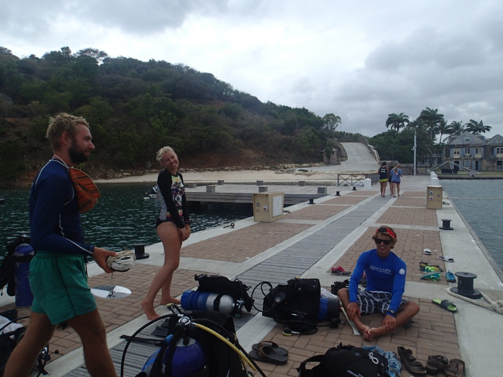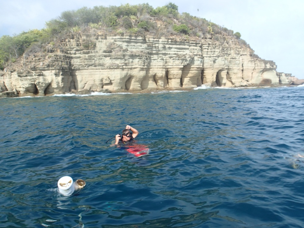 Today started with a stiff breeze blowing from the East, the last of a small depression that had been looking menacing in the Atlantic but turned out to be nothing more than a few showers, more breeze, and overcast days. After breakfast and cleanup, it was time to get all the open water divers certified and the navigation dives done. This was done against the stunning backdrop of Galleon Beach and further out the mighty “Pillars of Hercules.” These limestone pillars were caused by millennia of pounding surf and salty breeze coursing over the exposed headland. The result is not only the beautiful formations above water looming over the dinghy mooring but also under the waves where the large boulders have been dumped and deep ravines cut. Despite the earlier forecast, the Atlantic was forgiving, and the gentle swell provided a relaxing environment for the divers to become qualified. After a successful day underwater and a hearty dinner back onboard, Emma had a class on how formations such as the pillars came into existence. Needless to say, after a long day of diving and concentration, lights out were welcomed with open arms and closed eyes. Dreams of our continued sail south, with the wind on our beam and the sun on our faces, no doubt filled the minds of all those onboard. So ends this day.