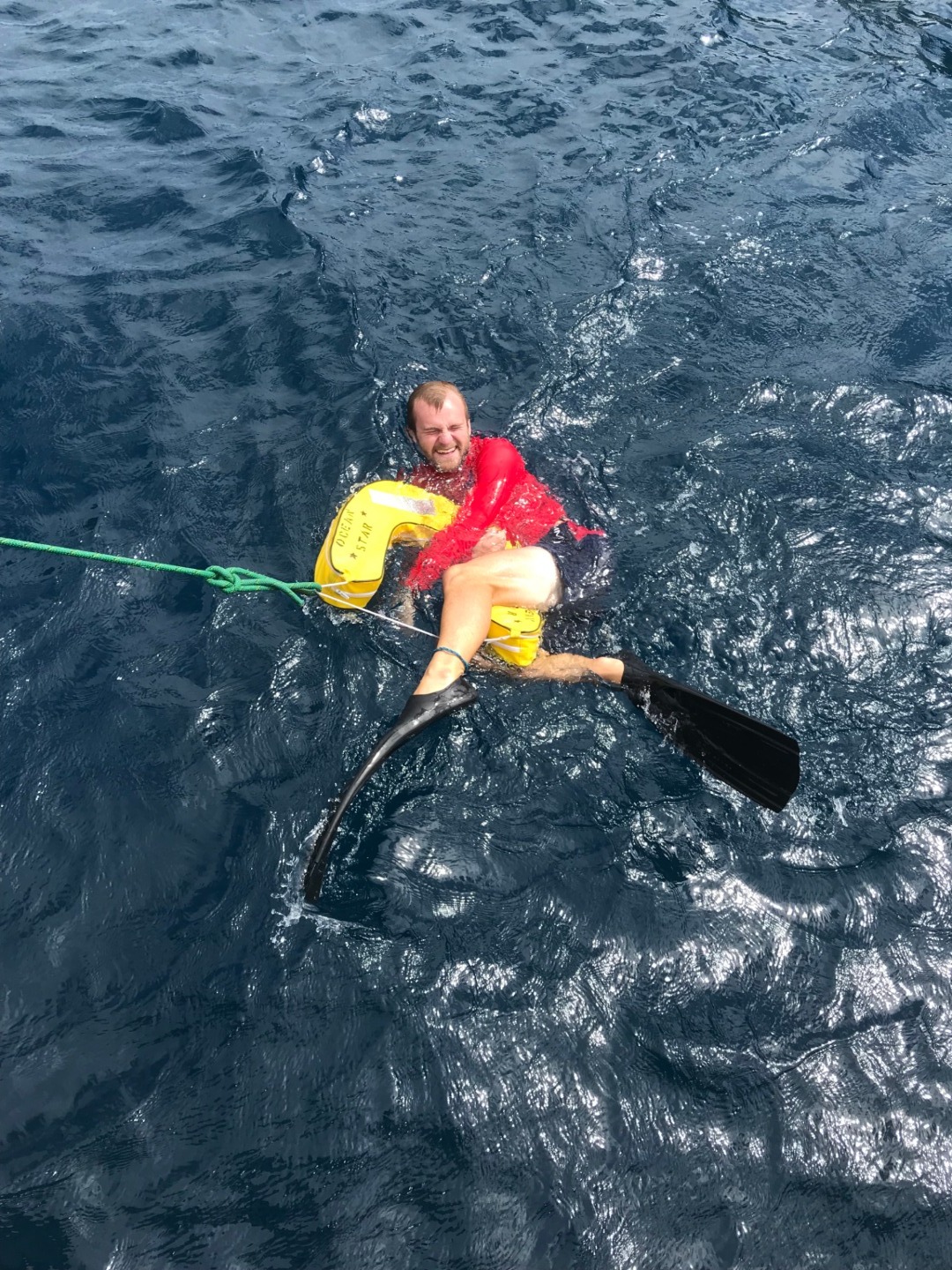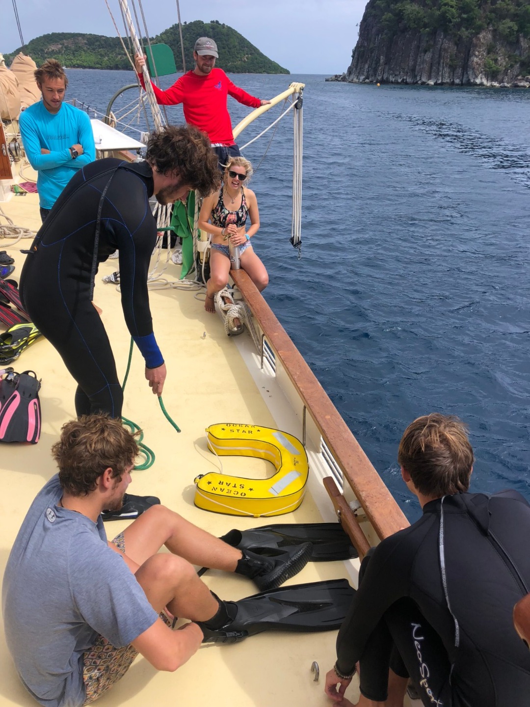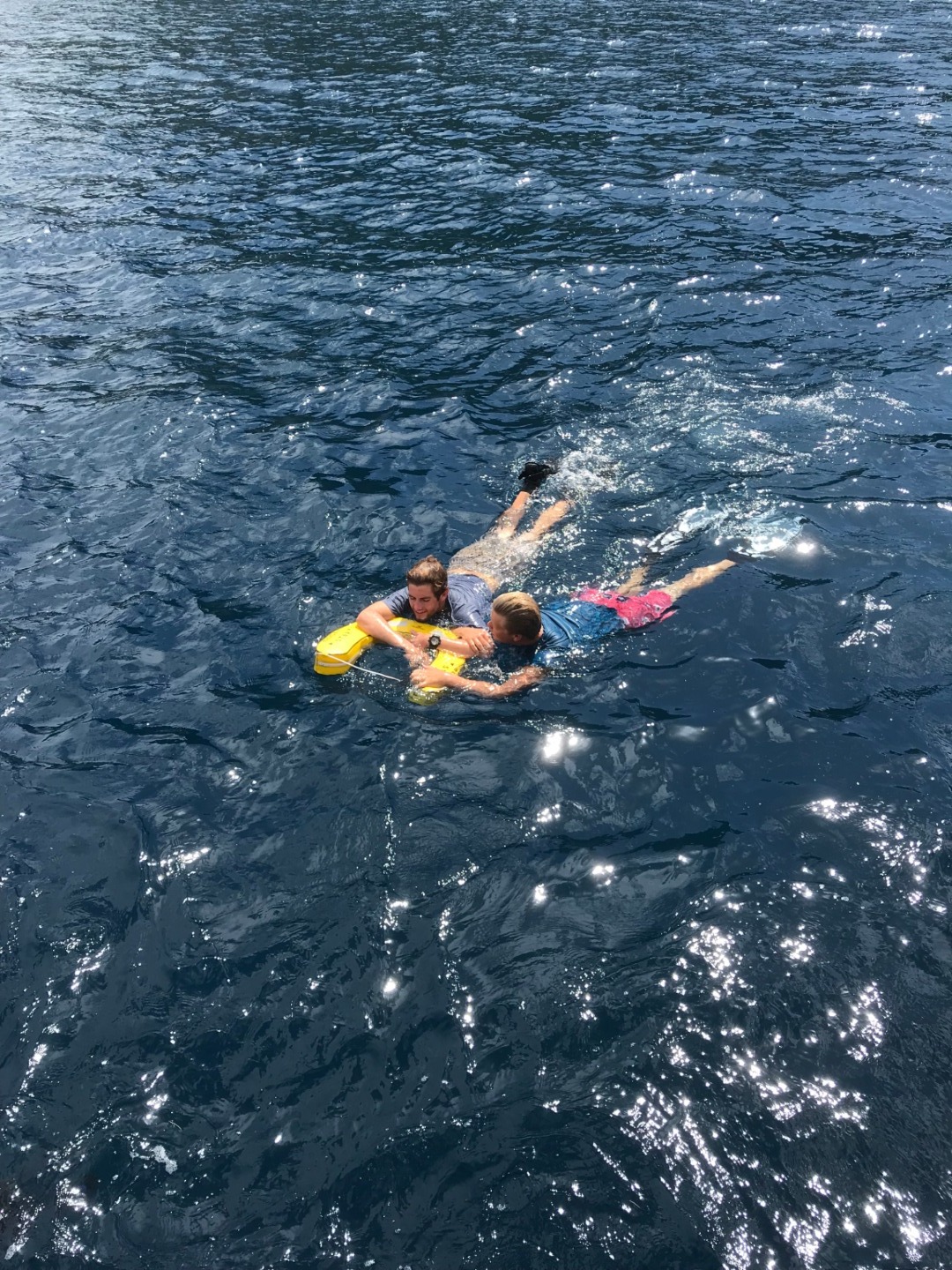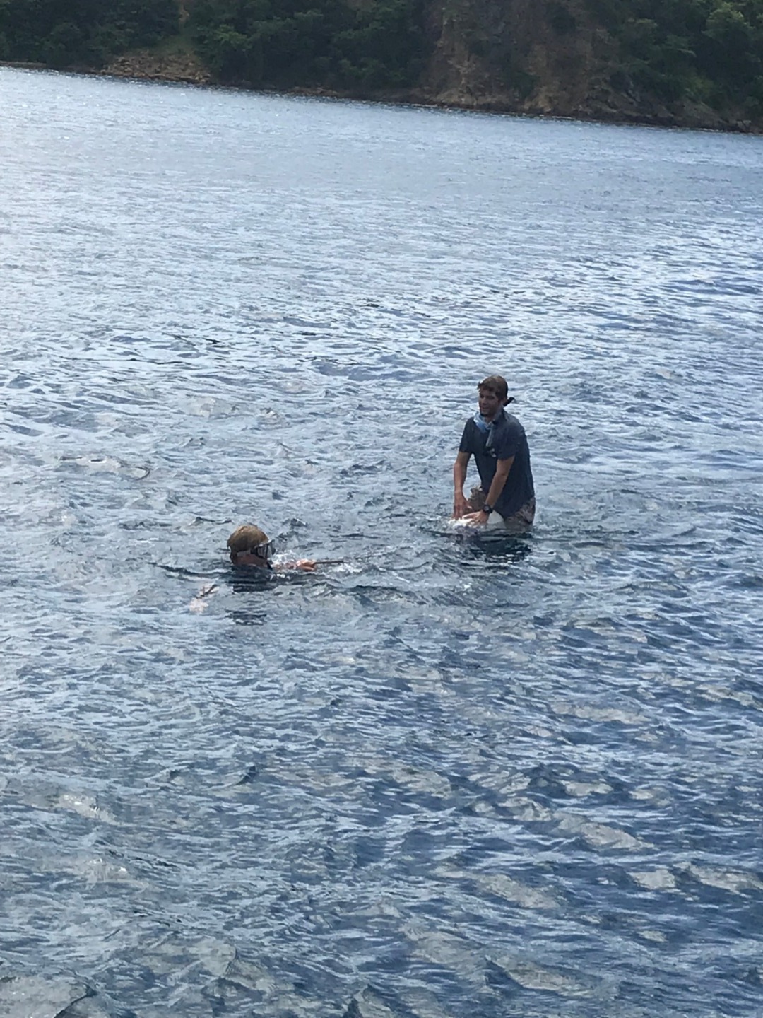 Those who wanted to complete their PADI rescue diver certification woke up early this morning to set up their scuba gear and load it into the dinghies. Amy and Amanda briefed us on what drills they had planned for the morning. I woke everyone else up at the usual 0700 wakeups, so we could all eat breakfast together, which was a lovely apricot turnover with a side of eggs prepared by Chef Matthew and his team. After breakfast and cleanup, the rescue diver group headed over to a nearby sandy beach to practice out-of-air, panicked underwater diver, and unresponsive underwater diver drills. We split up into groups of two, one of us acting as the distressed diver and the other acting as the rescuer. After returning to Ocean Star, we went over how to approach and manage a panicked diver at the surface using flotation equipment. Amy and Amanda tell us we’re the best rescue group they’ve had thus far.