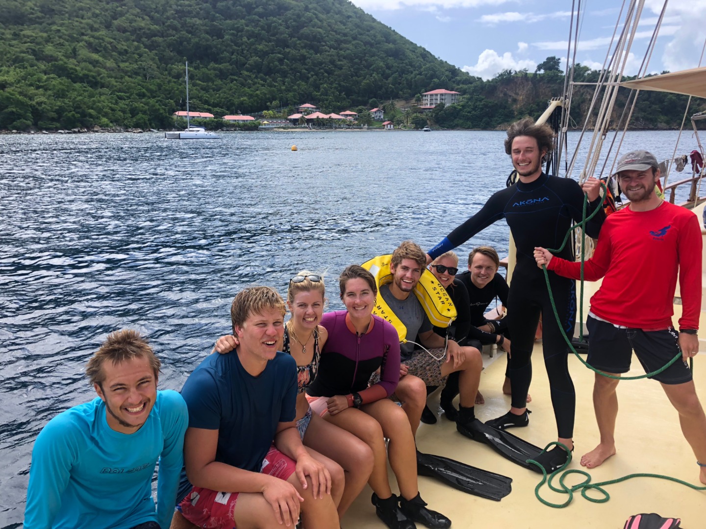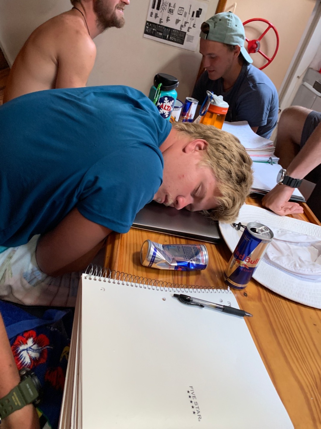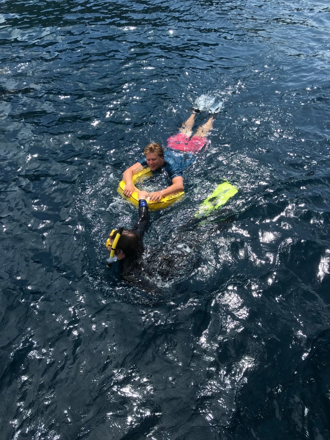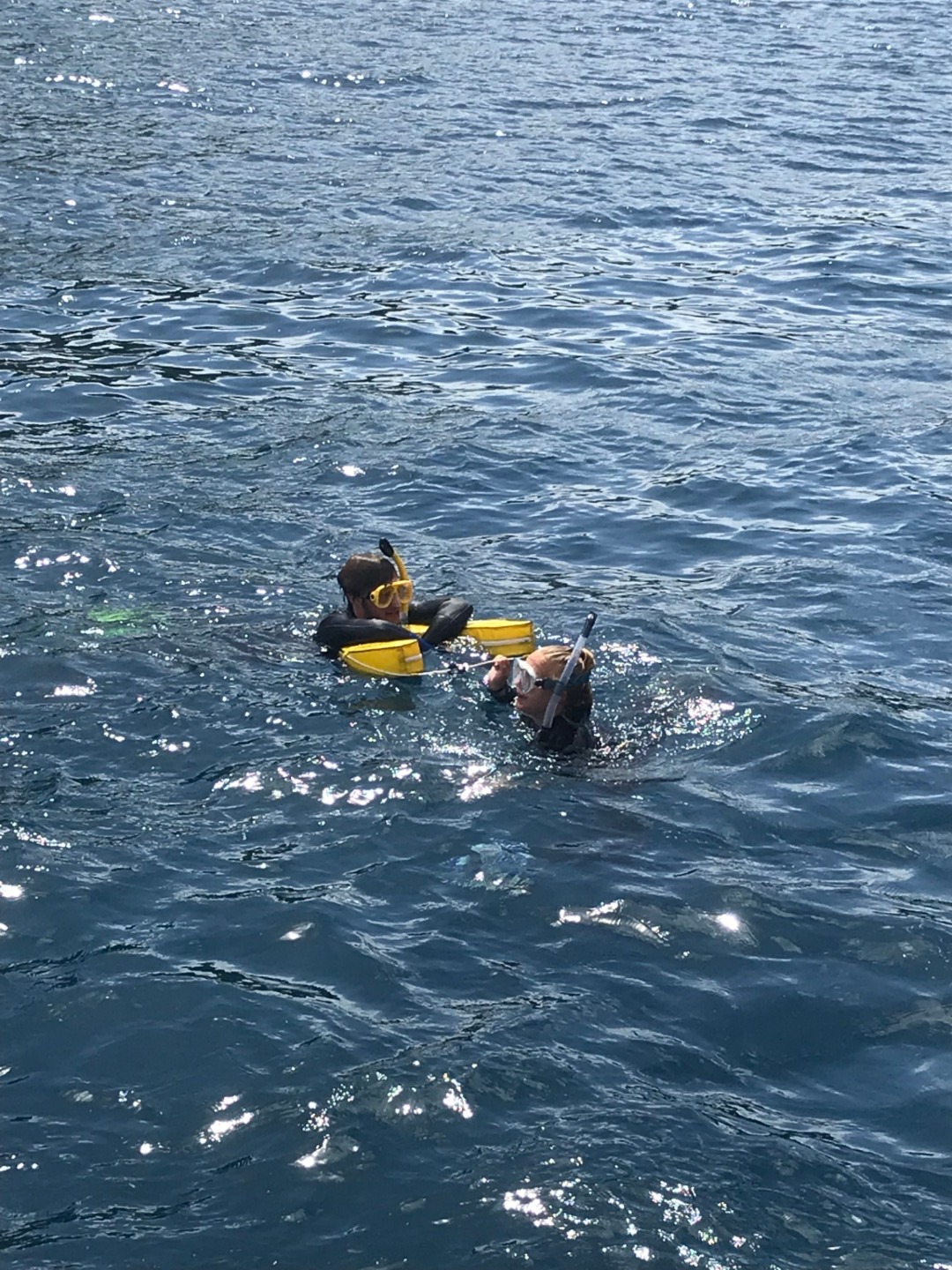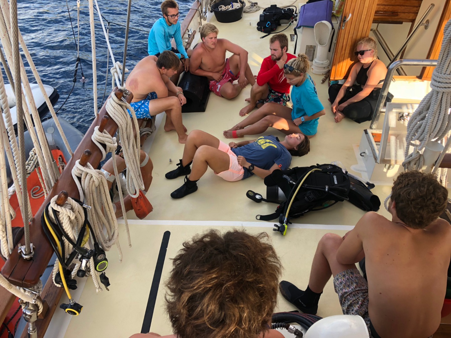 After lunch, the crew sat down for an oceanography class with Amanda, followed by a marine biology class with Amy. This was followed shortly by some more diving drills. We practiced module 7, which we will get to practice a few more times before we reach the scenario portion of the course. Module 7 features approaching a non-responsive/unconscious diver on the surface in full scuba equipment. All gear had to be removed while keeping the airway open, towing the victim back to the boat, and giving them rescue breaths at a consistent rate. The rescue group had a lot of fun with this, even though it was very exhausting in the strong currents. We then joined the others in shower time and headed into dinner. Matthew prepared a delicious chicken burrito bar, which we all scarfed down. As soon as dinner was over, we began the first part of our Emergency First Response training, which will earn us all our EFR certification that is valid for two years. In tonight’s lesson, we went over when to use our training, CPR procedure, and abdominal thrusts (No longer called the Heimlich). All in all, a lot of us had a big life-saving training day and were eager to get to bed. We also want to get some good sleep before our sunrise hike tomorrow!