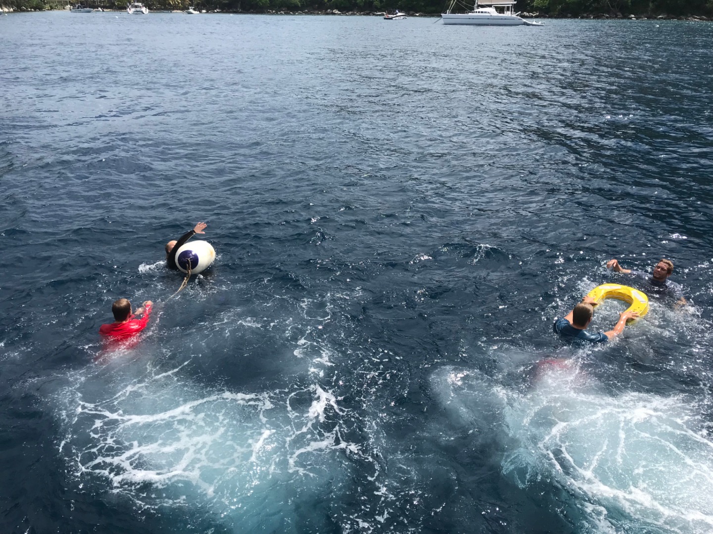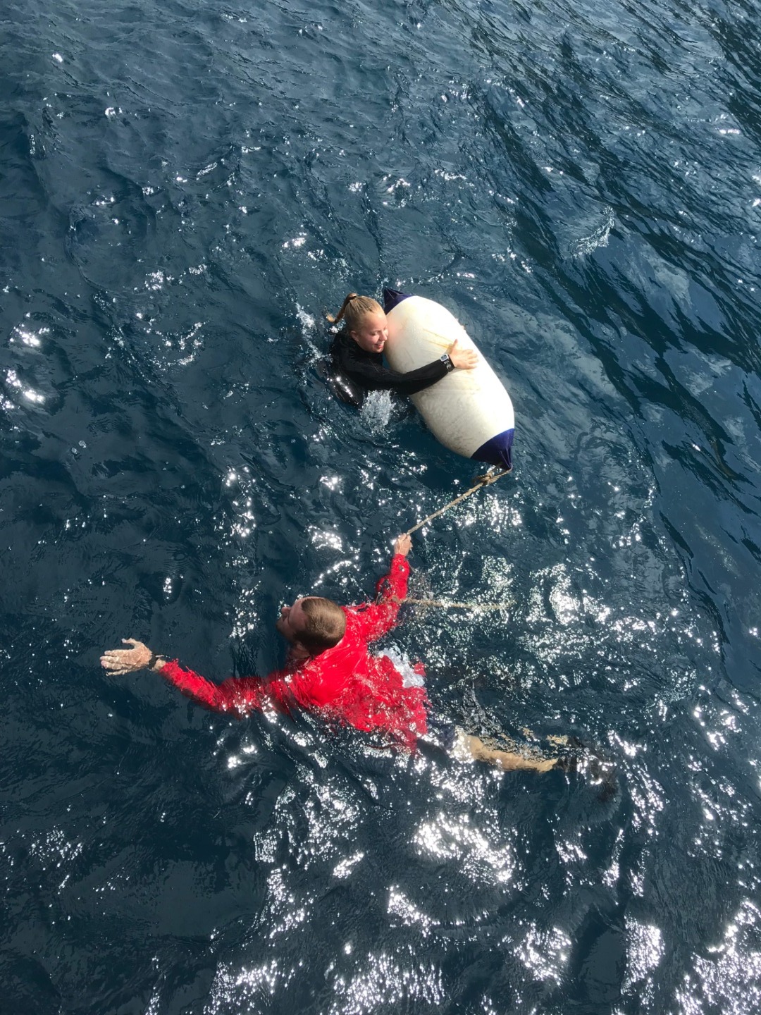Pictures: Rescue divers posing for a group photo, Joseph getting into character as a panicked diver, Nate tying a bowline to the flotation, rescue divers attempting to approach panicking divers; Joseph towing Jill back to the boat, Ridge and Steffen working on the panicked drill, Jill attempting to recover Nate, Steffen riding one of the buoys as he is being rescued, Nate rescuing Ridge, Beautiful harbor shot, Ridge feeling sleepy during study time despite Red Bull