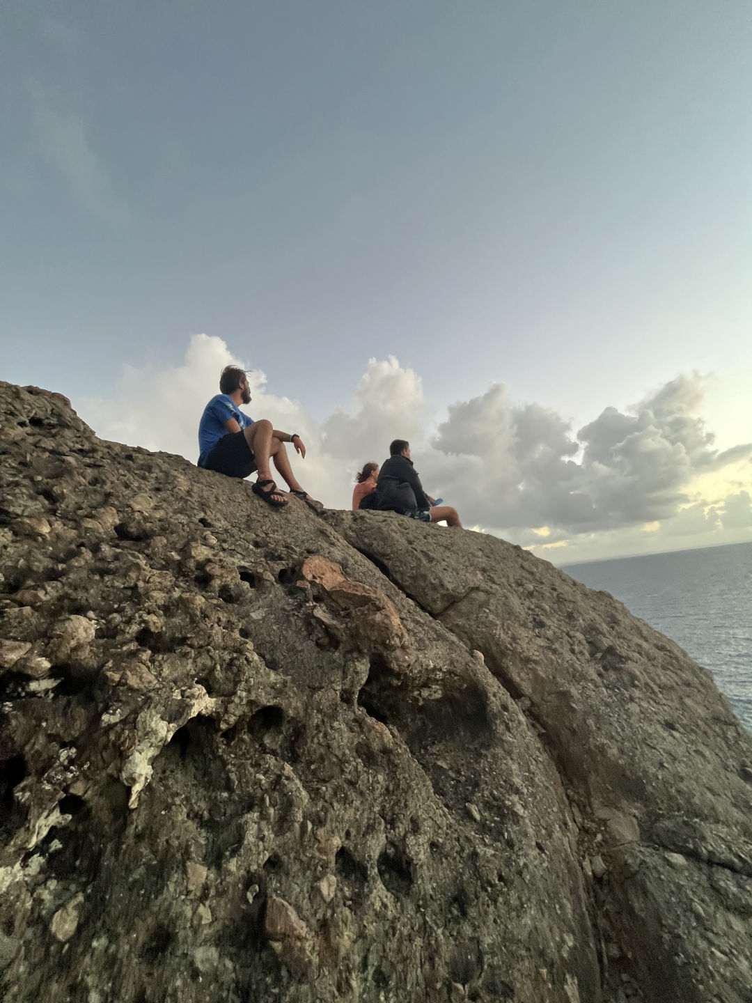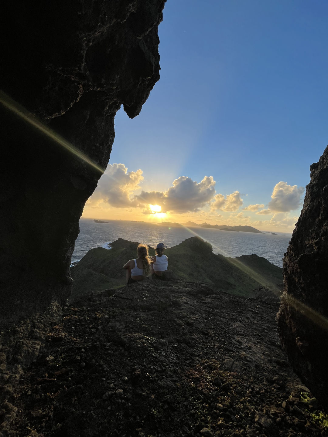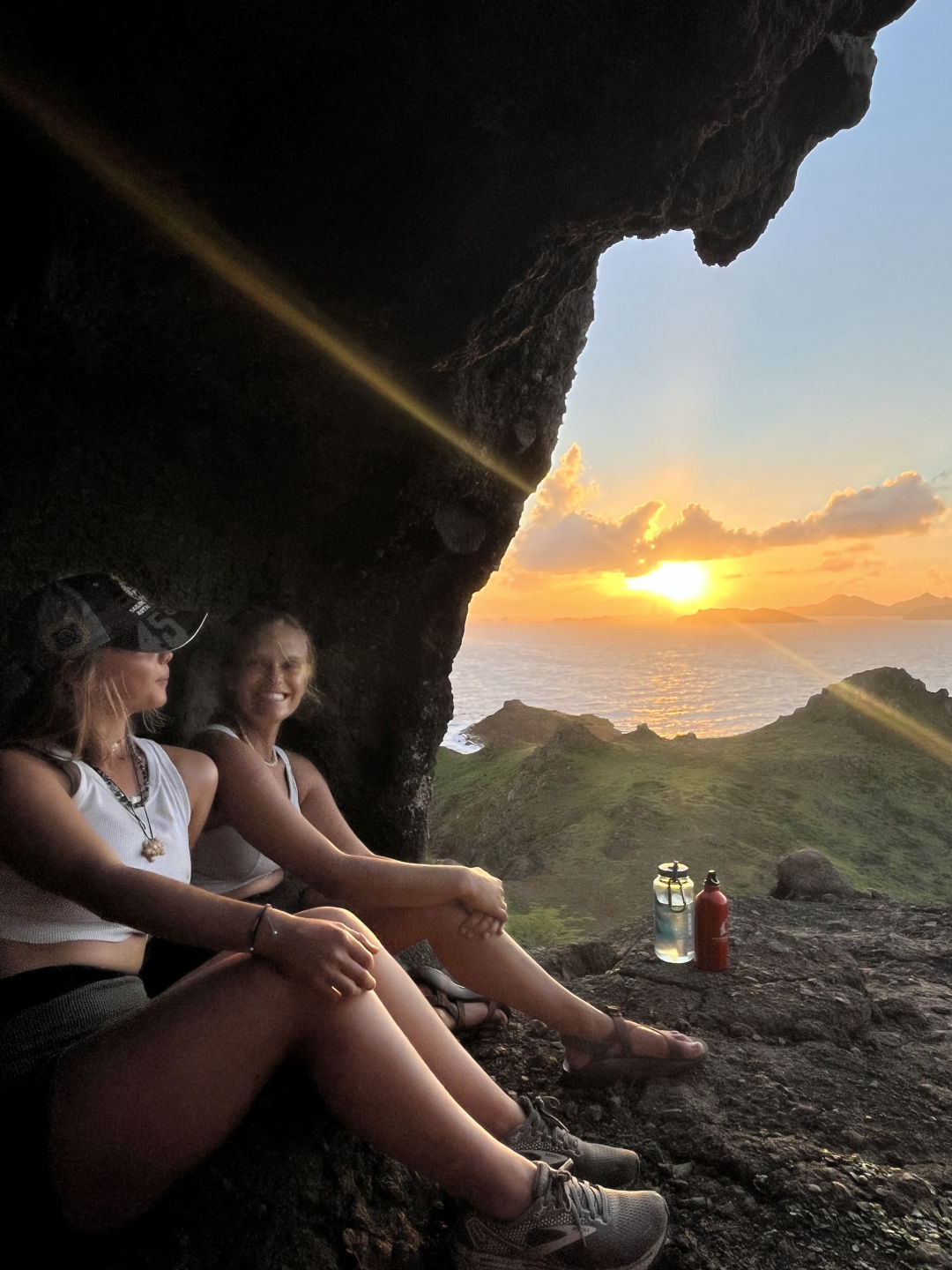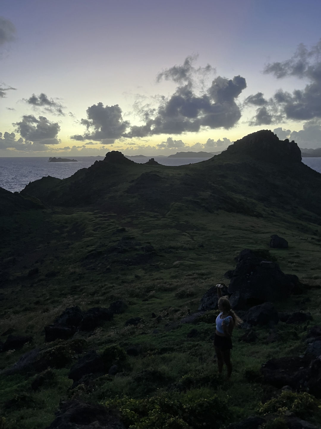 The day started for me at 5 am for another amazing sunrise hike in lle Fourchue. I filled my thermos with a hefty pour of instant coffee and grabbed my favorite hat with the hope of catching an amazing sunrise. I will definitely say the wet entry onto the beach took us all by surprise and definitely woke us up. The hike itself was stunning, and I really felt like I was in the Hobbit. The rolling green hills and fun rocky crevices made for great views, but I didn’t expect the path to be half rock climbing. This rock-climbing part most definitely contributed to a coffee-stained shirt, but it didn’t matter because, at the very top, KT, Carli, and I found the most perfect cave there ever was to enjoy the sunrise. We all agreed the cave would be a core memory for years onward– it was THAT special. I really appreciate Heather, who saved my new hat (bought in Les Saints) from flying off the top of the rocky peak and into the abyss. I almost had a heart attack as I watched my hat roll away from me in what felt like slow motion. When I lose a hat, a part of me goes with it. Anyways, the views were gorgeous, and I highly recommend the hike to anyone who has the opportunity to do it, especially during sunrise. After an amazing breakfast of egg sandwiches, we got started on our rescue diving course.